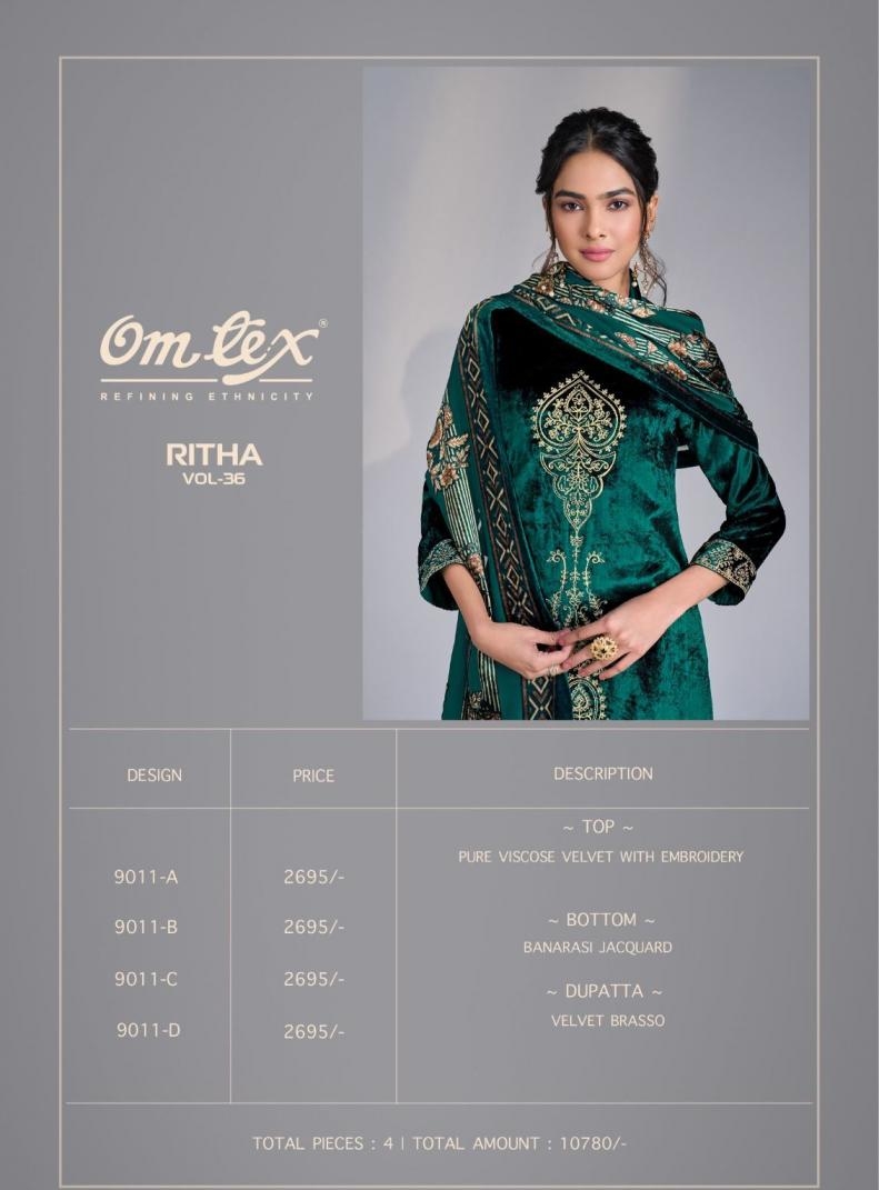 | Name: | Omtex Ritha Vol 36 Series 9011 A To 9011 D Viscose Velvet Winter Special Suit In Wholesale Surat |