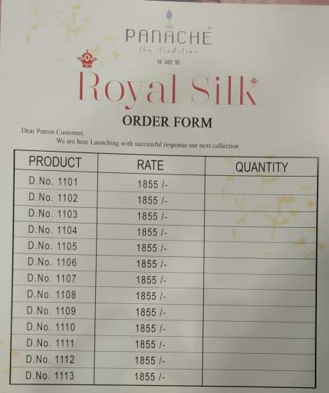 | Other Details: | Dear Customer, We are launching our new Saree Catalog Brand – Panache Catalog Name : Royal Silk Fabrics – SILK * Set to set * Rate 1855/- Pc – 13 GST 5 Percent Extra. Delivery 3-4 days Book your order now . |