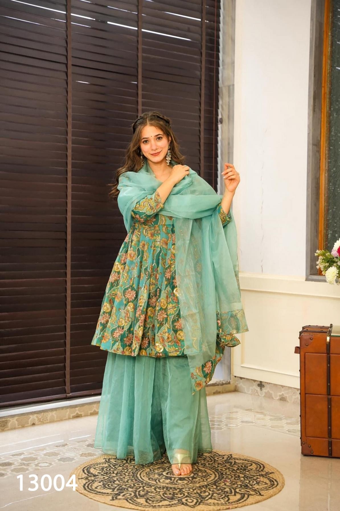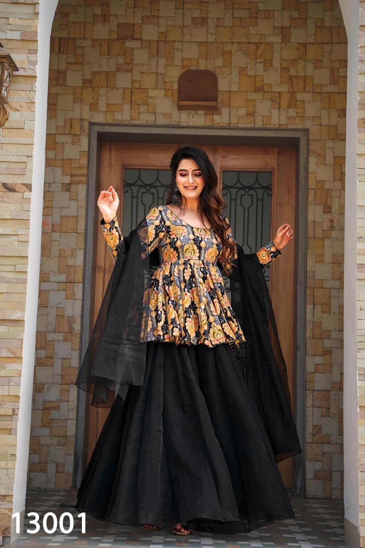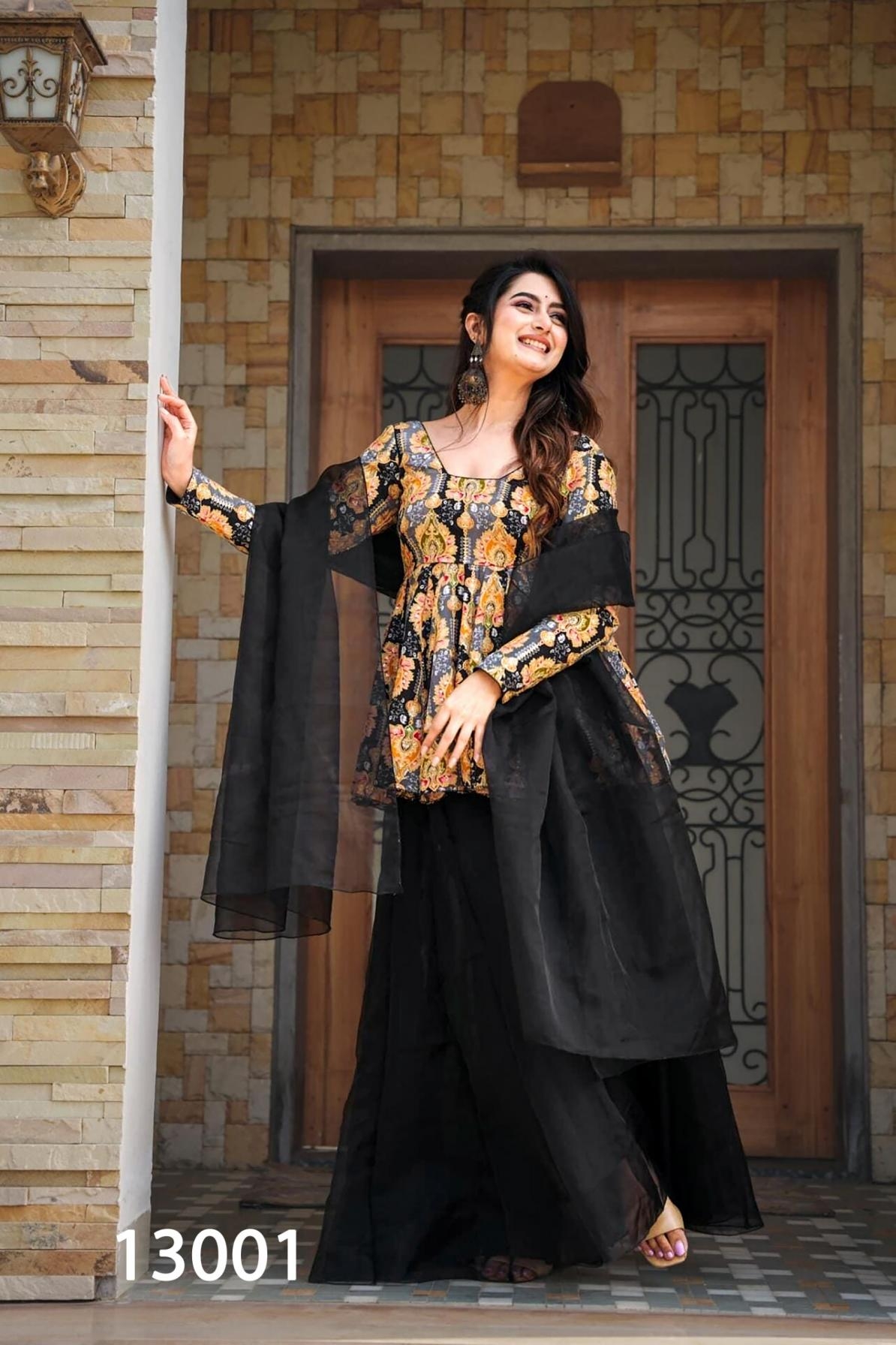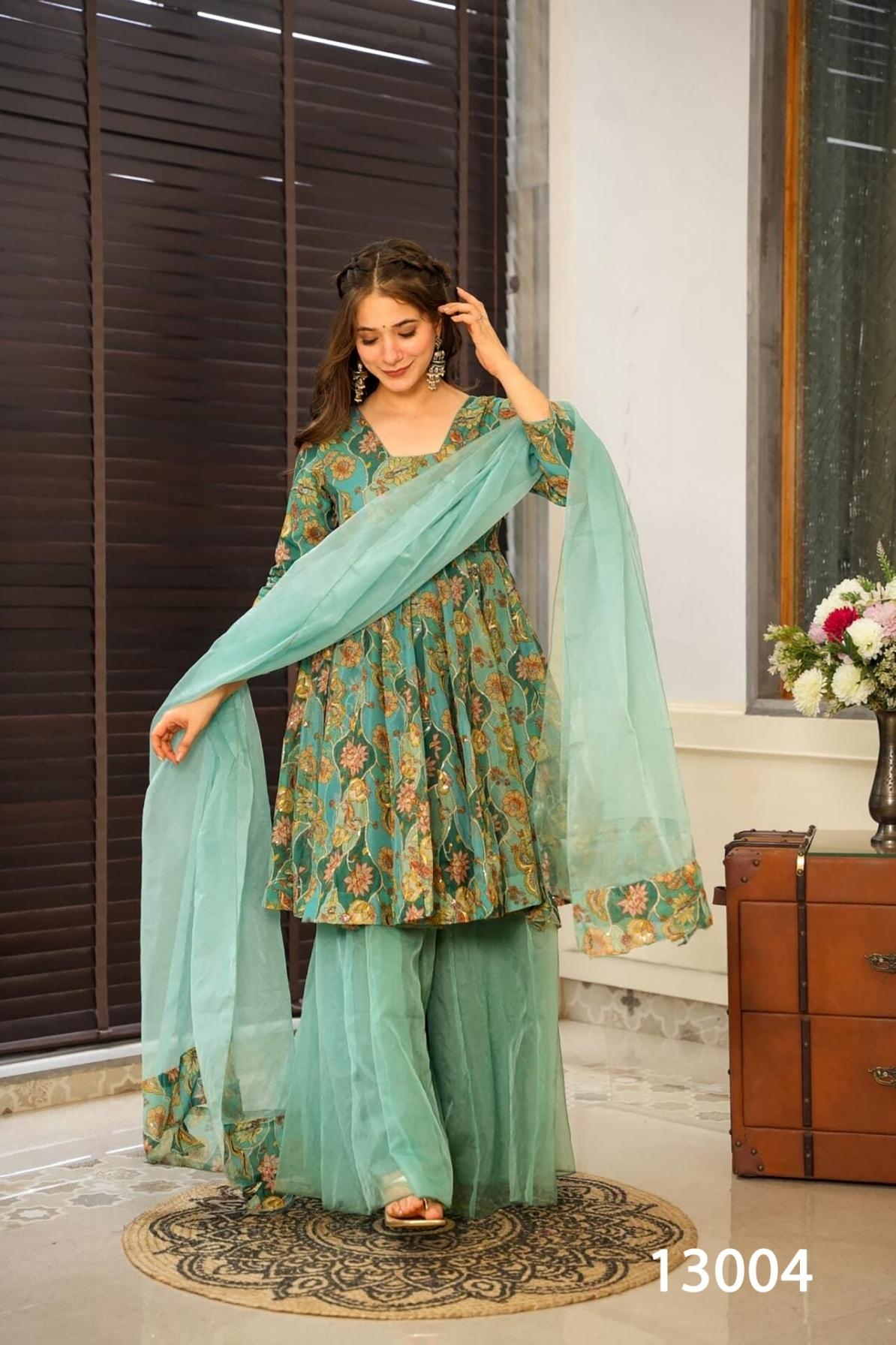 | Other Details: | Clora Vol 13 Introducing this stunning 3-piece printed top, Sharara set with dupatta collection (set of 4 beautiful design 13001 to 13004) Product details Pack Contains: 1 top,1 Sharara ,1 dupatta Top Fabric: silk with heavy digital printed Top length: - 33-36” Stitched type:- Full stitched , Full round flair, Size: XS(34),S(36),M(38),L(40),XL(42),XXL(44),3XL(46),4XL(48),5XL(50),6XL(52) Style:- 3 piece Attractive Sharara Suit Occasion:- Festival Wear, Function, Ceremonial, Wedding Wear, Party Wear Note: - 10-12% Colour variations may occur due to different screen resolutions RATE: - 1299/- GST :- 5% |