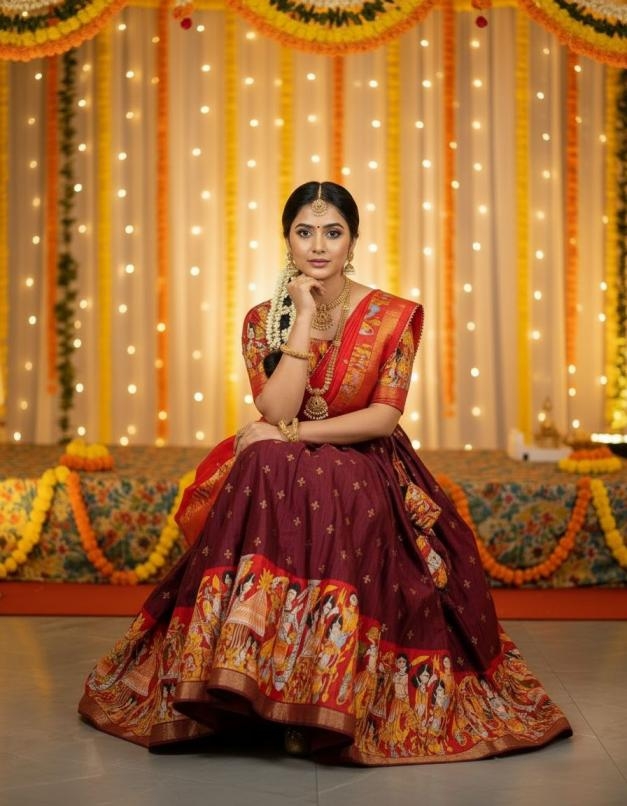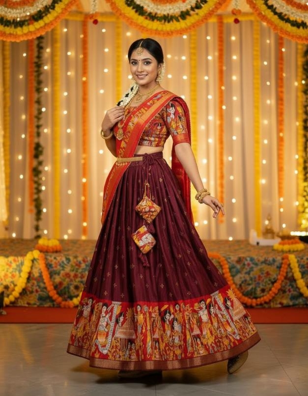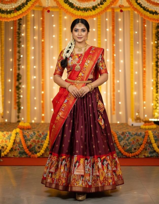 Look attractive wearing an Indian Kathak Kalamkari highly popular lehengas. Light and Dark Beautiful Contrast Matching Colors✨🌸