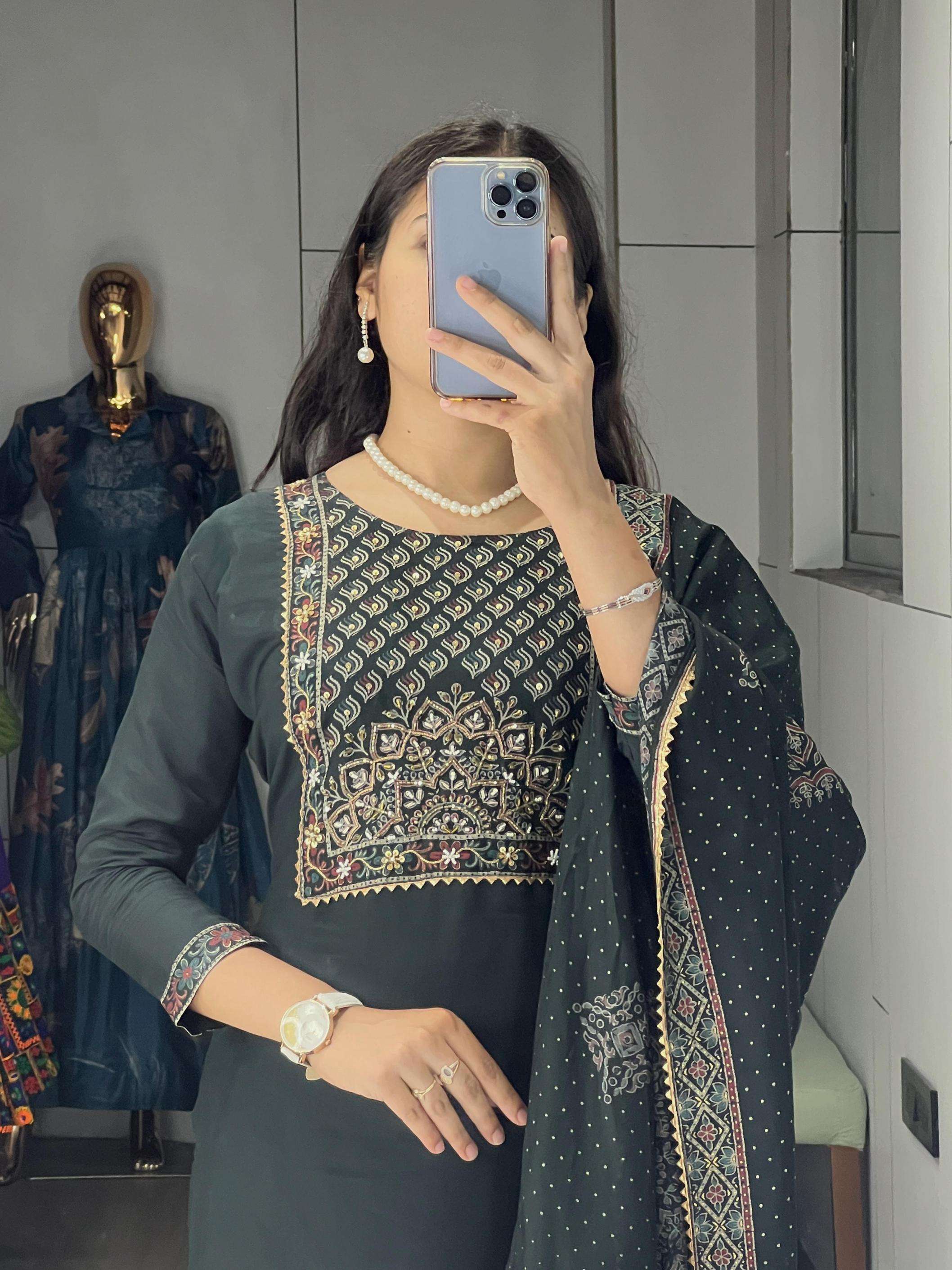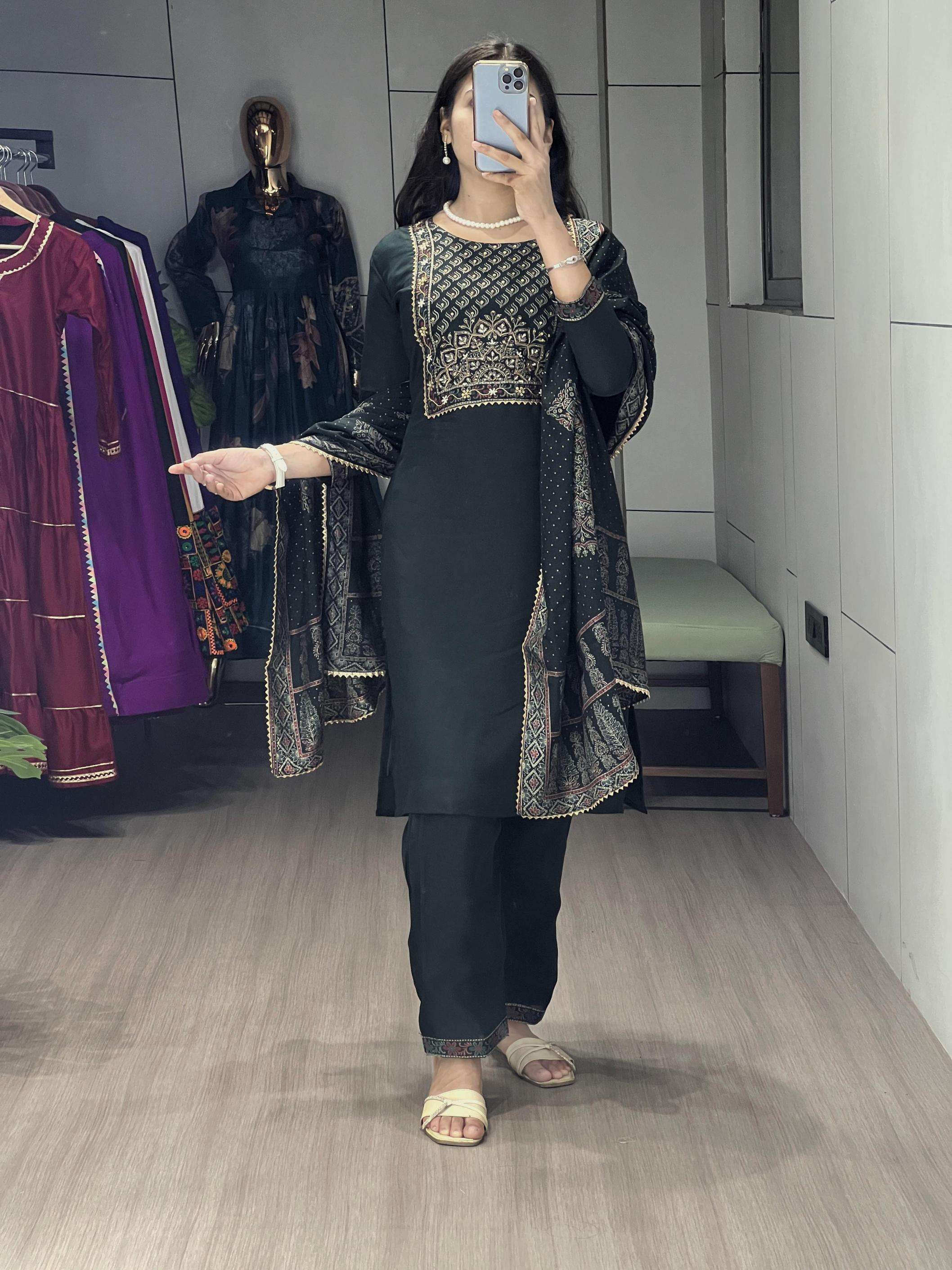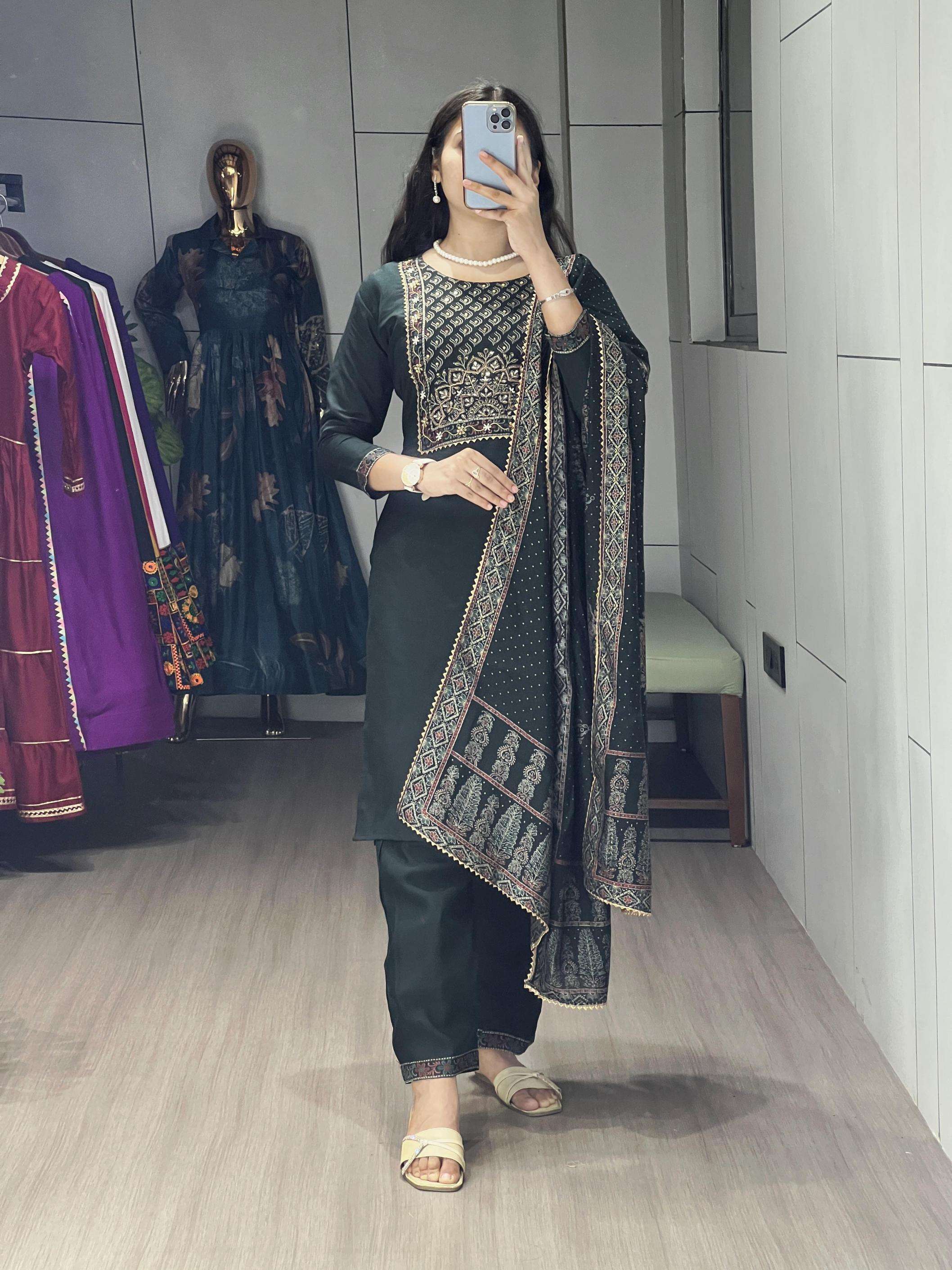 | Other Details: | Pure Modal Chanderi Kurti Pair with Foil Print and HandWork👜 A perfect pick for special occasions, this 3-piece set having foil prints, With Hand Work Comes complete with a matching dupatta and comfy bottom wear.✨👜👌🏻 GRTN8114DRKZGRN