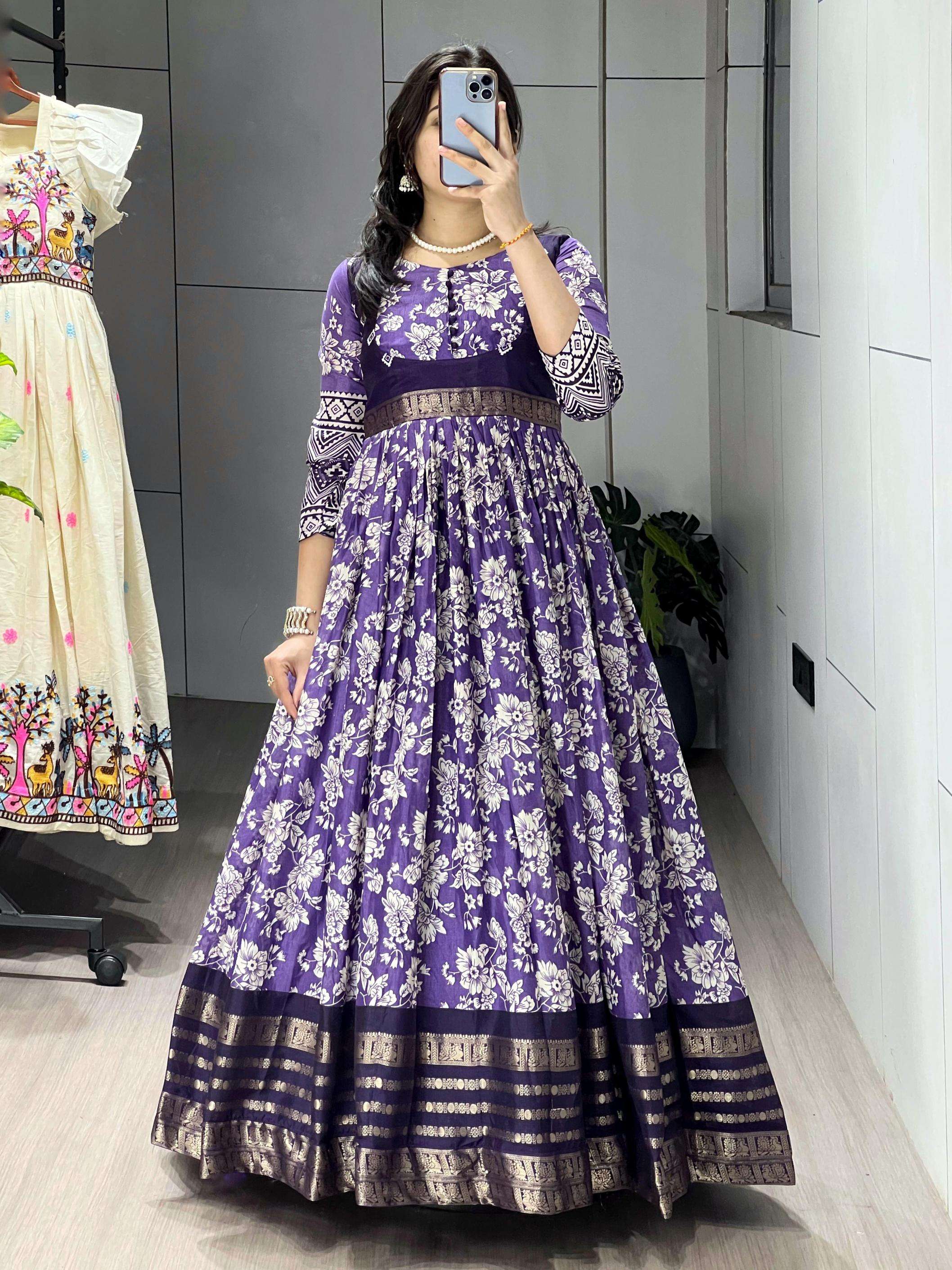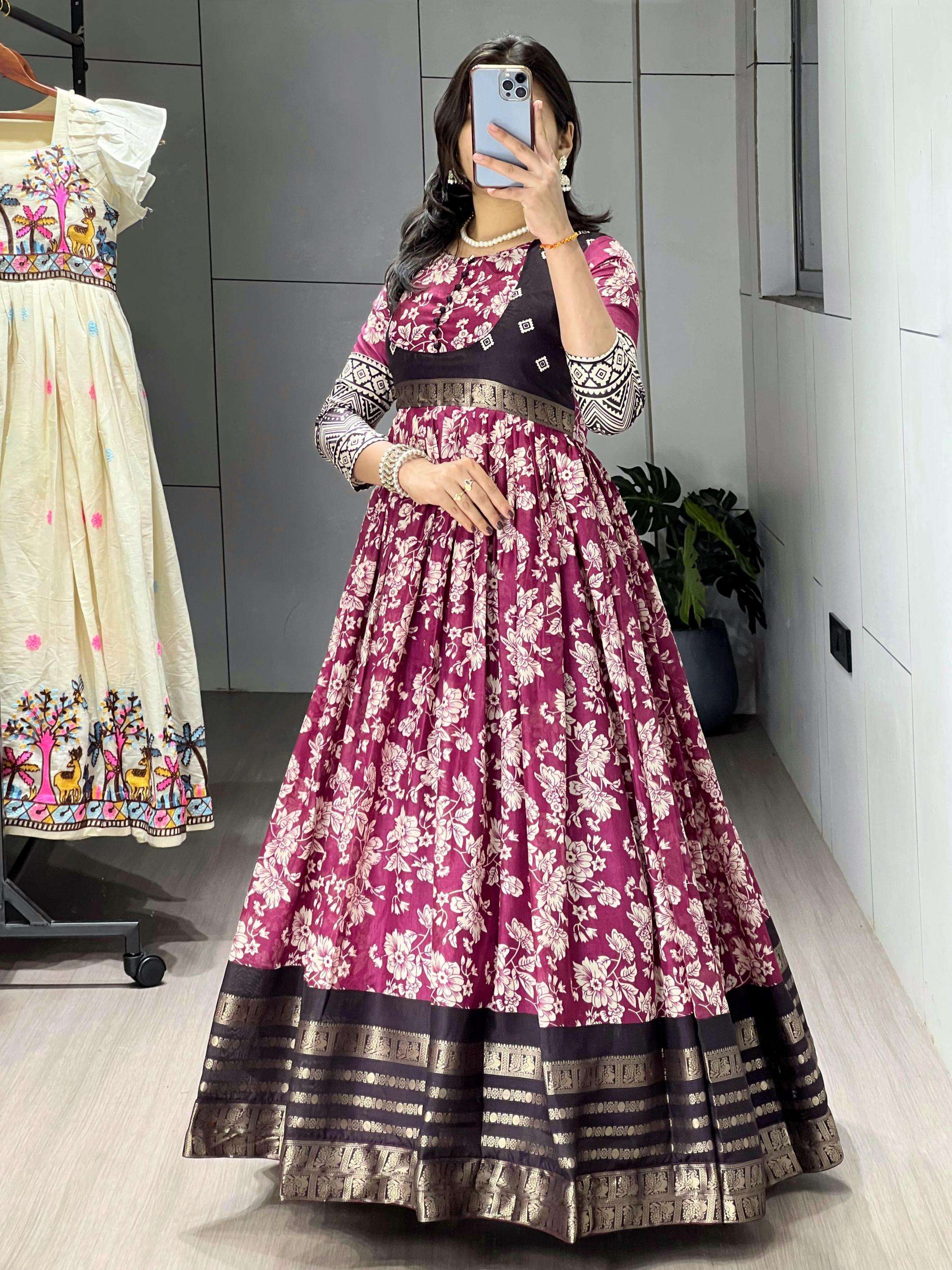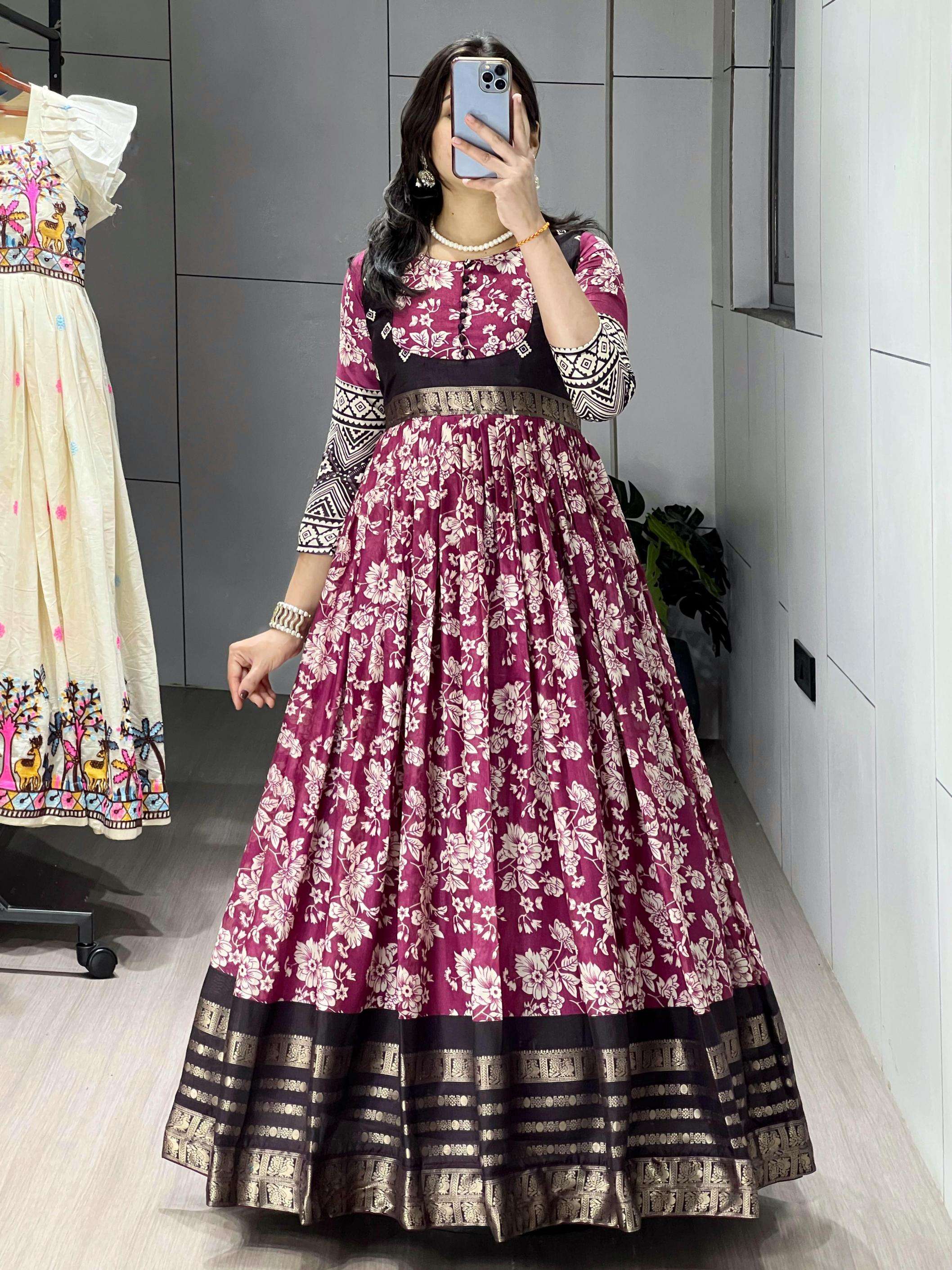 | Other Details: | Latest Trendy Floral Gowns👜 Graceful Kalamkari silk gown paired with a rich jacquard patta for an elegant festive look! Celebrate in style with this beautifully designed Latest silk gown. ✨