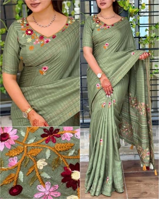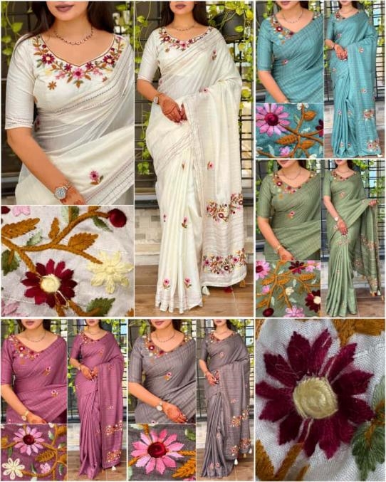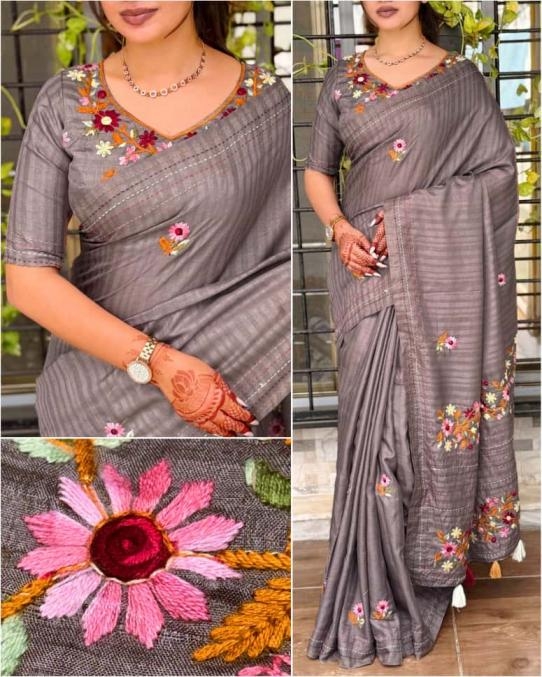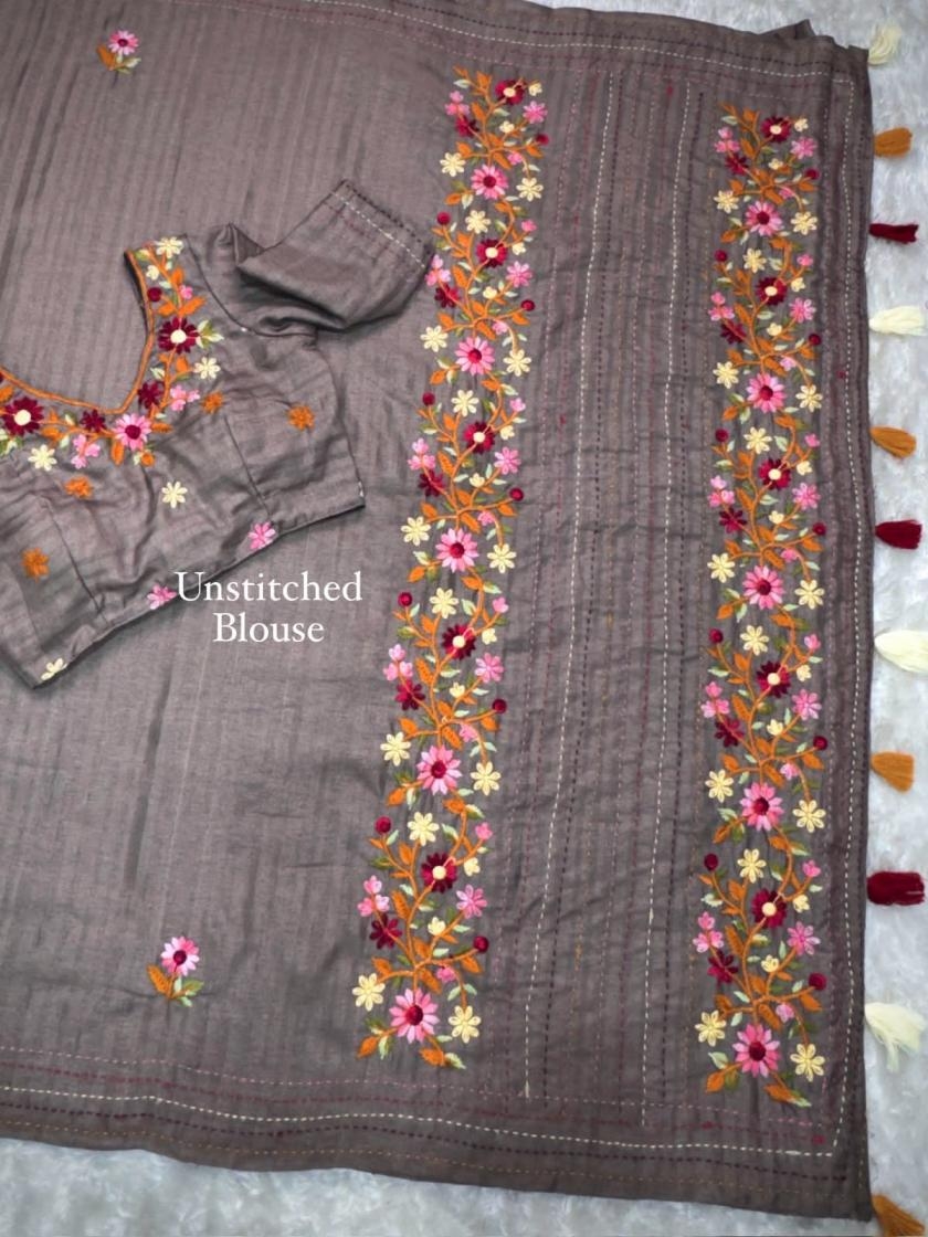 | Other Details: | Design-kashmiri Wrapped in the poetry of heritage, this tusser cotton saree is where tradition meets pure grandeur. The rich tusser saree glows with fine thread kashmiri style Embroidery Fabric- SIZE- Pattern- Notice Saree embroidery is made from pure cotton thread, so, normal thread snag is common in saree embroidery. RATE : 1500/- +GST |