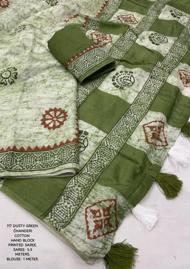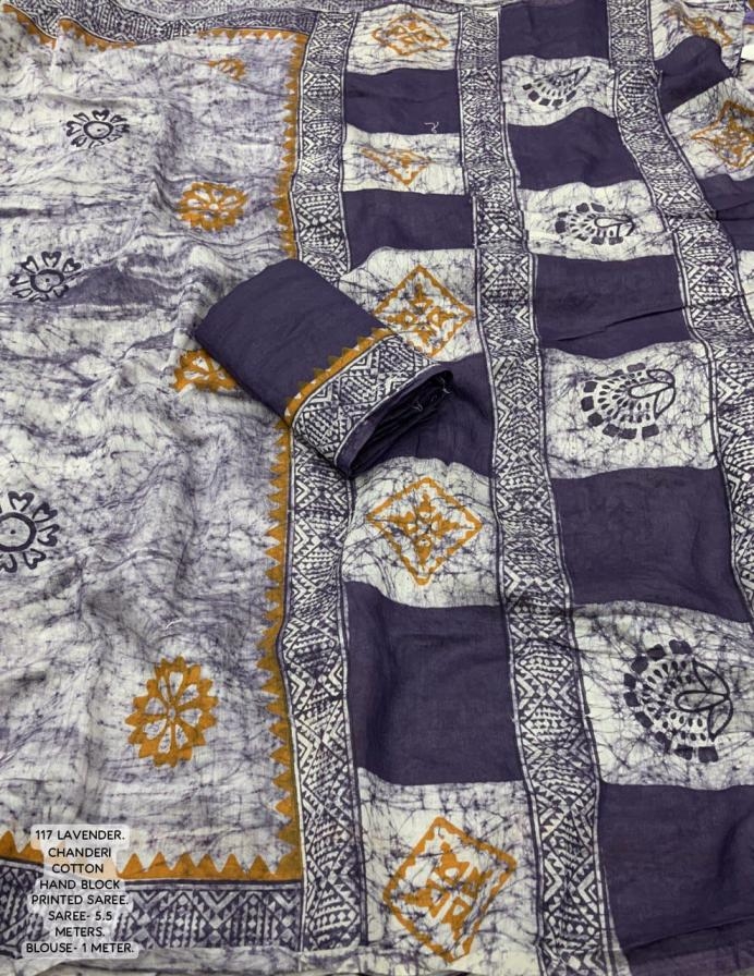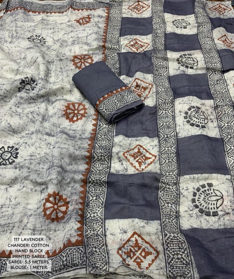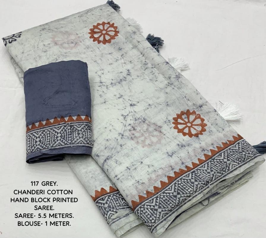 | Other Details: | new arrivals Hand block printed spray style cotton saree. KC -117 Quality- soft chanderi cotton saree with hand-block prints. Tassles on pallu. Blouse- contract block printed chanderi cotton blouse. Rate - 1050+ship