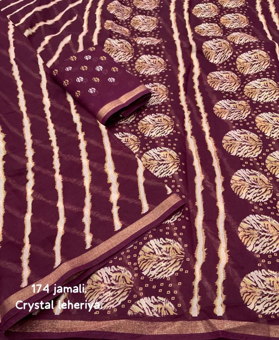 | Other Details: | New cotton style leheriya saree kc - 173 kc - crystal leheriya. Quality- soft cotton feel saree light weight with zari woven pattu. Leheriya prints. Blouse- seperately printed running blouse. Rate - 450+ahip Top trusted quality |
