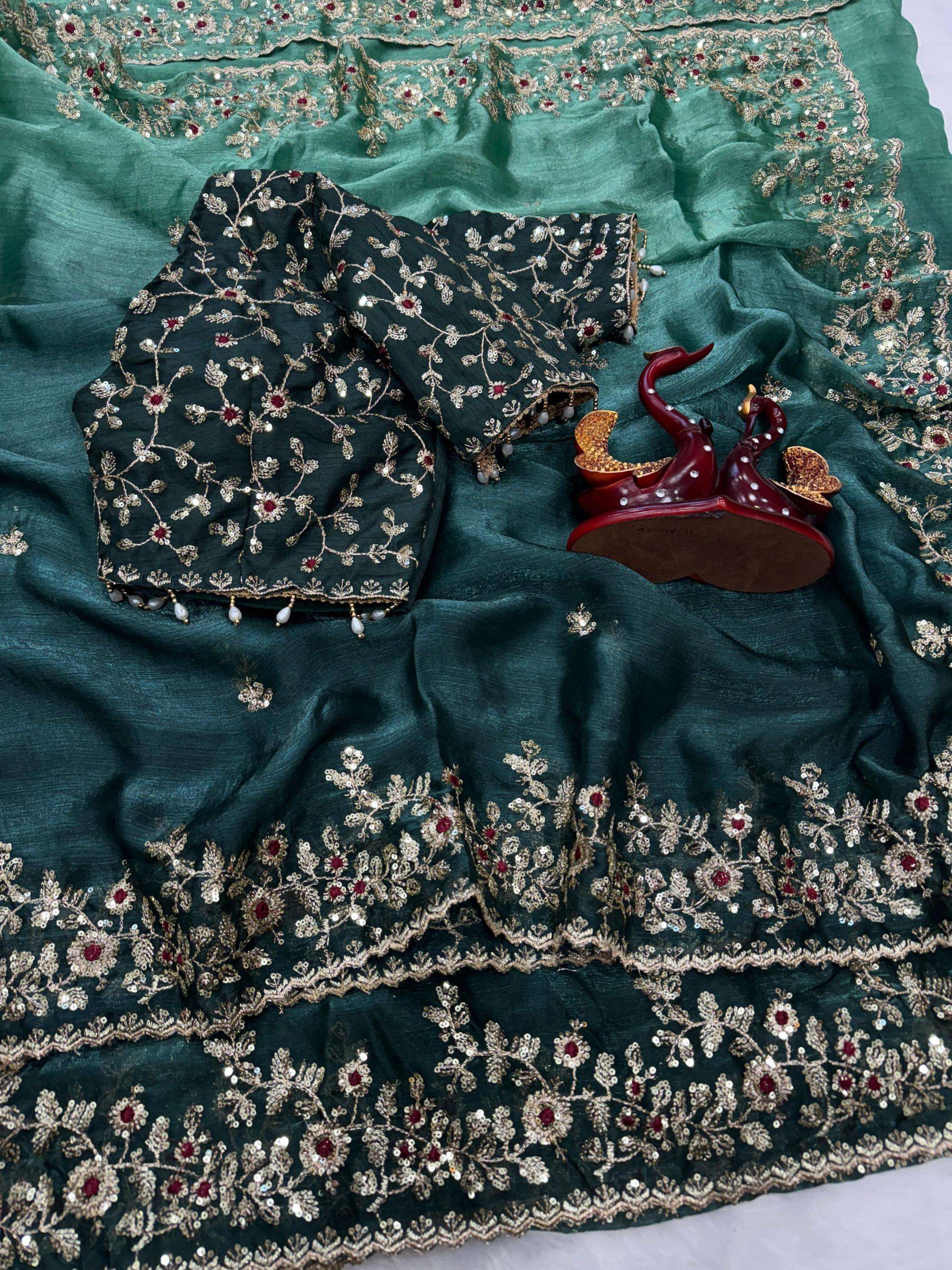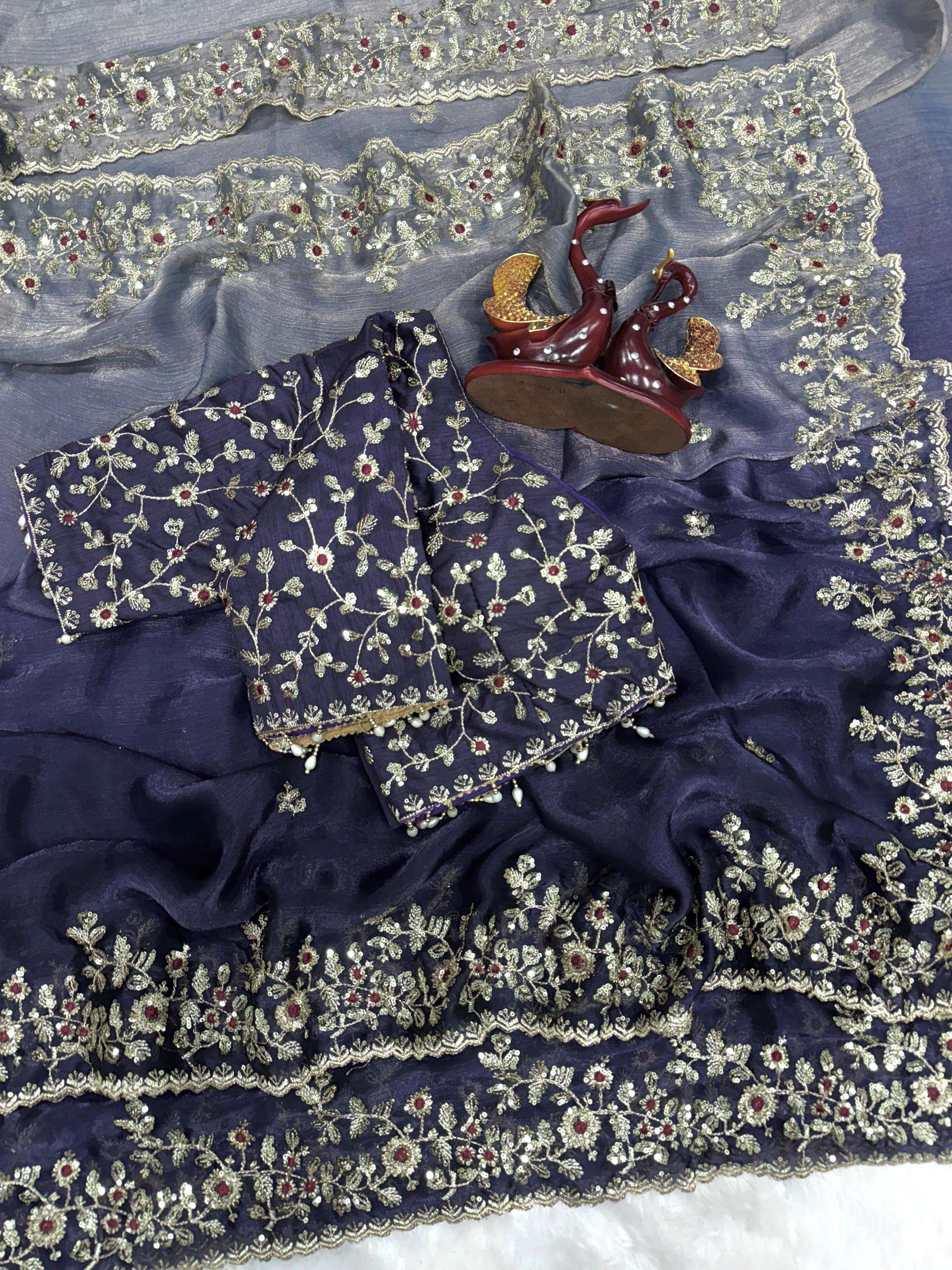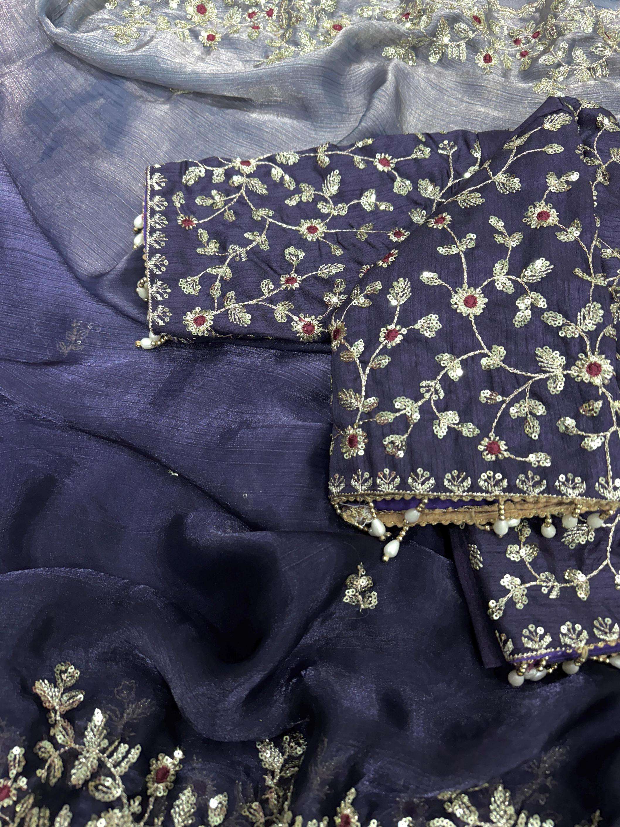 Exuding grace and sophistication, this Sequins work embroidered saree blends classic beauty with modern elegance. Each delicate petal in the design tells a story of timeless charm, making it the perfect choice for those who appreciate both tradition and contemporary style.