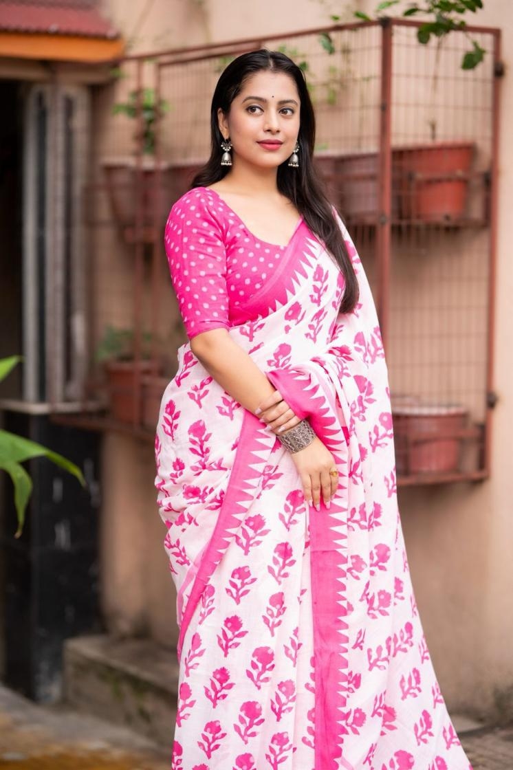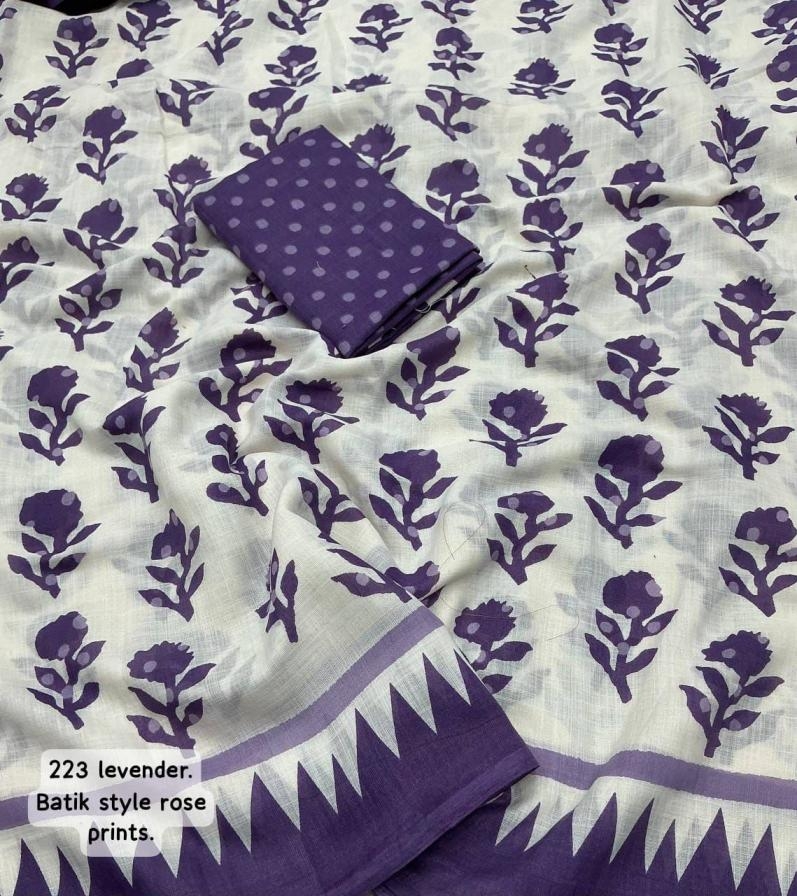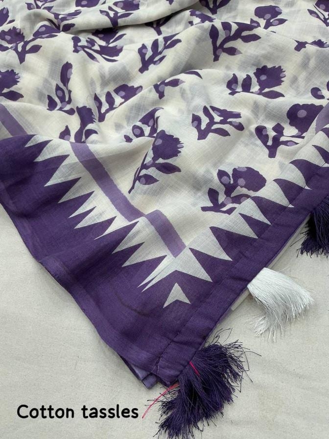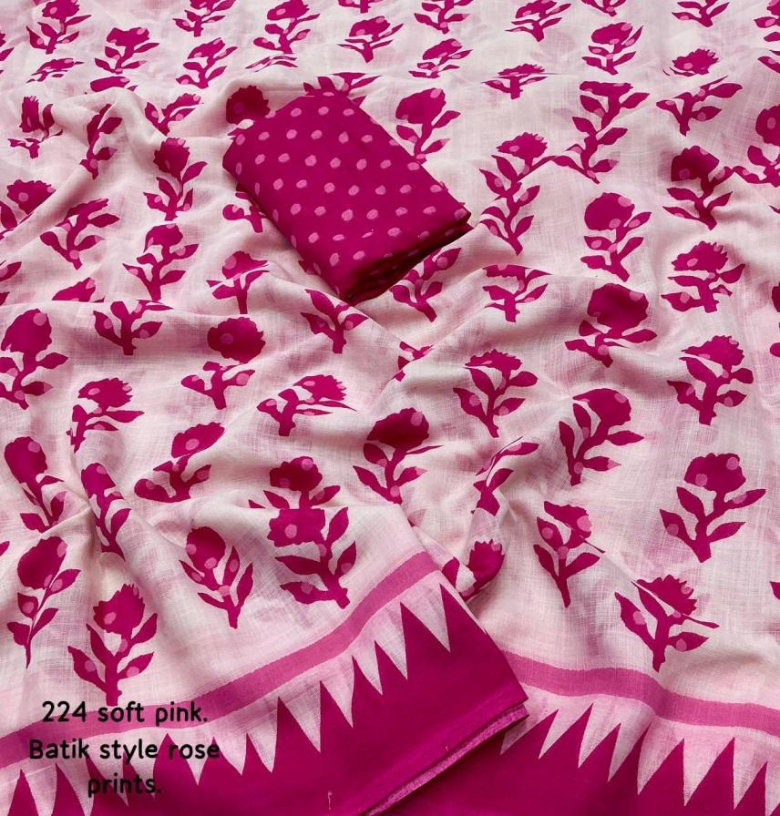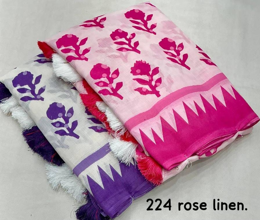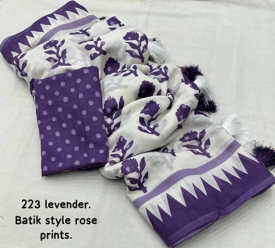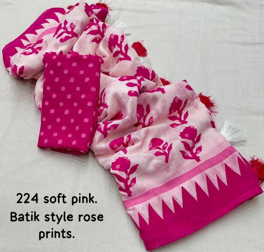 Other Details: | TRENDING new linen printed catalog Quality- soft linen saree with batik style rose prints. Cotton tassles on pallu. Blouse- running linen butti prints. Rate - 570+ship. Top truated quality. |