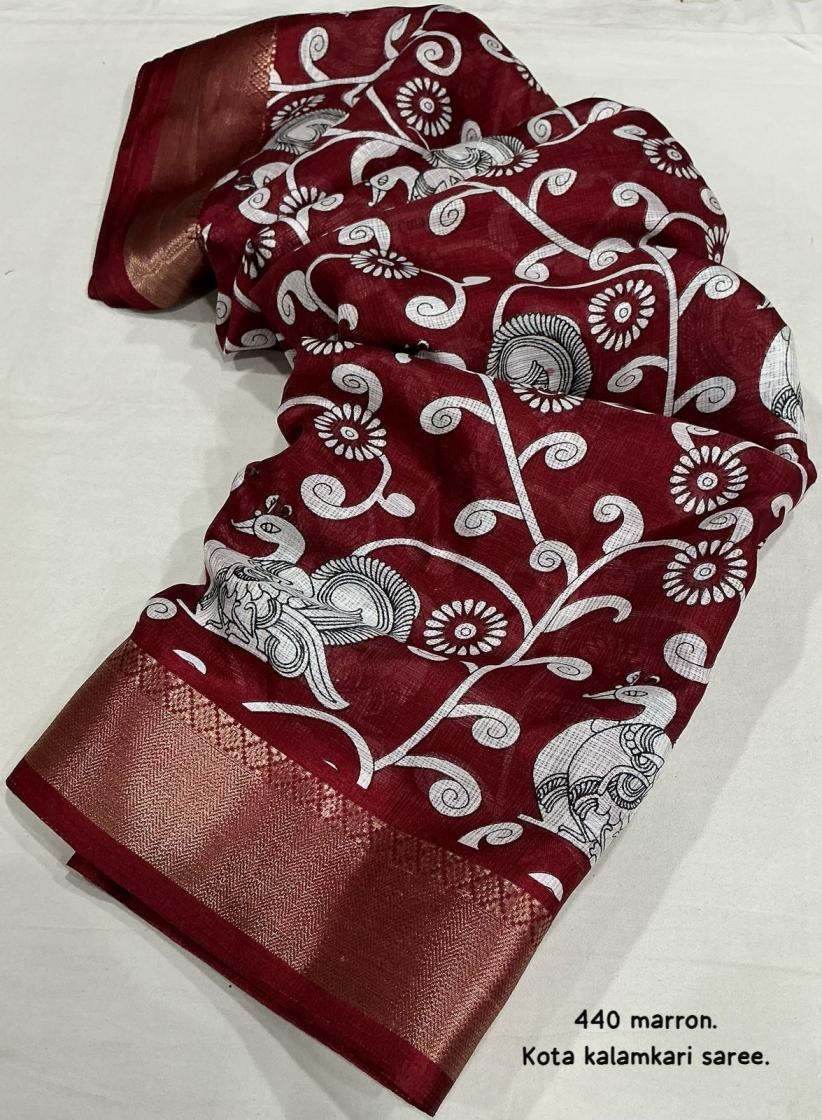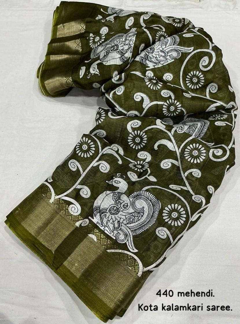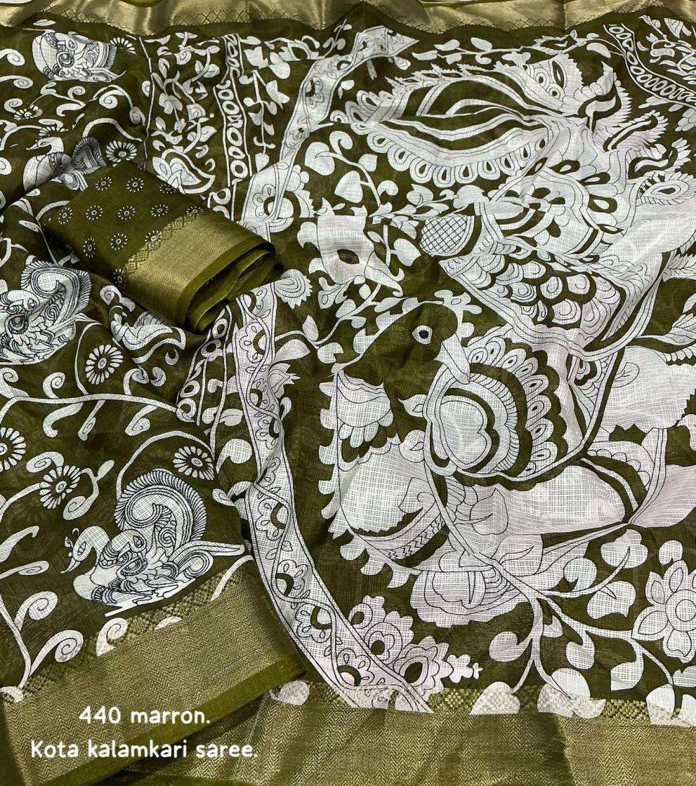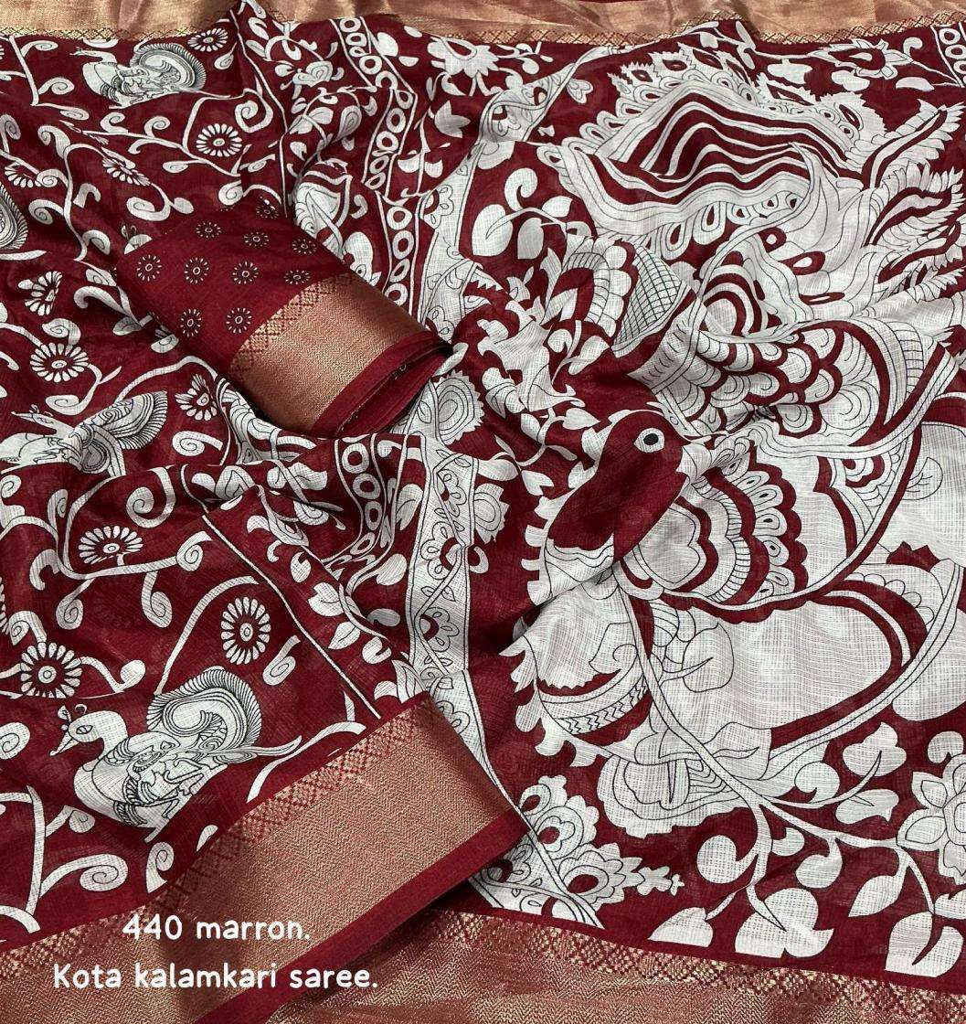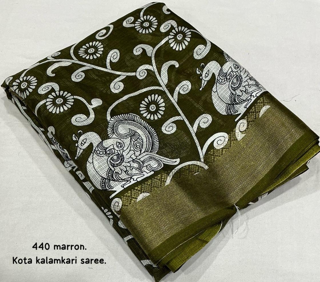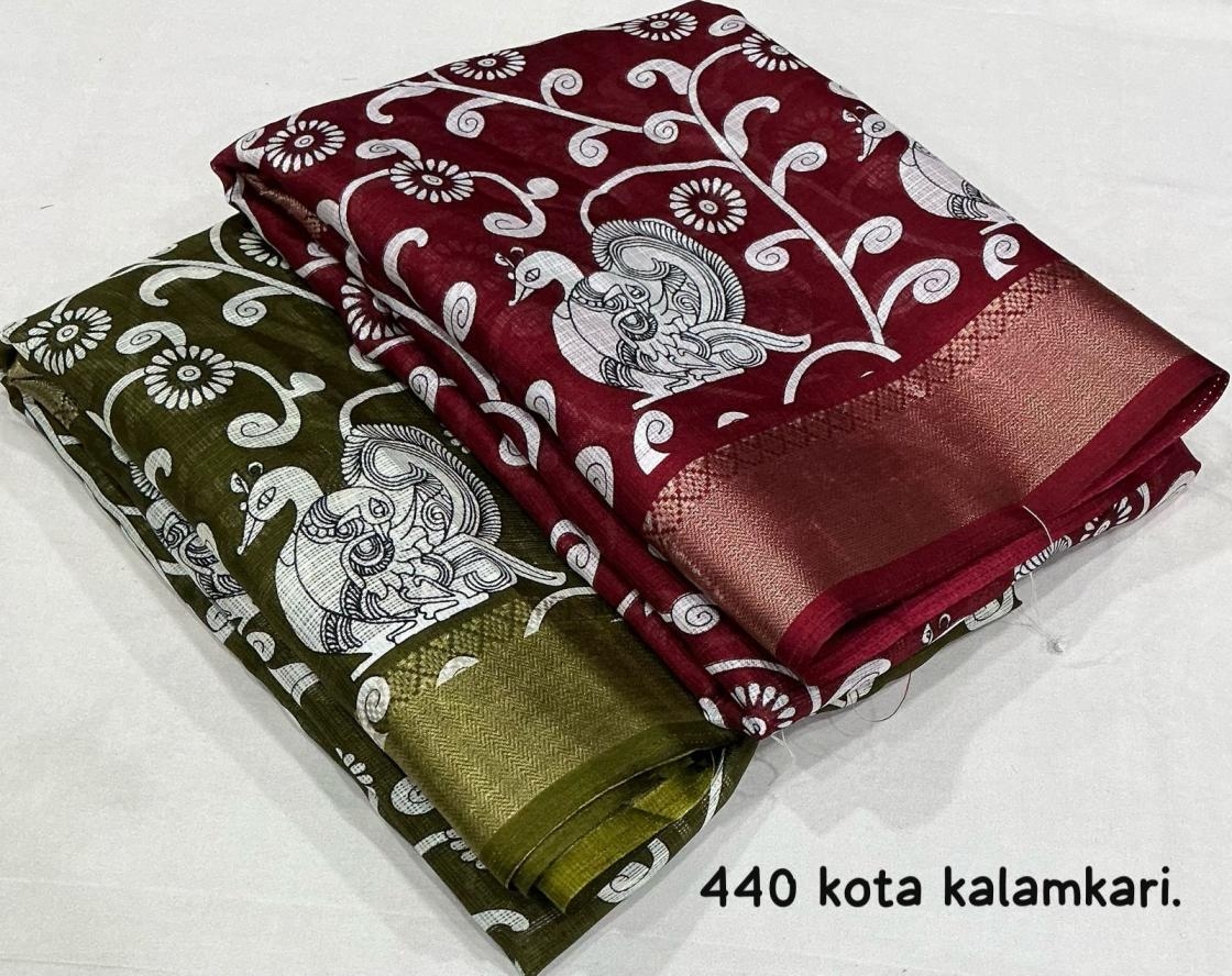 | Other Details: | new arrivals New kota kalamkari saree KC - 440 kota kalamkari. Soft kota silk saree with kalamkari prints. Zari pattu woven border. Running blouse printed blouse. Rate - 570+ship Top |