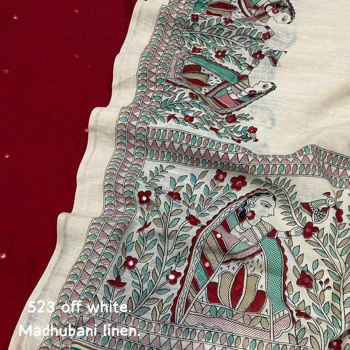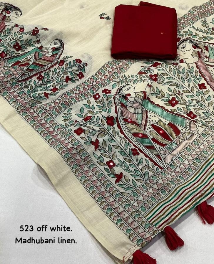 | Other Details: | new arrivals New addition to our best selling clothing. kc 523 Madhubani linen. Soft linen saree with madhubani prints. Aari mirror work done saree. Cotton tassles on pallu. Contrast solid red linen aari miror blouse. Rate - 730+ship. Top trusted quality. |