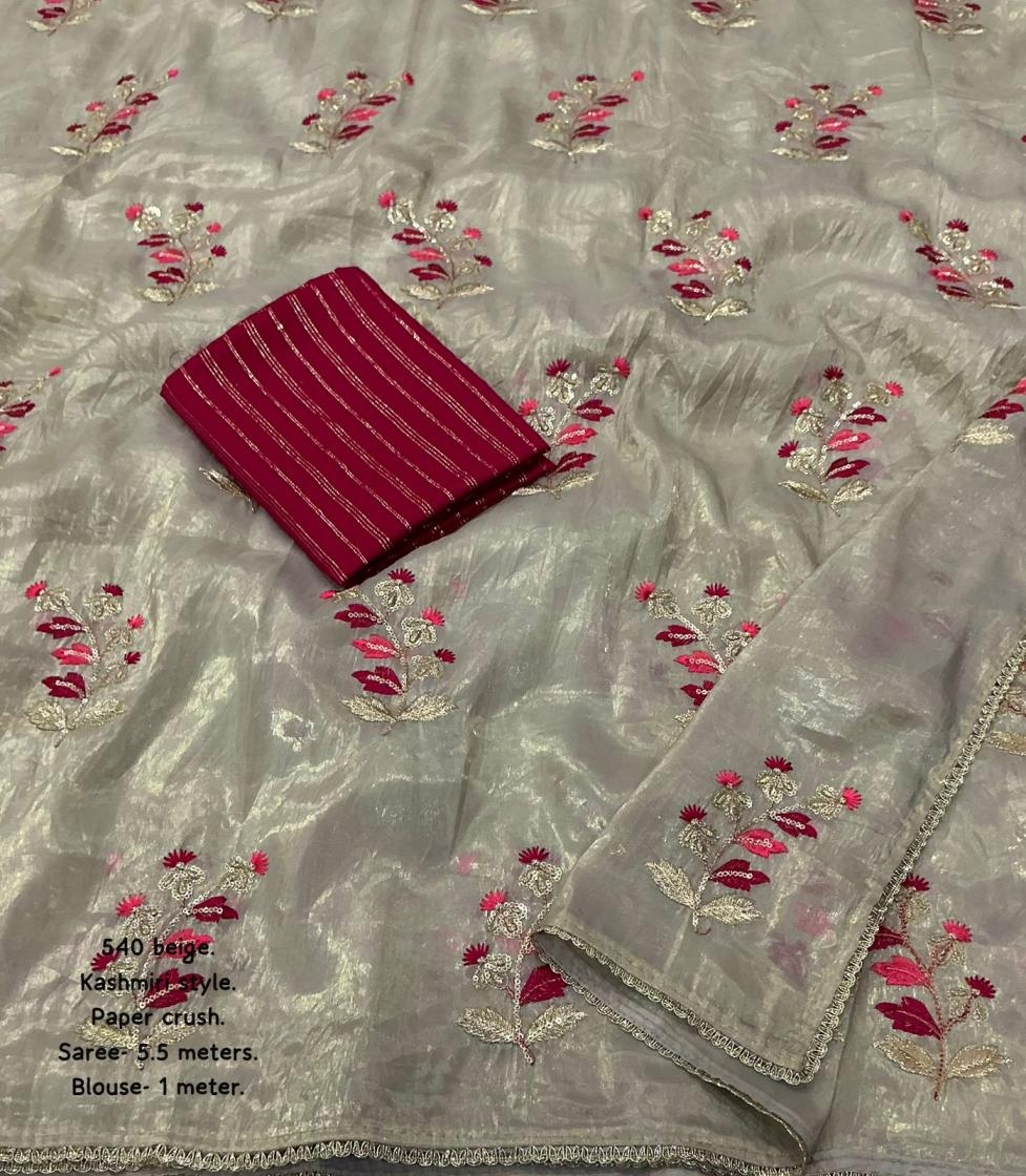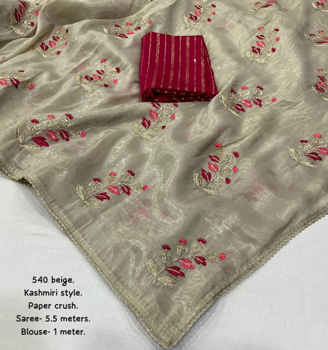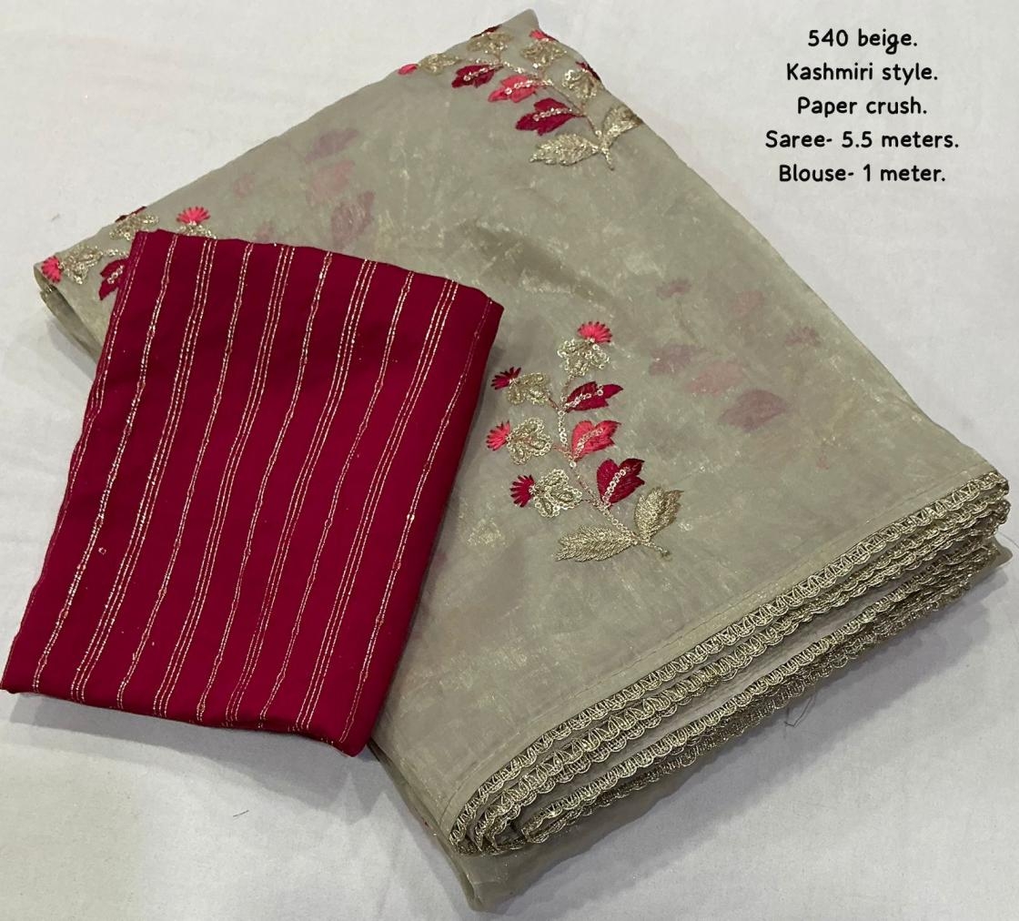 | Other Details: | new arrivals New paper crush beige saree. Kashmiri style. kc - 540 Kashmiri crush. Soft paper crush saree with kashmiri style emboridary. Patched zari lace on border. Contrast tye and dye sequence blouse. Rate - 1199+ship. Top trusted quality |