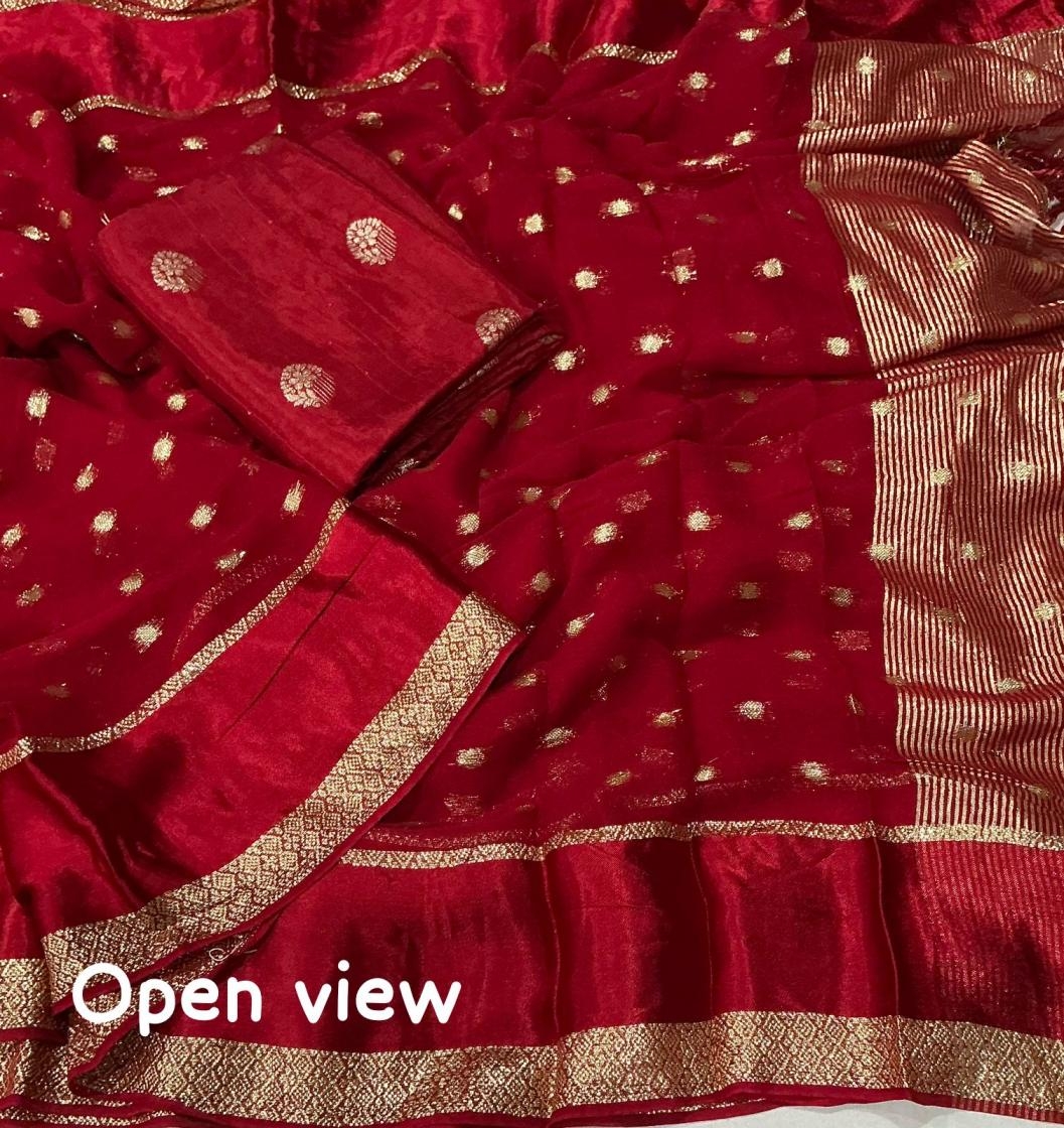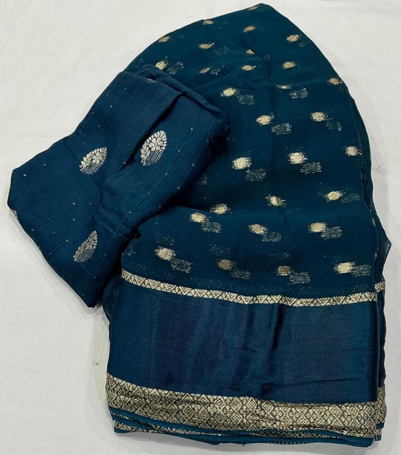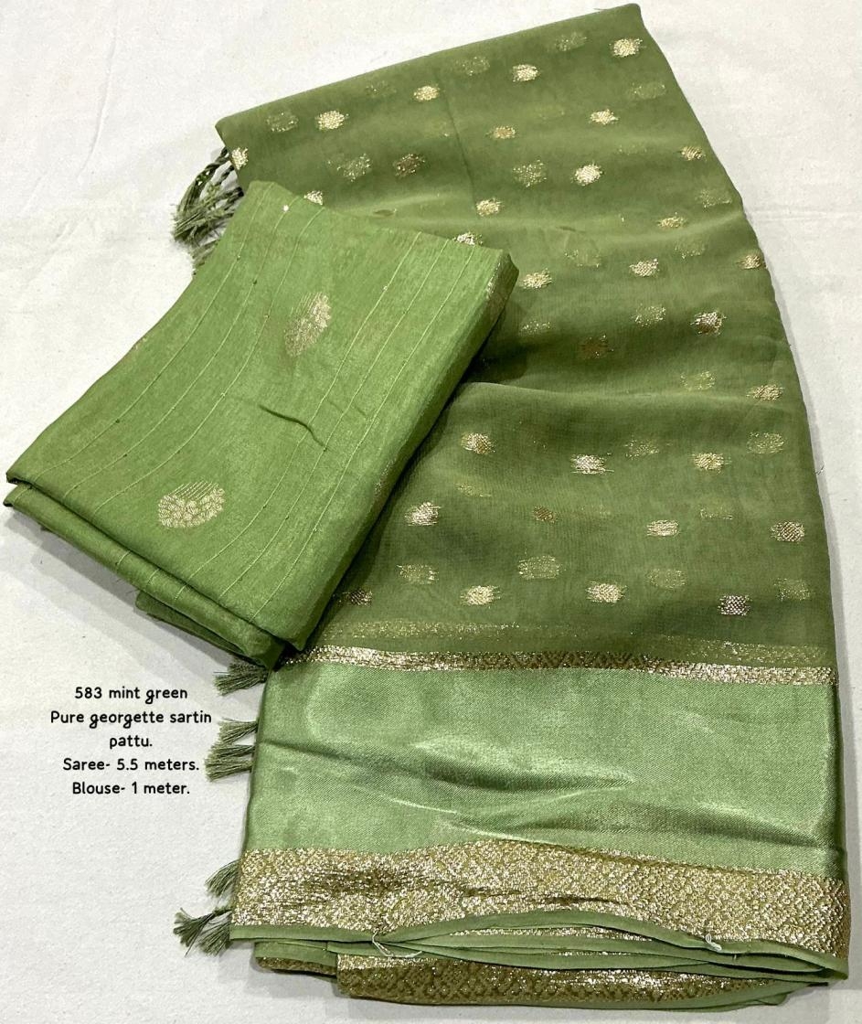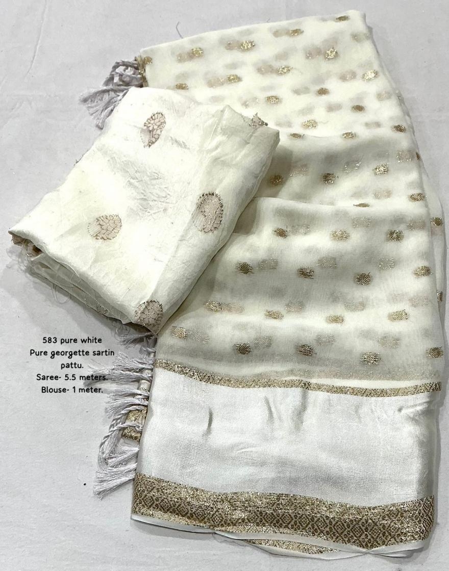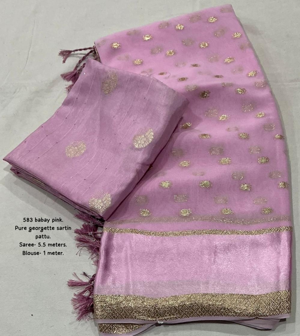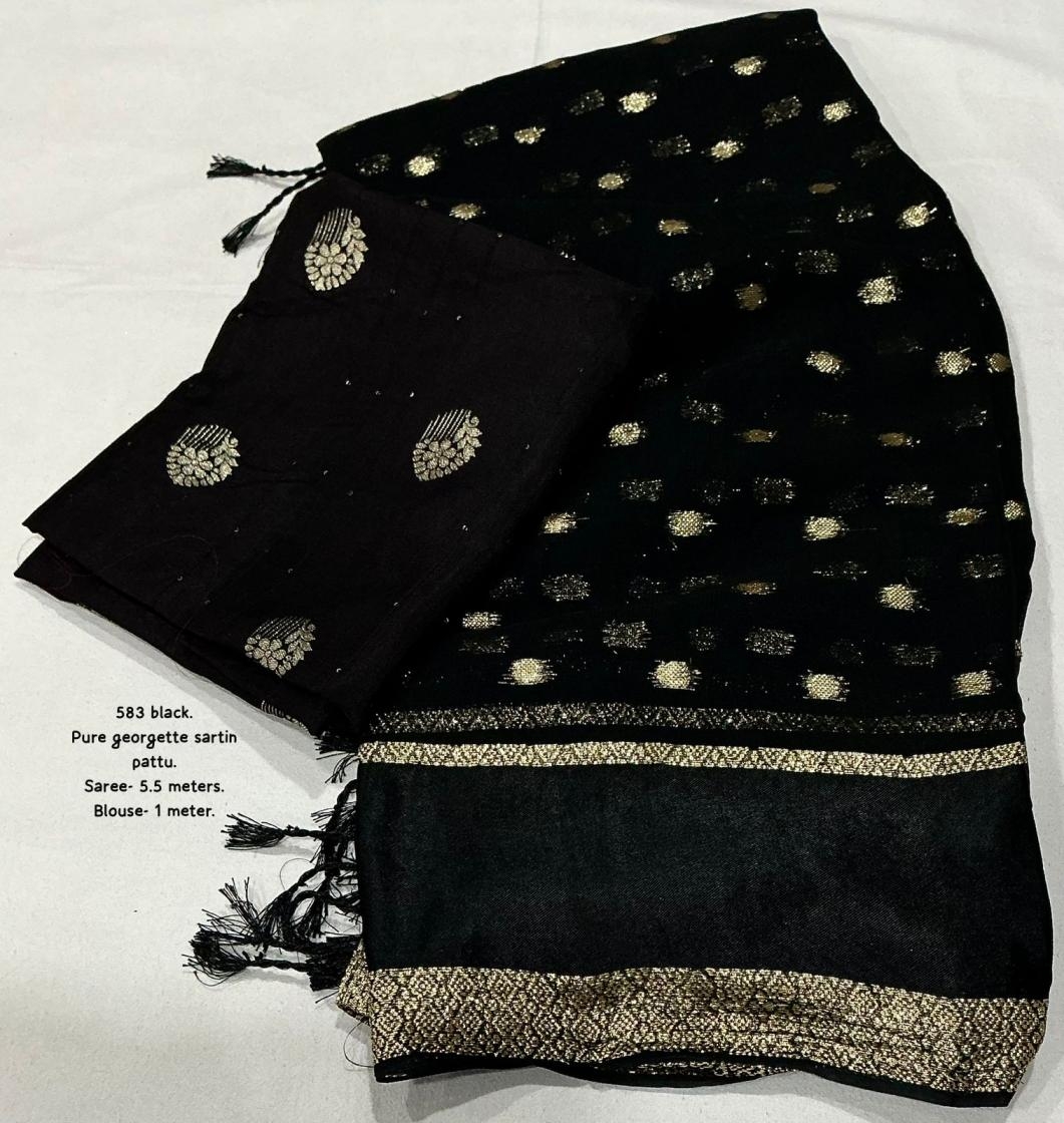 | Other Details: | new arrivals New preimum pure geirgeette collection kc - 583 pure georgette sartin pattu, Pure georgette sartin pattu saree with zari butti allover. Tassles on pallu. Both side sartin pattu. Perfectly matched pure dolla silk tye & dye blouse. Rate - 1350+ship. Top premium quality |