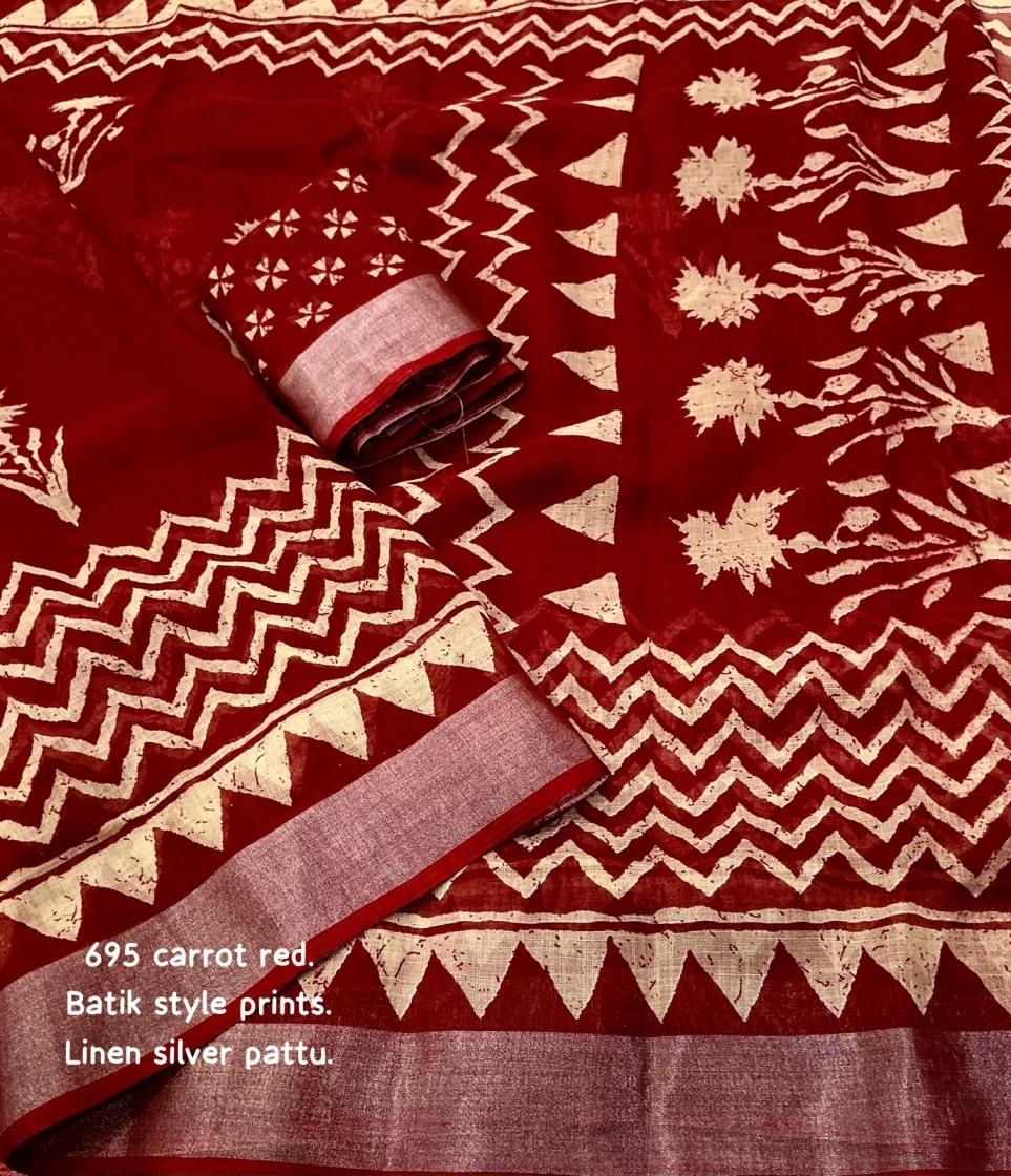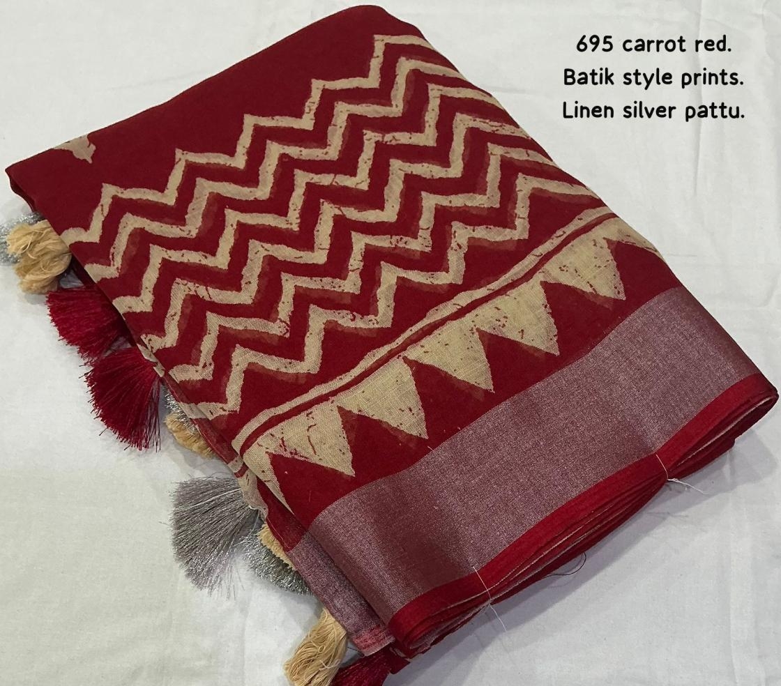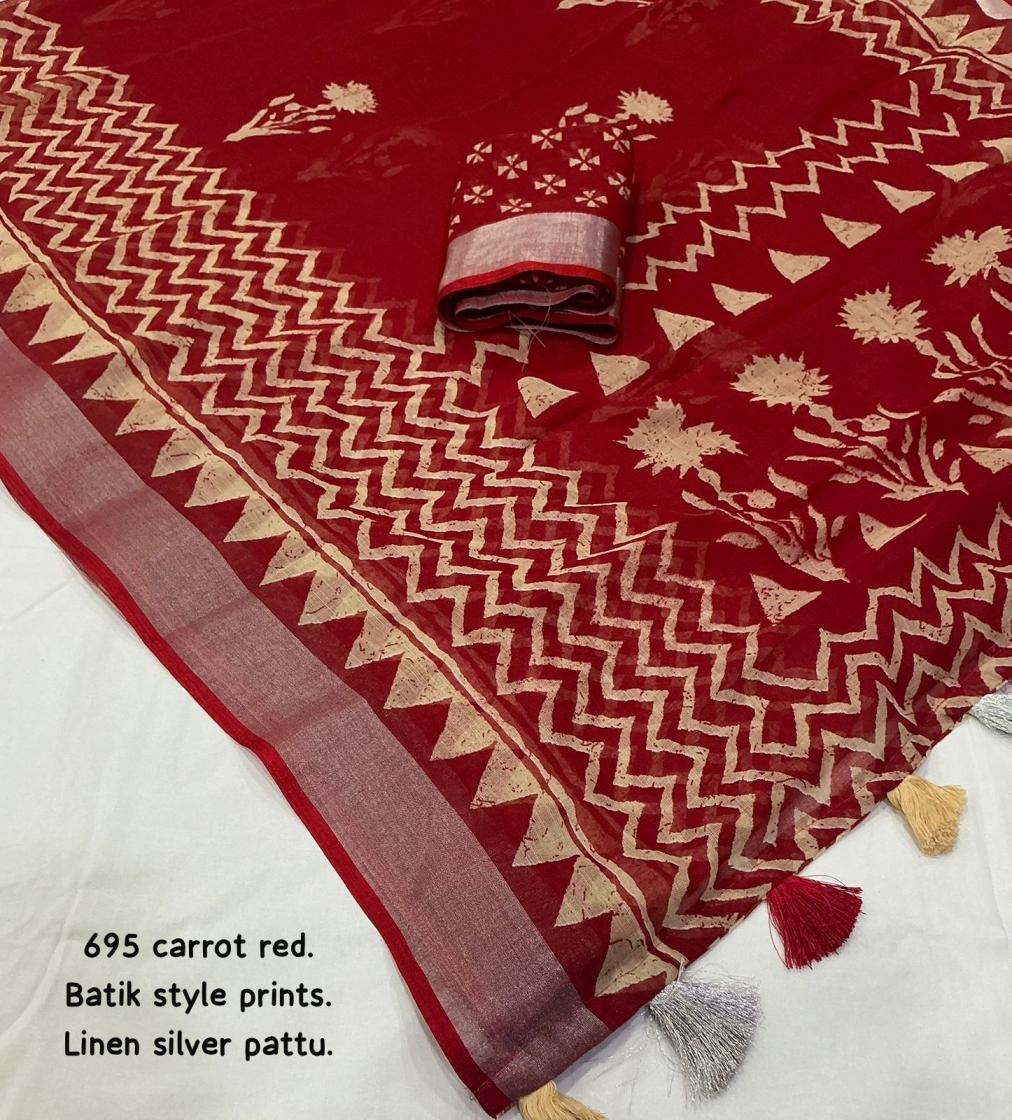 | Other Details: | new arrivals New batik style linen printed saree. kc 695 mogra linen. Soft linen saree with batik prints and silver zari woven border Cotton tassels on pallu. Perfectly matched running printed blouse. Rate- 599+ship. Top trusted quality |