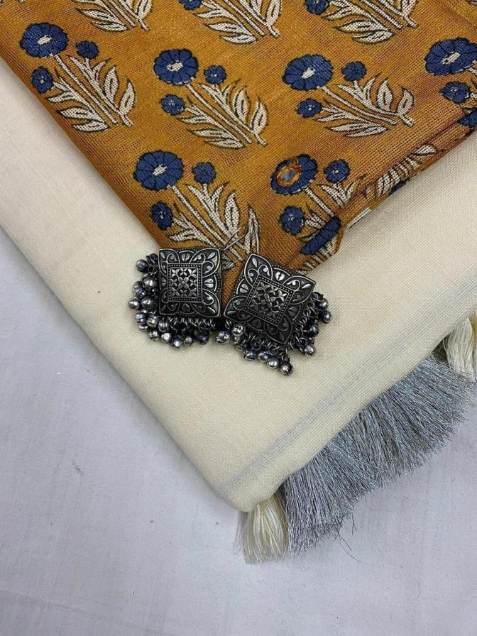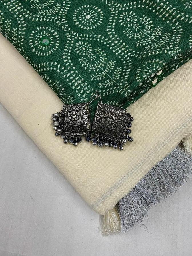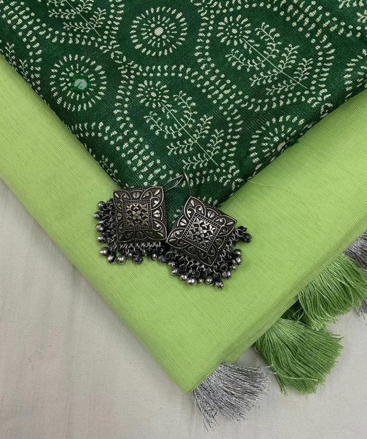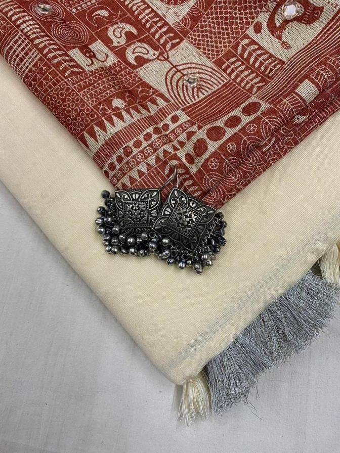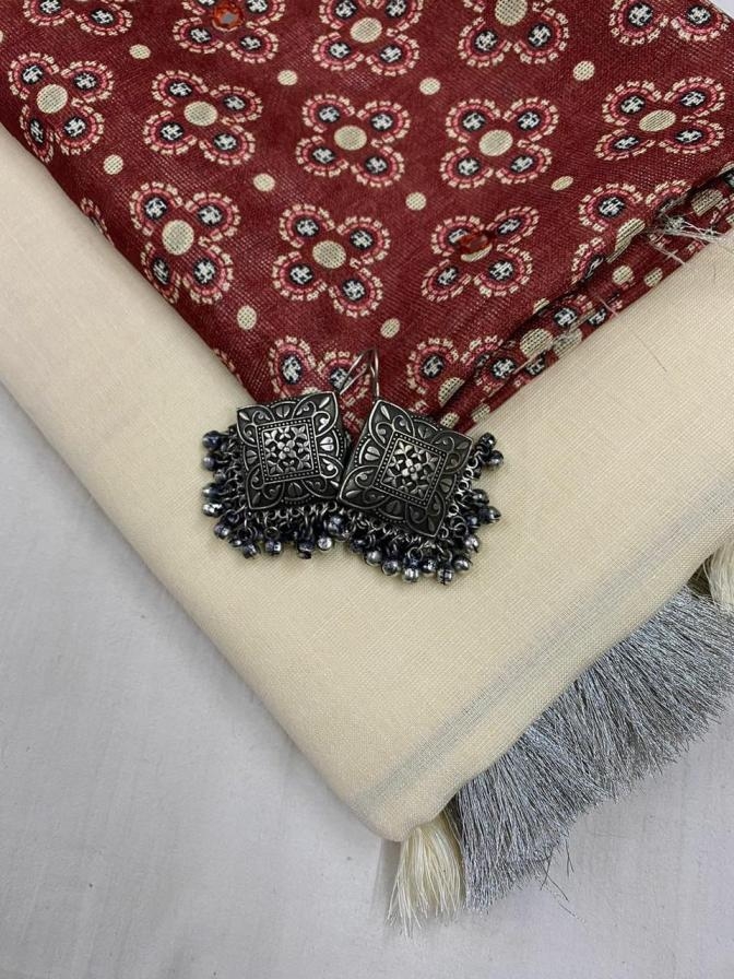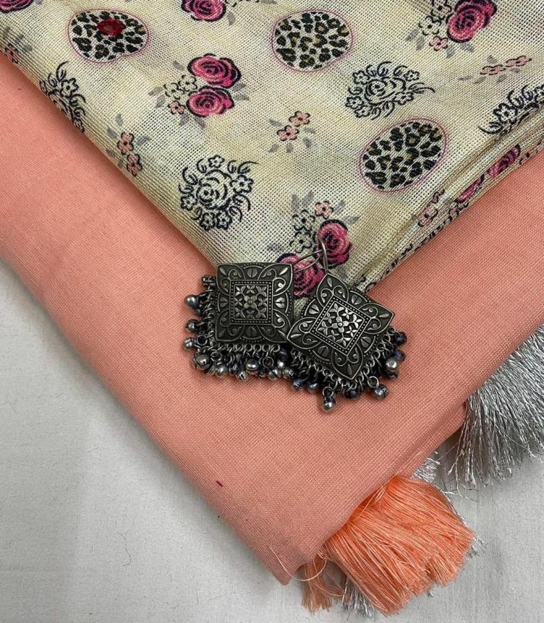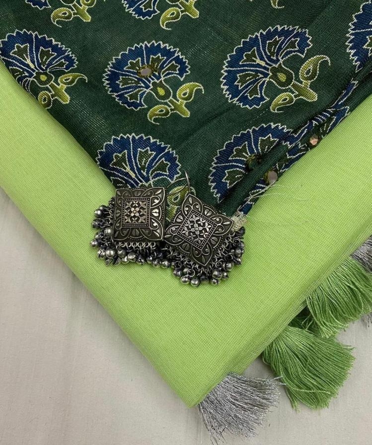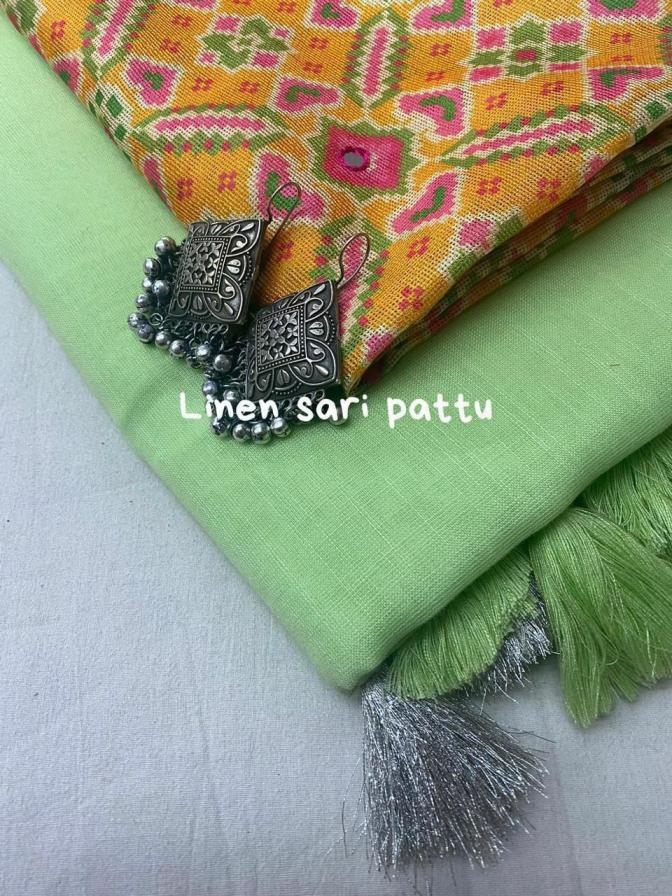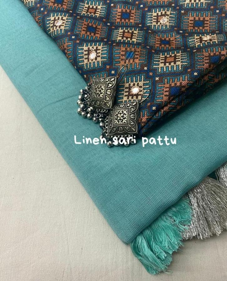 | Other Details: | Top coustmer staisfaction KC - silver linen (single color edition) Quality- grey colored linen saree with silver zari weaving pattu border. Cotton tasselson pallu. Blouse- beautifull bhandani style printed jute silk with hand aari mirror work. Free - perfectly matched oxidised jumkas (super high quality). Saree- 5.5 meters Top trusted quality |