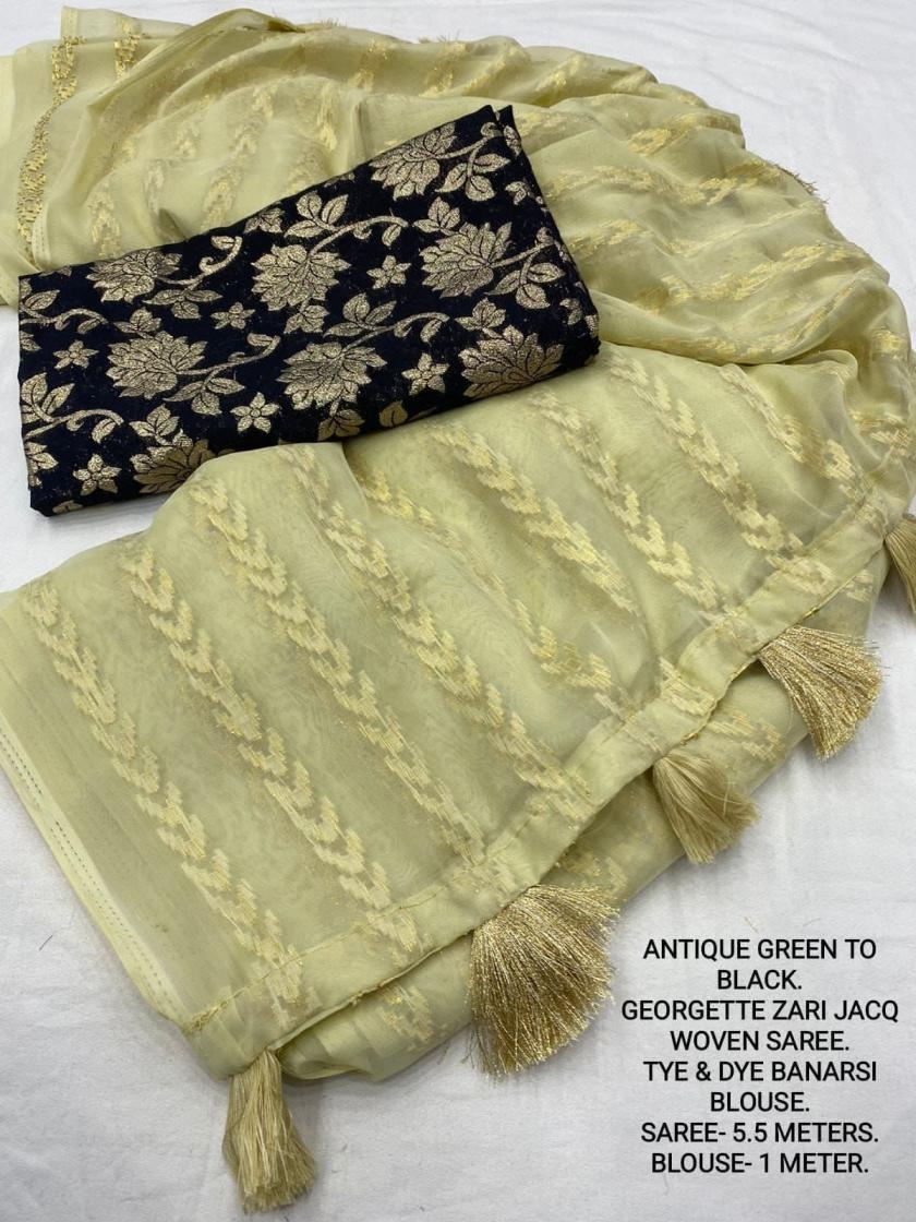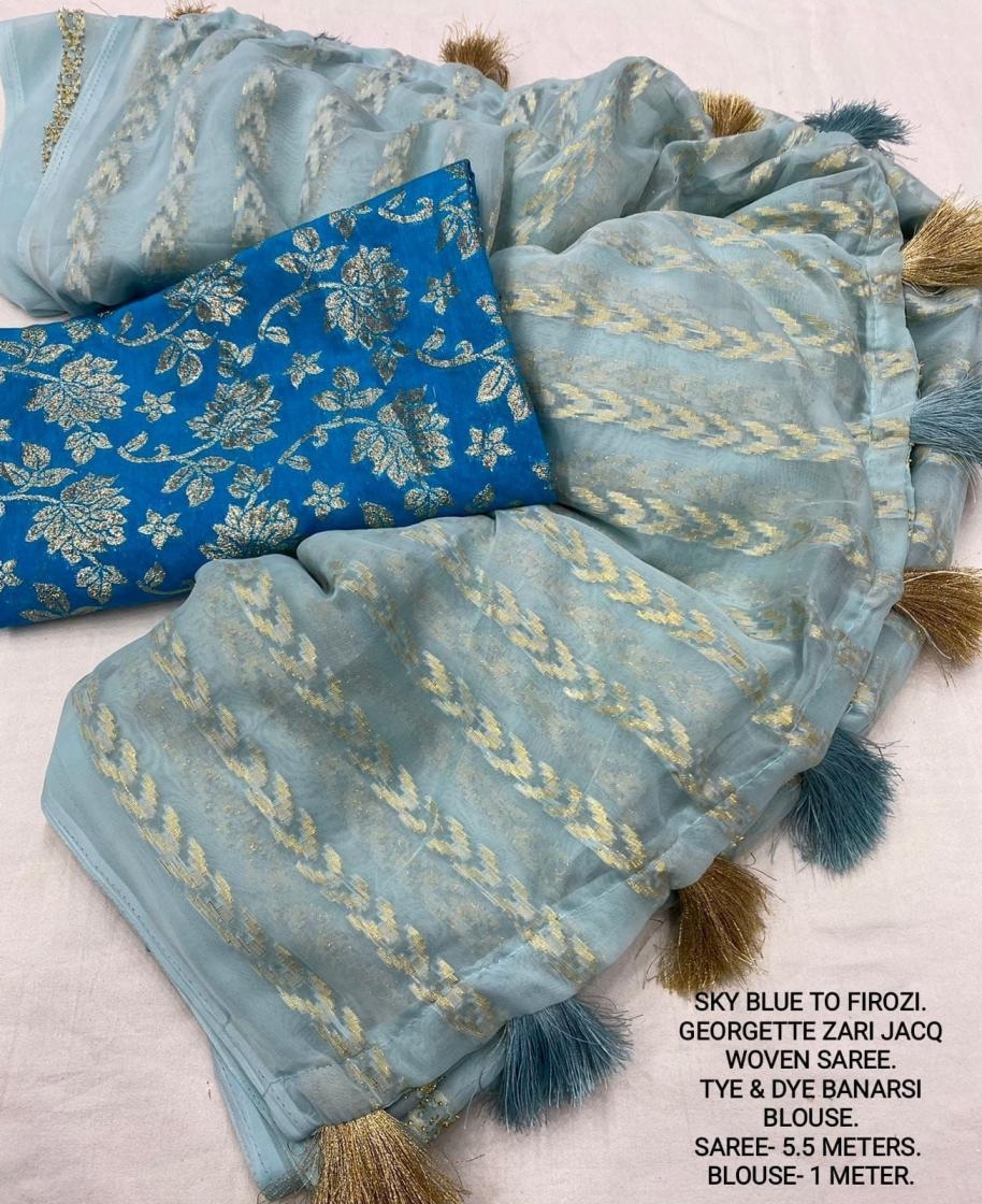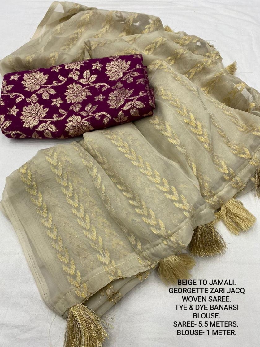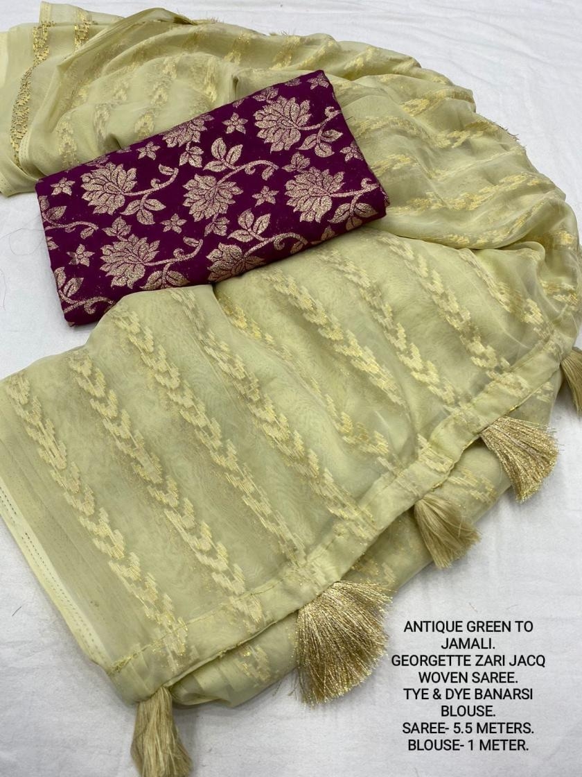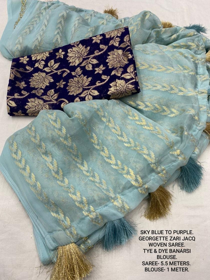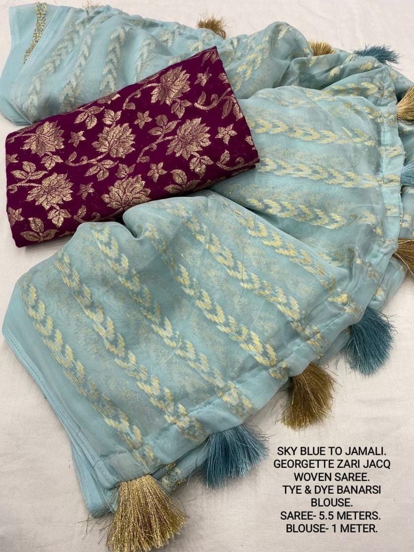| Other Details: | best seller Kc- siya (arrow woven design) Quality- soft chiffon saree with allover zari woven jacq lining. Cotton Tassels on pallu. Blouse- pire banarasi silk tye and dye zaal design. Length- Rate - 895+ship Top trusted quality from kc |
