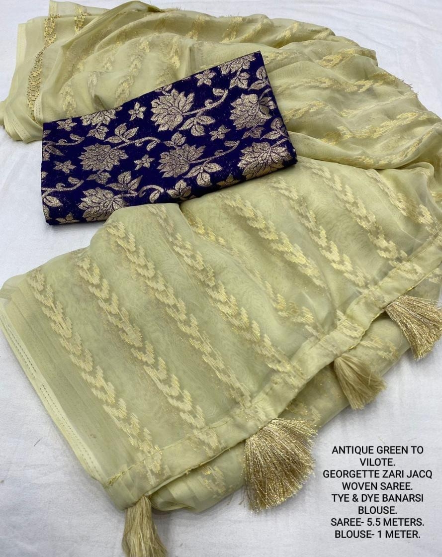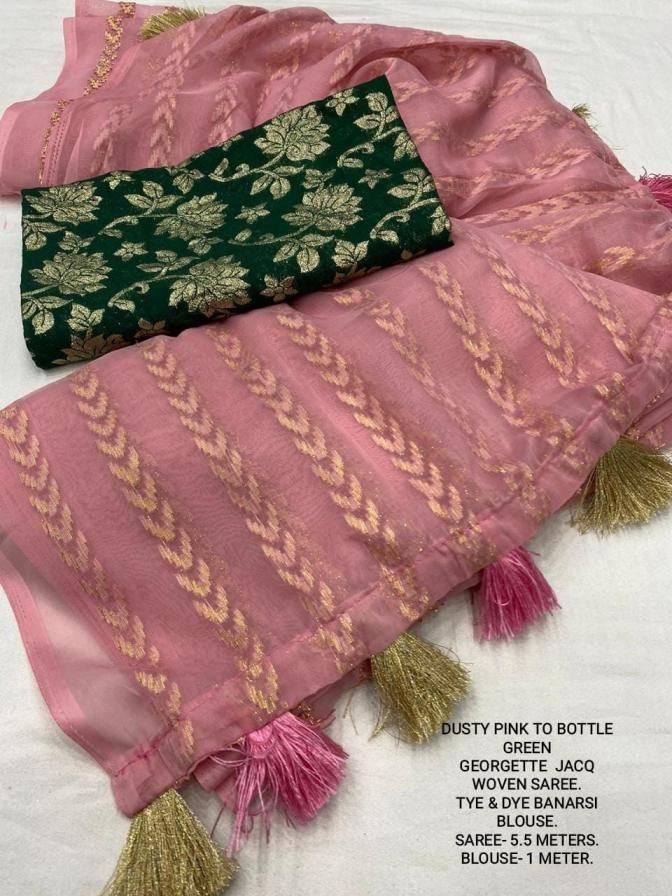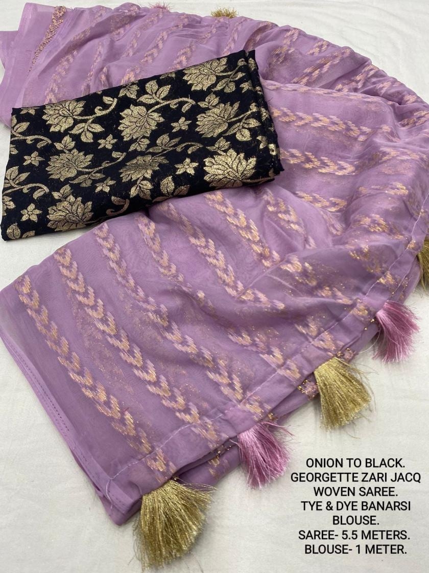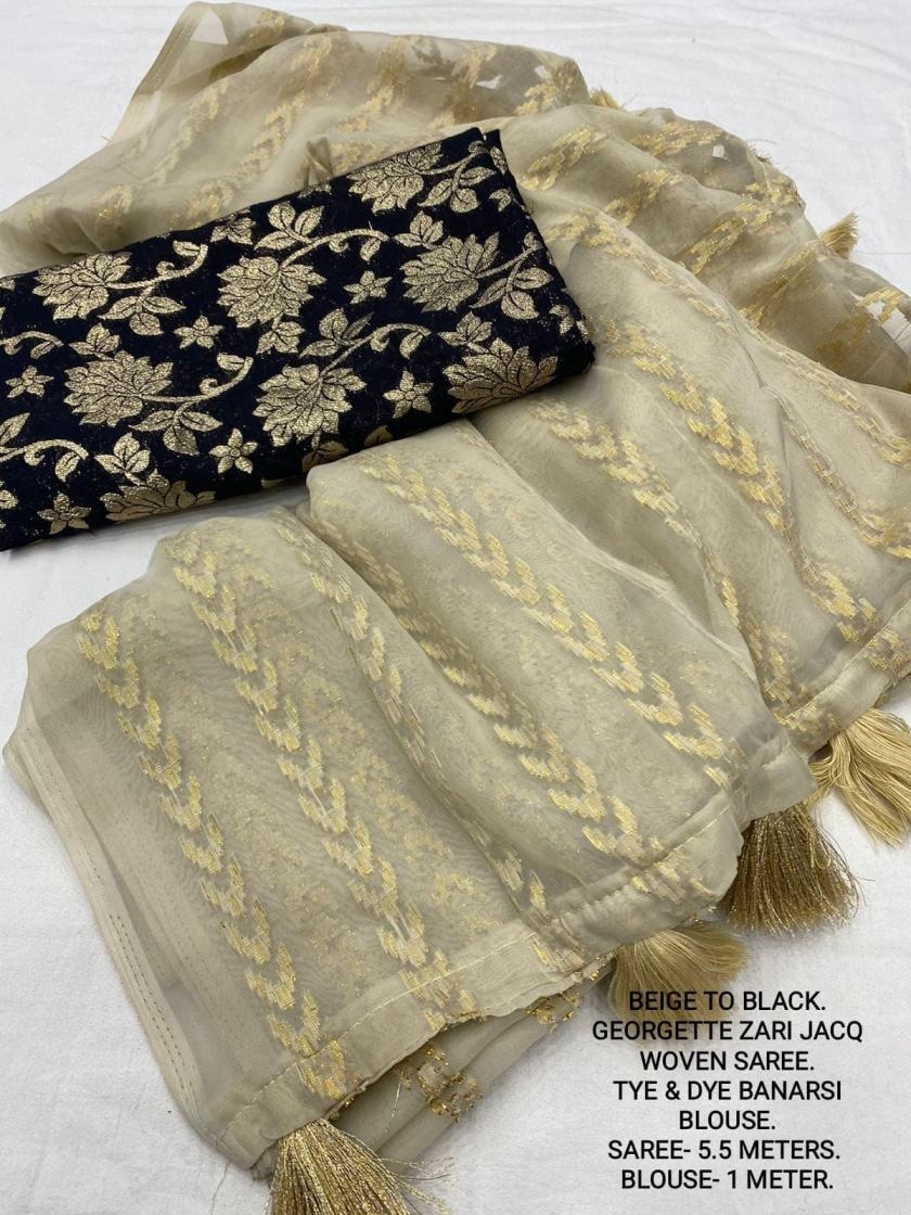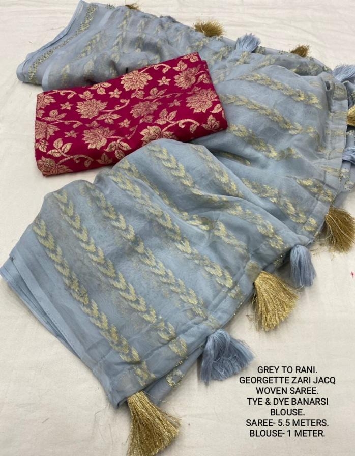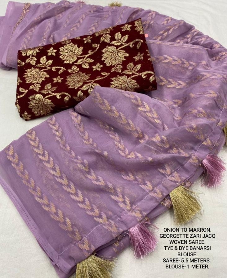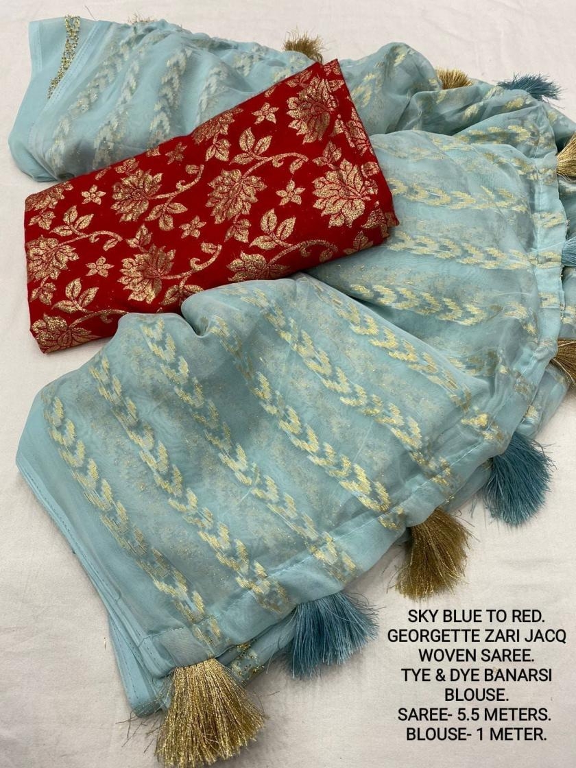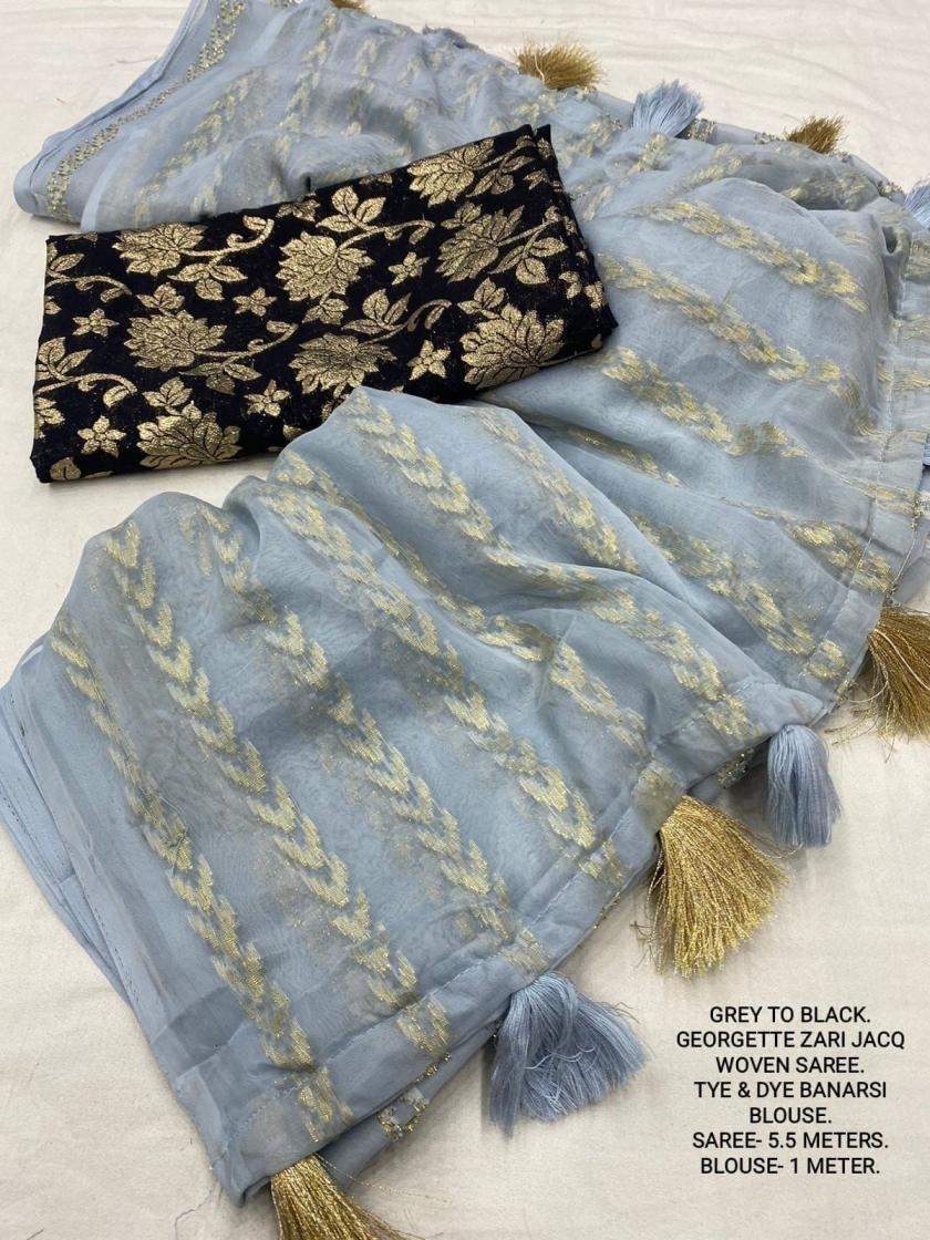 | Other Details: | best seller Kc- siya (arrow woven design) Quality- soft chiffon saree with allover zari woven jacq lining. Cotton Tassels on pallu. Blouse- pire banarasi silk tye and dye zaal design. Length- Rate - 895+ship Top trusted quality from kc |