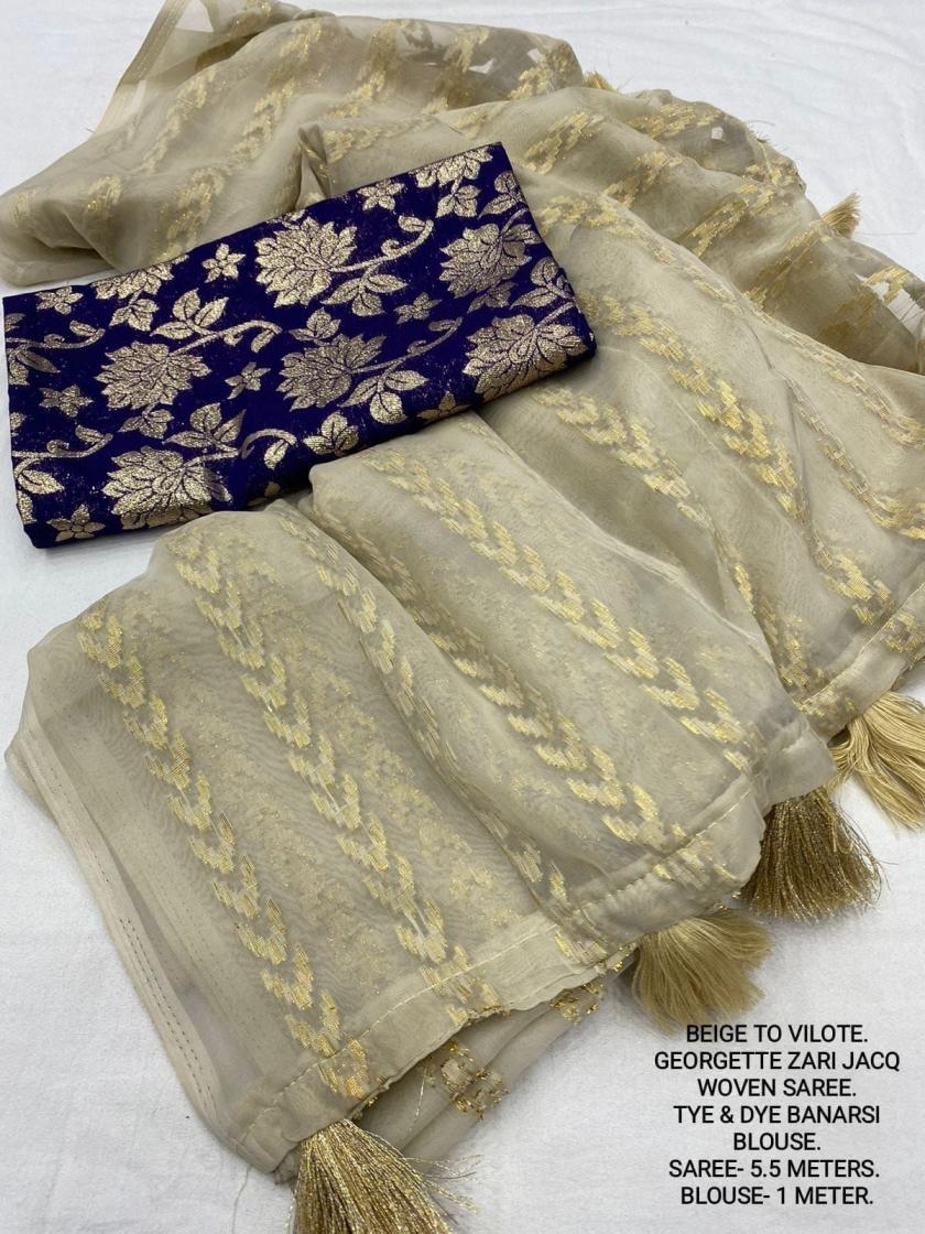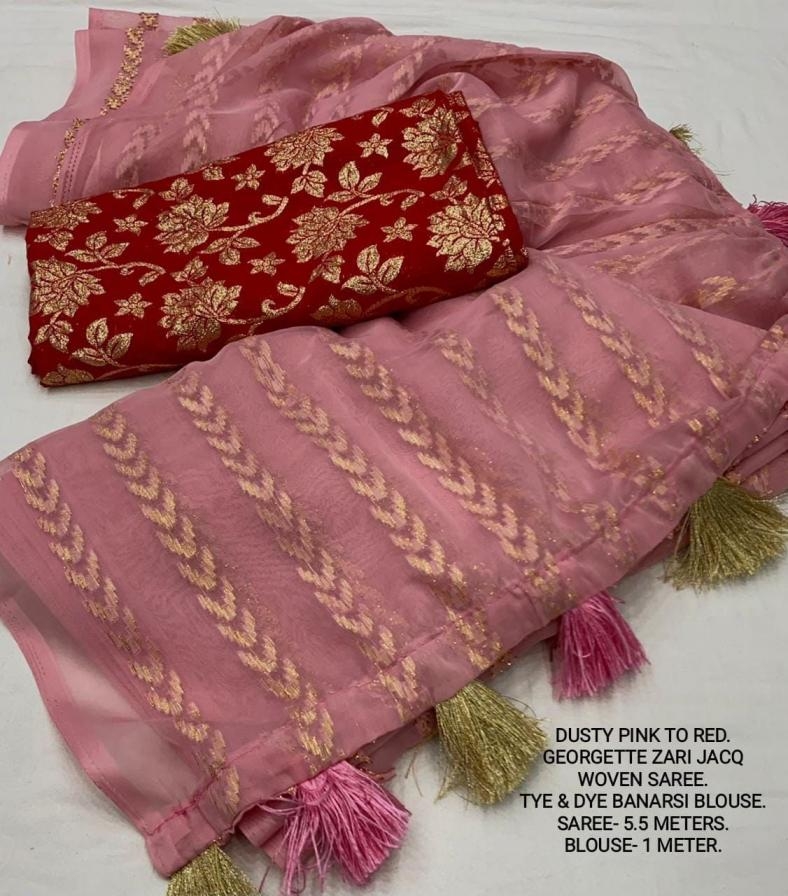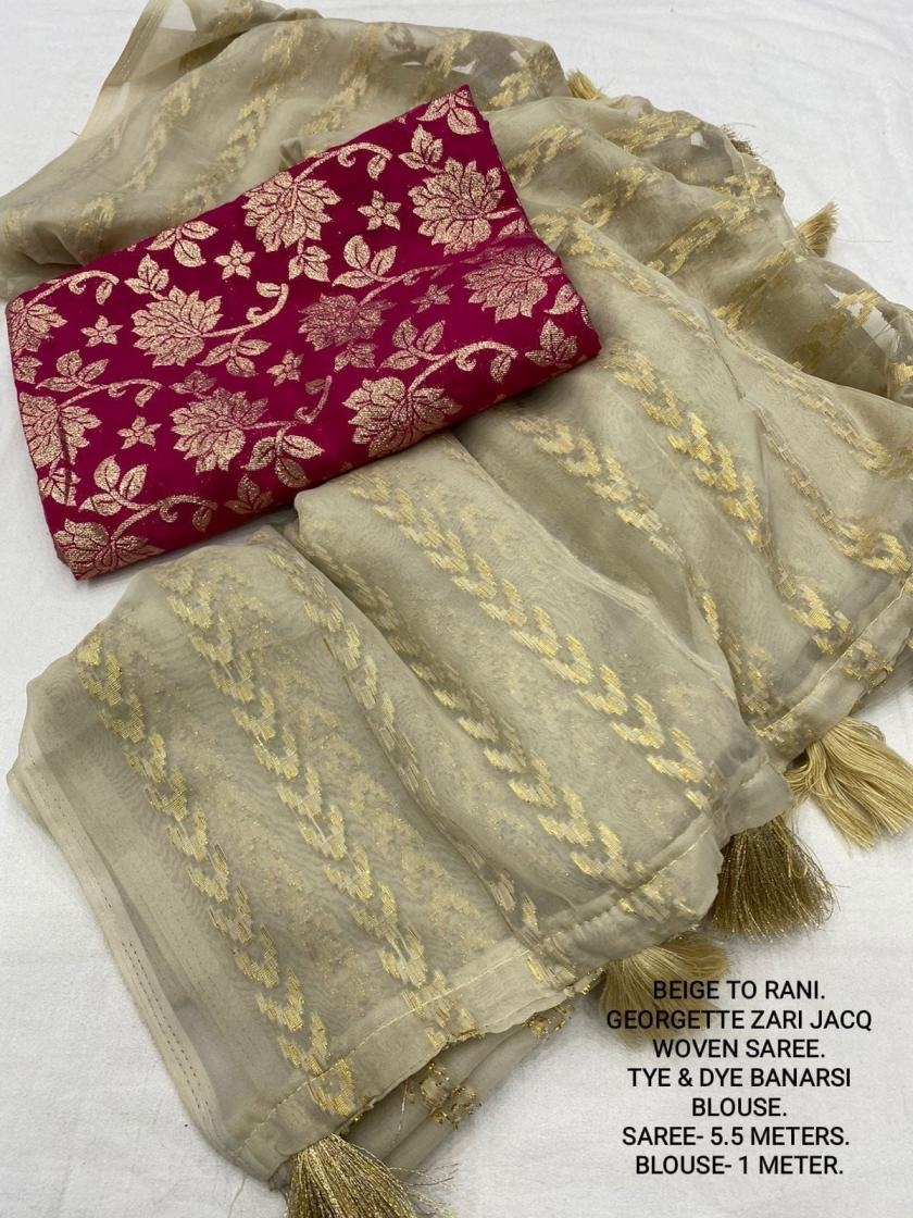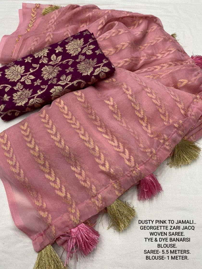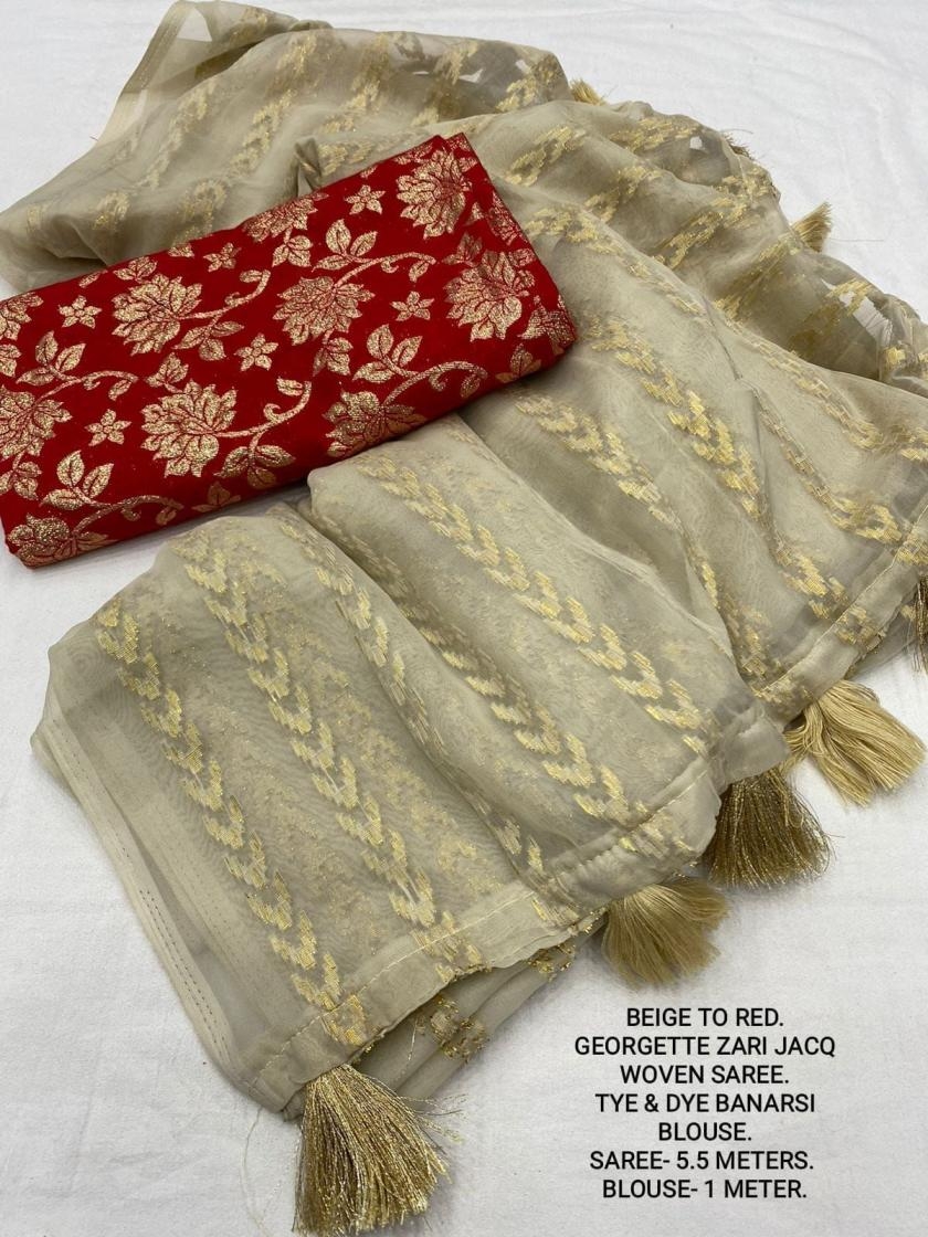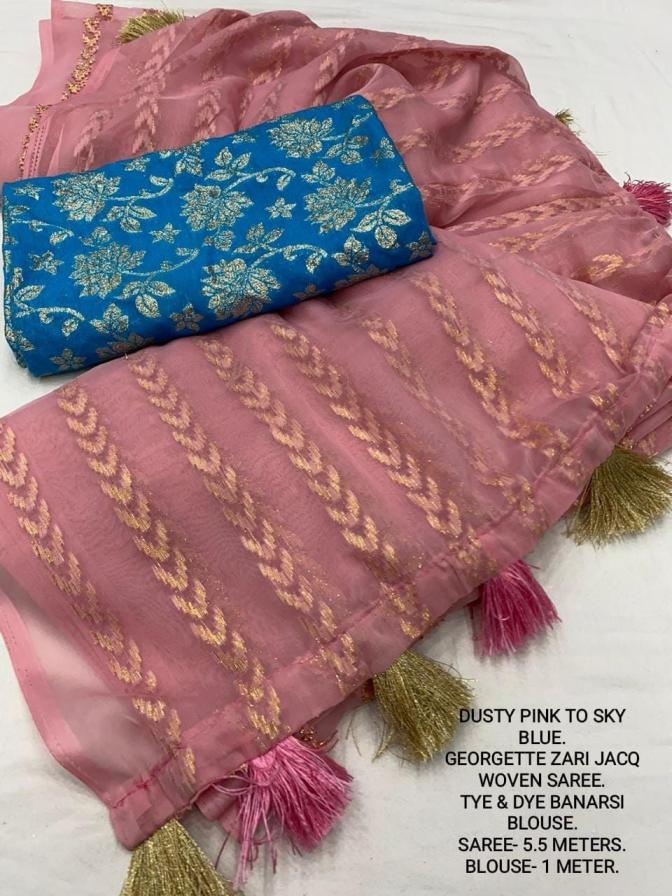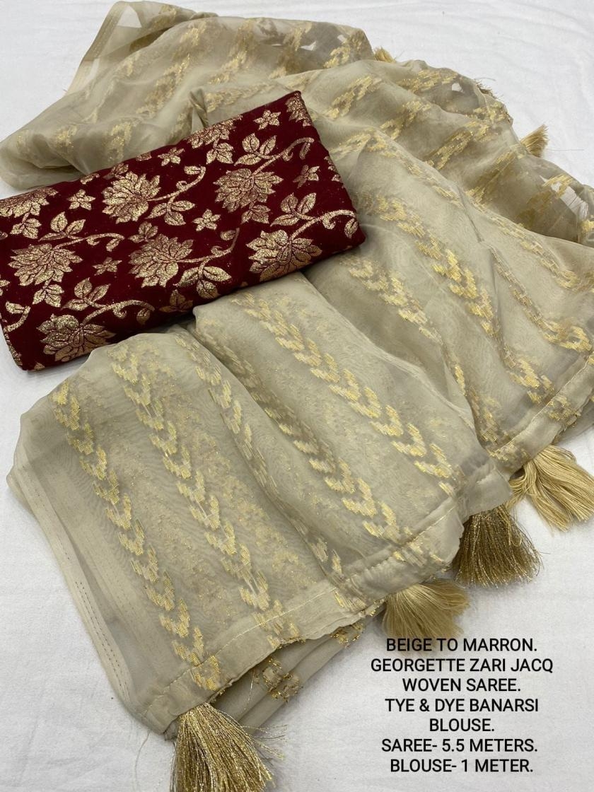 | Other Details: | best seller Kc- siya (arrow woven design) Quality- soft chiffon saree with allover zari woven jacq lining. Cotton Tassels on pallu. Blouse- pire banarasi silk tye and dye zaal design. Length- Rate - 895+ship Top trusted quality from kc |