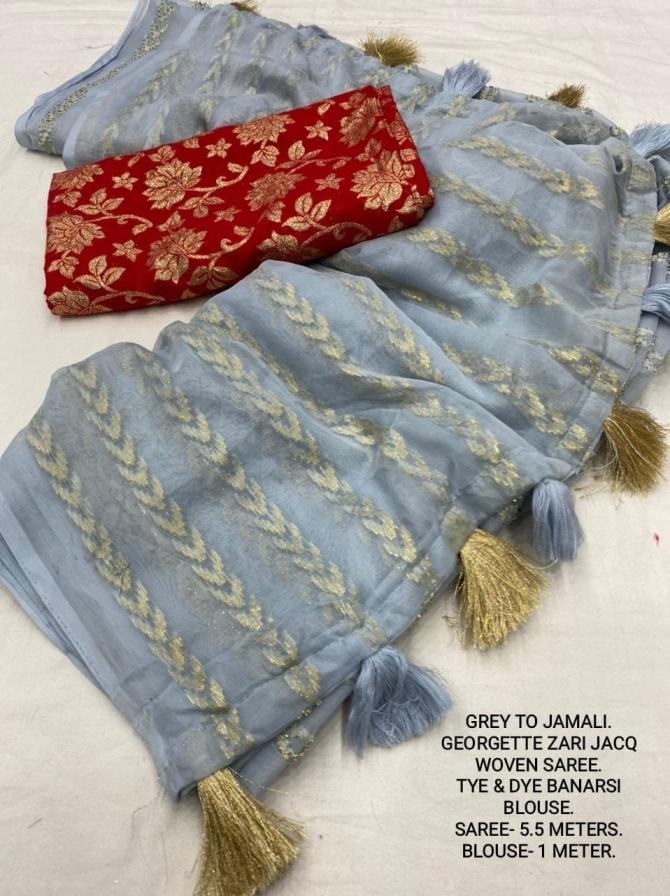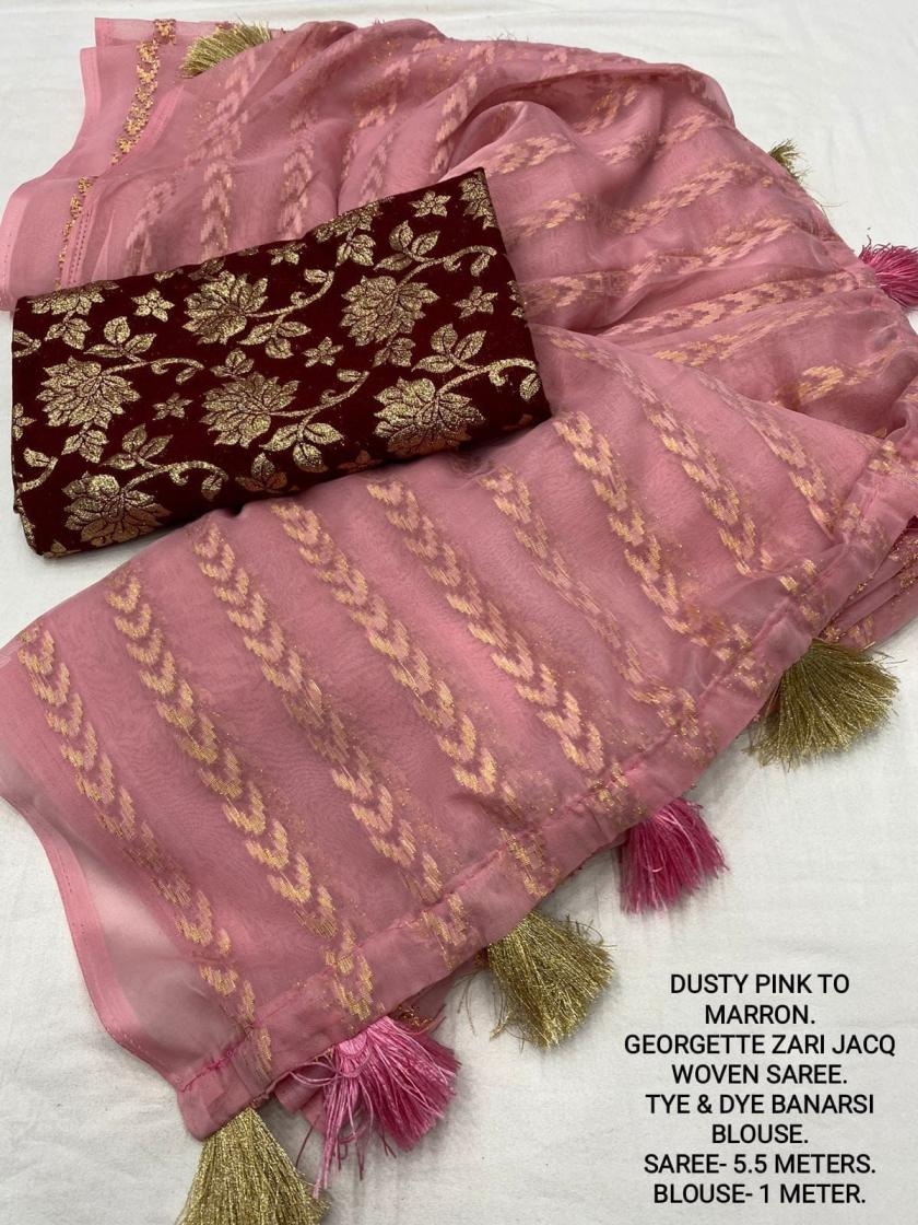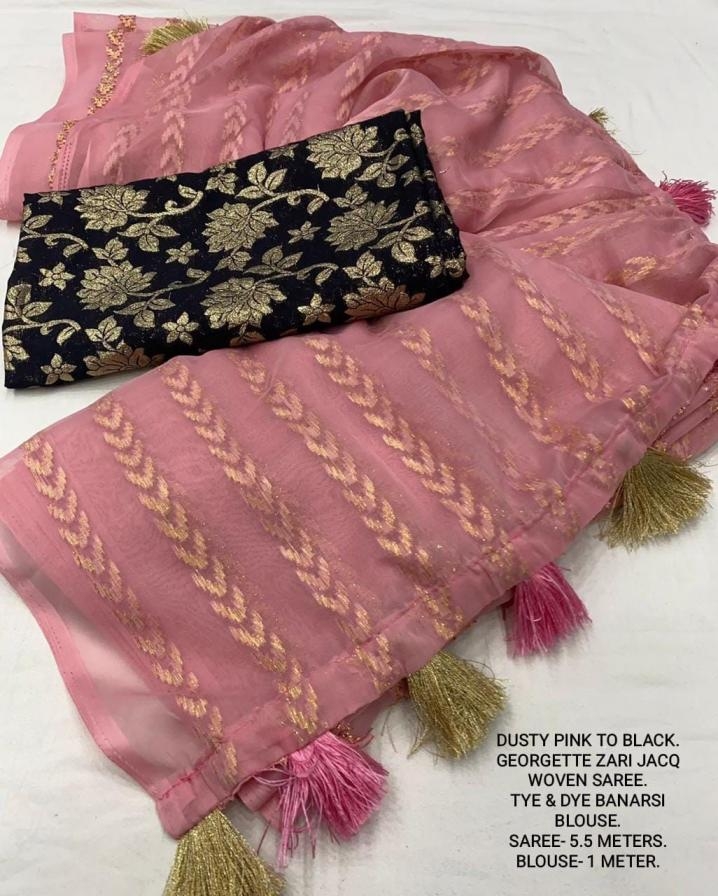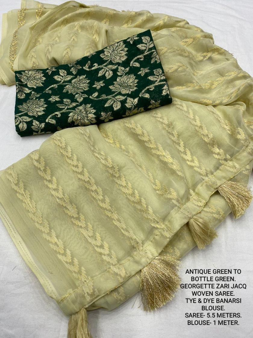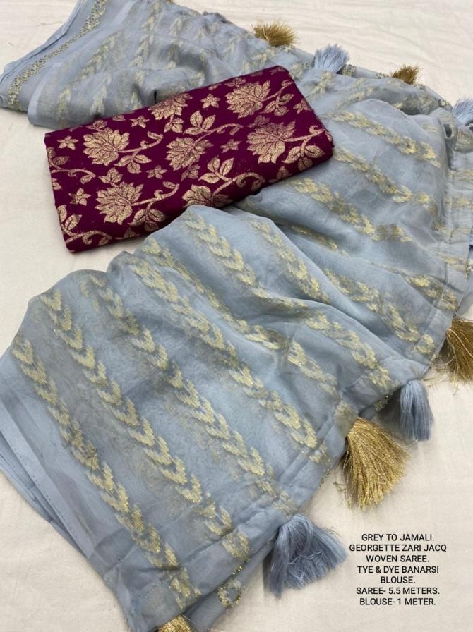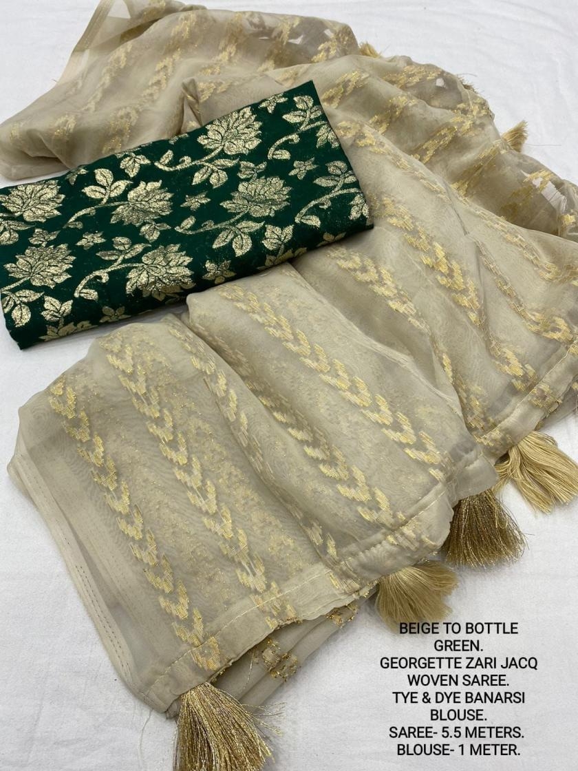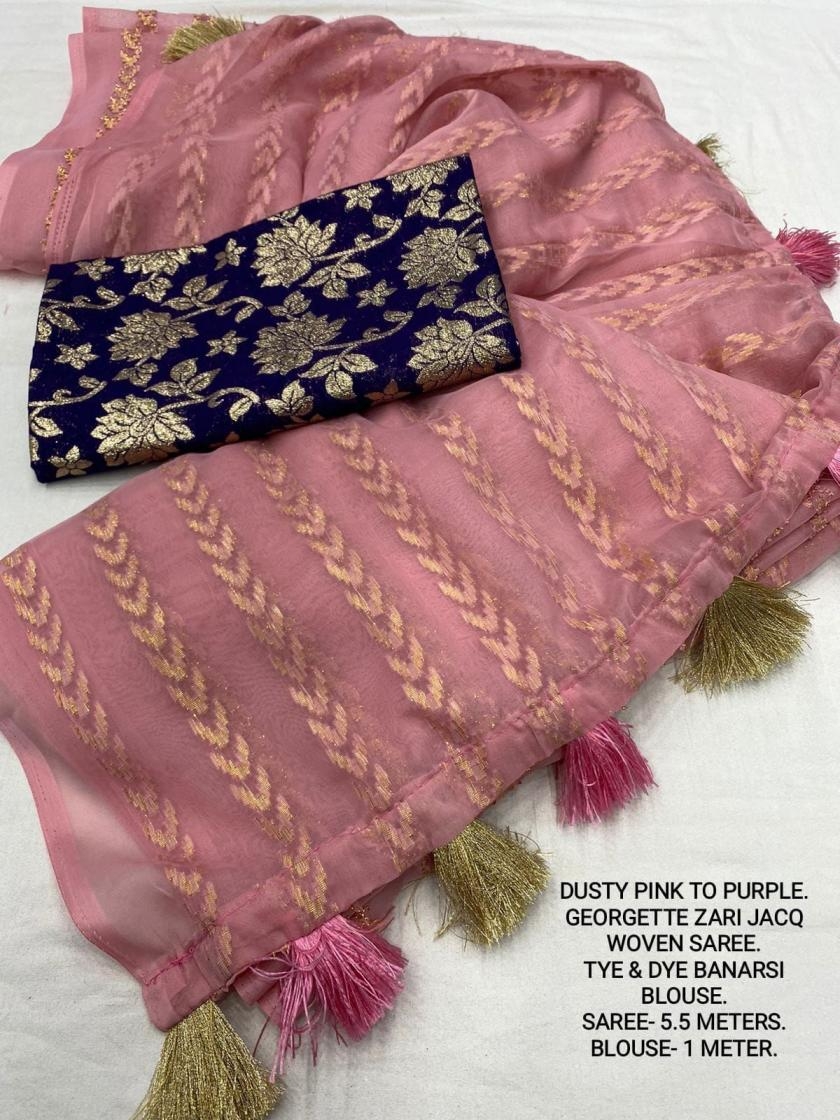 | Other Details: | best seller Kc- siya (arrow woven design) Quality- soft chiffon saree with allover zari woven jacq lining. Cotton Tassels on pallu. Blouse- pire banarasi silk tye and dye zaal design. Length- Rate - 895+ship Top trusted quality from kc |