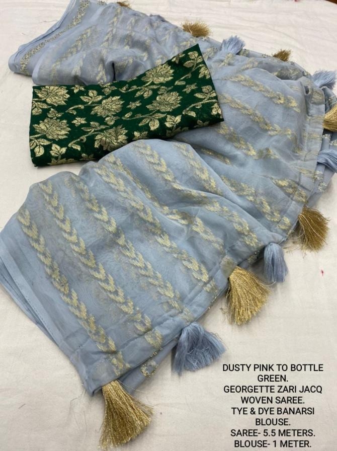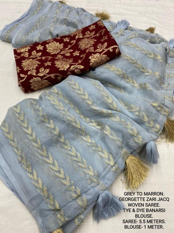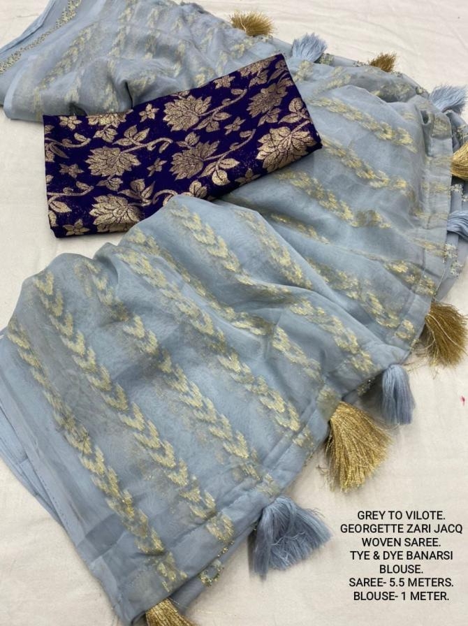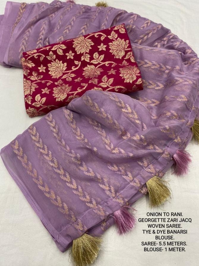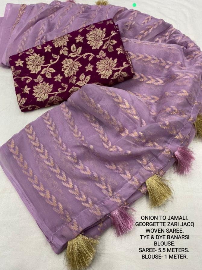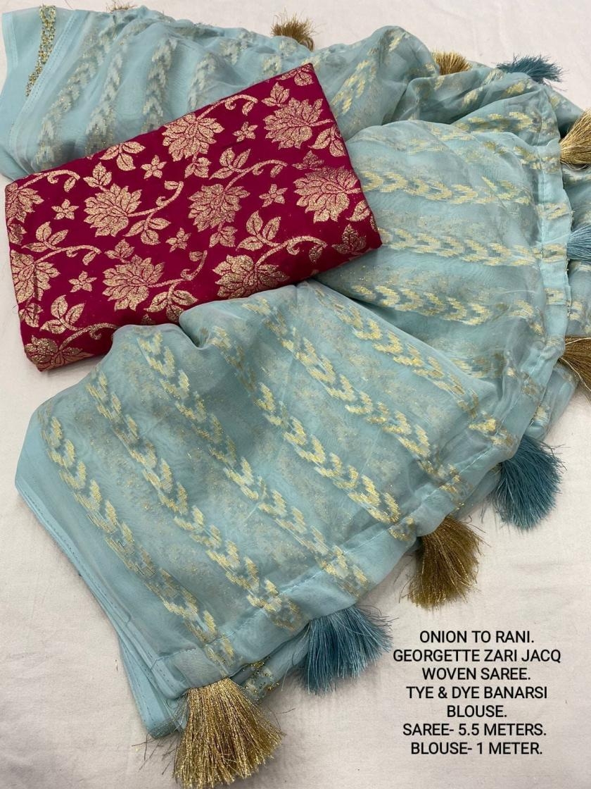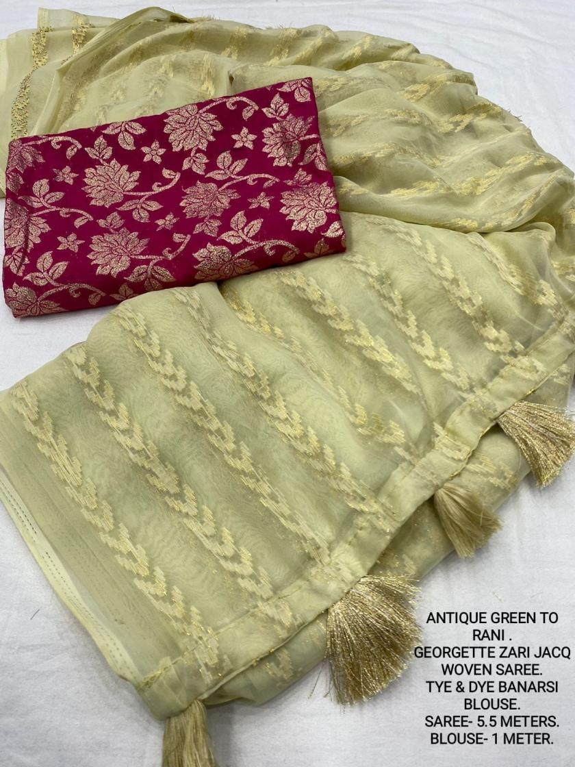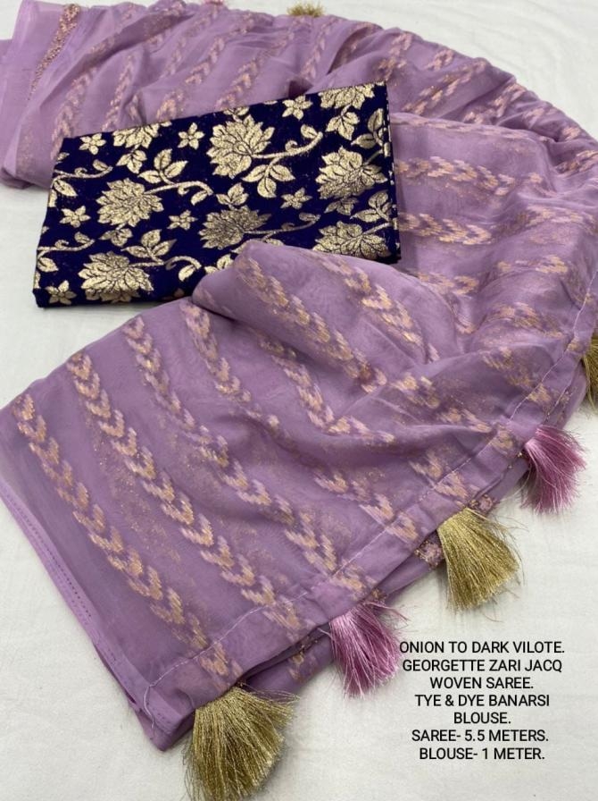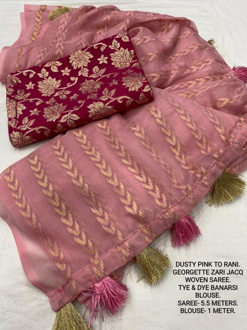 | Other Details: | best seller Kc- siya (arrow woven design) Quality- soft chiffon saree with allover zari woven jacq lining. Cotton Tassels on pallu. Blouse- pire banarasi silk tye and dye zaal design. Length- Rate - 895+ship Top trusted quality from kc |