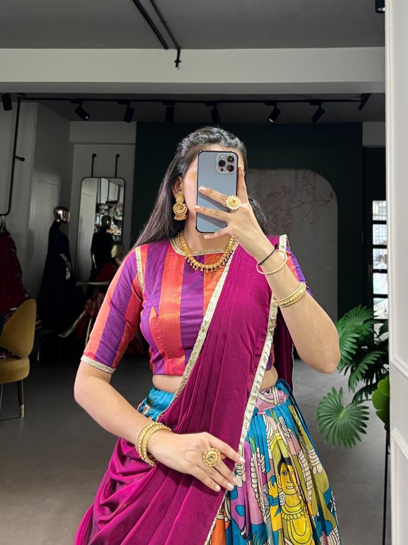 | Other Details: | 🌷Lehenga Choli🌷 Where timeless Kalamkari art meets the royal touch of Dola silk — a masterpiece of tradition and grace. 🍂 LNB1016PRL Lehenga (Stitched) Blouse (Stitched) Dupatta Weight : 1 kg |