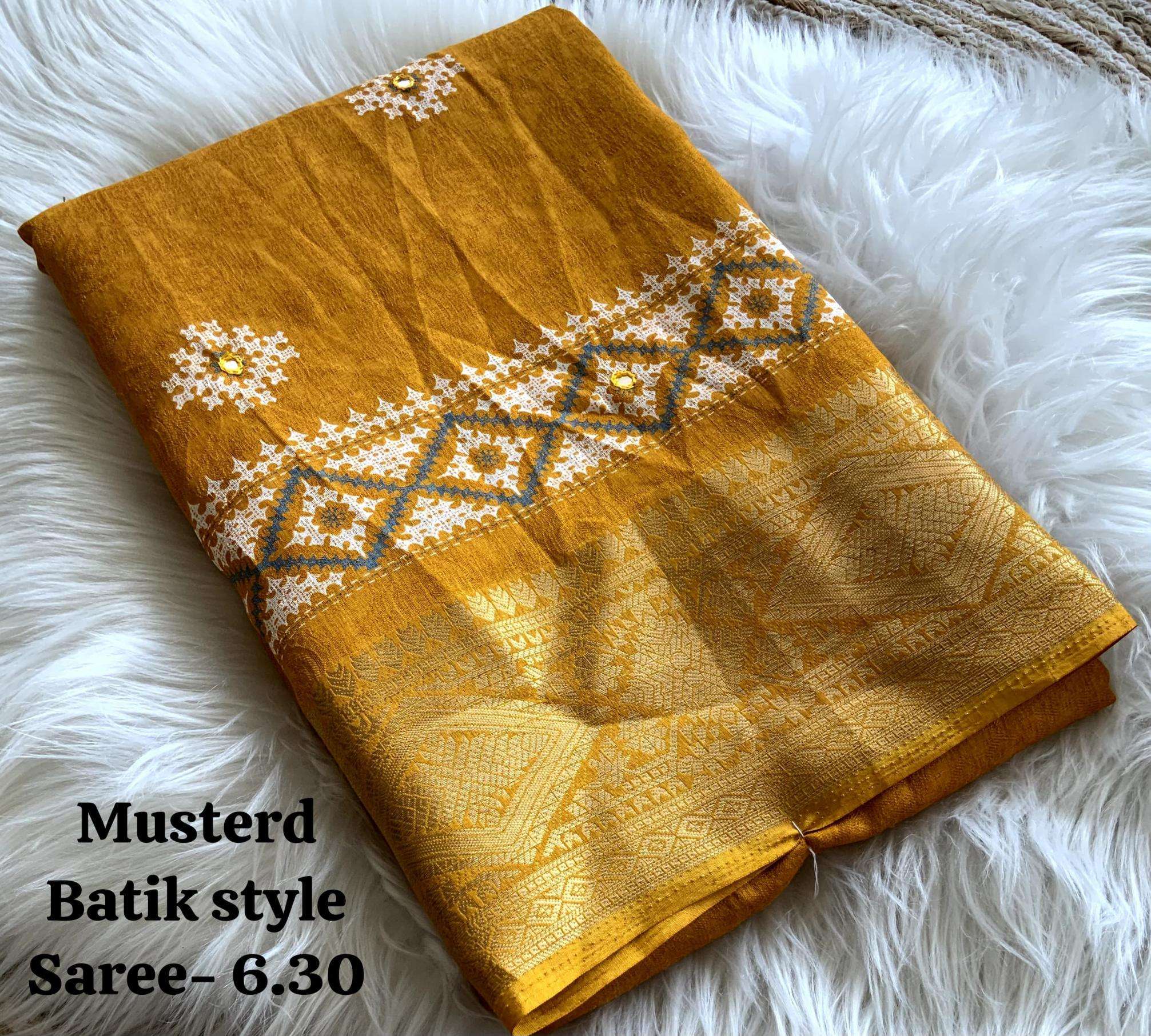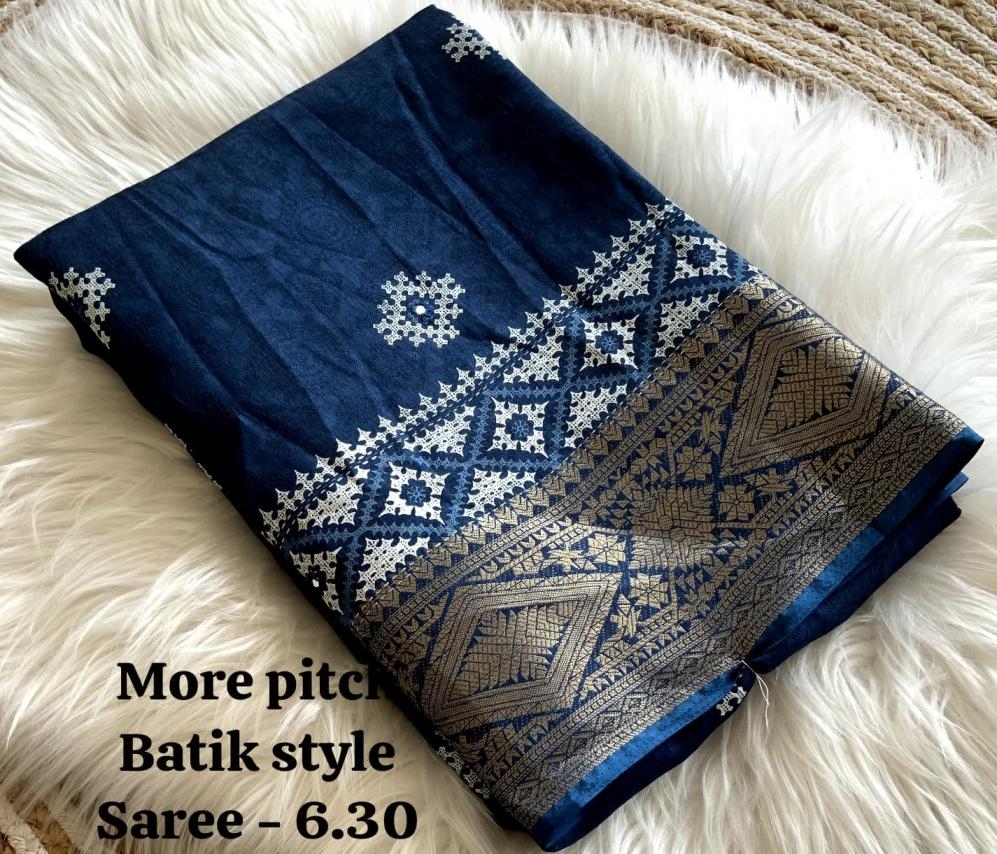| Other Details: | New Arrival AND - Nandini Crape Quality - soft cotton Crape Batik print with mirror work & Tassels woven zari border. Blouse - Running separate Print Blouse. Rate - 650+ship Top Trusted quality from AND |