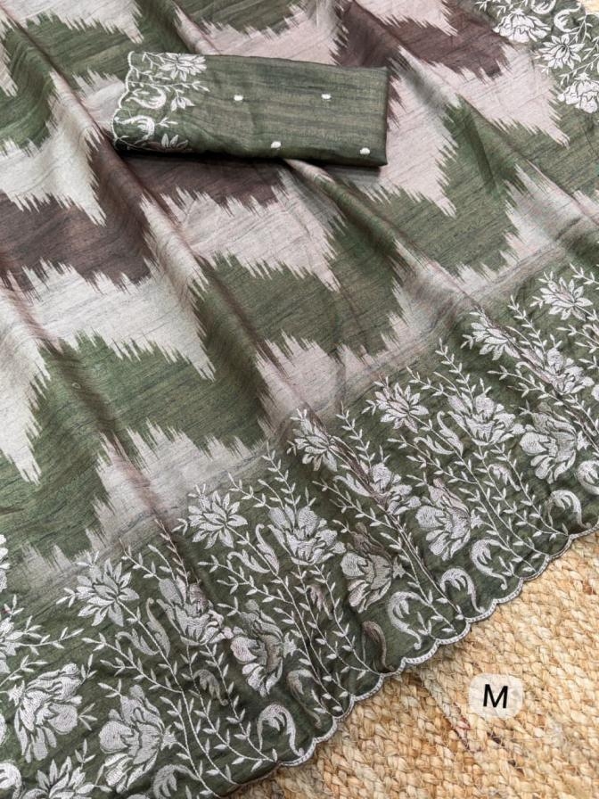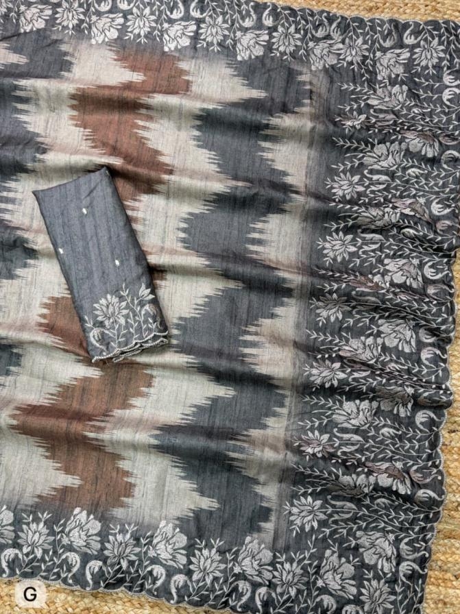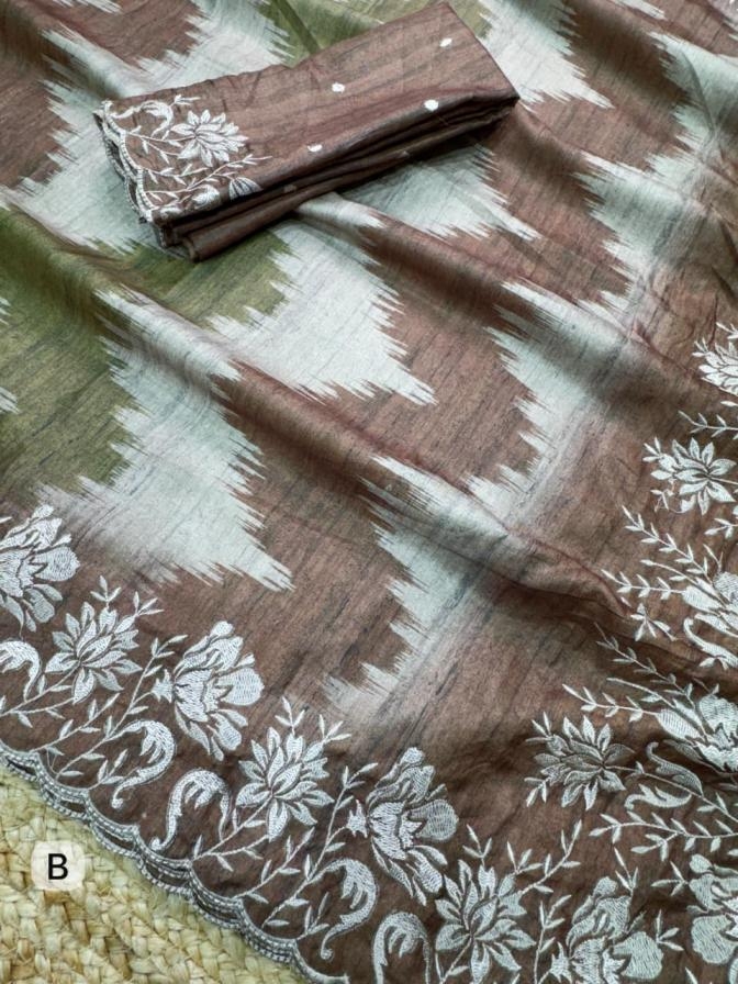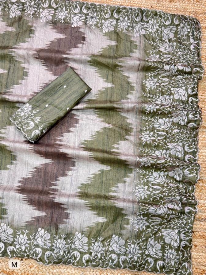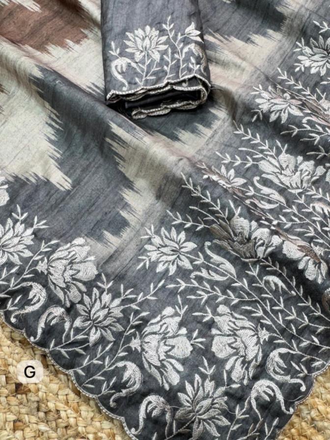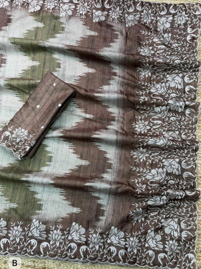 | Other Details: | Design-Nayra Wrapped in the poetry of heritage, this tusser silk digital print saree is where tradition meets pure grandeur. The rich tusser saree glows with fine thread kashmiri style Embroidery Fabric- Pattern- Rate : 1300/- +gst |