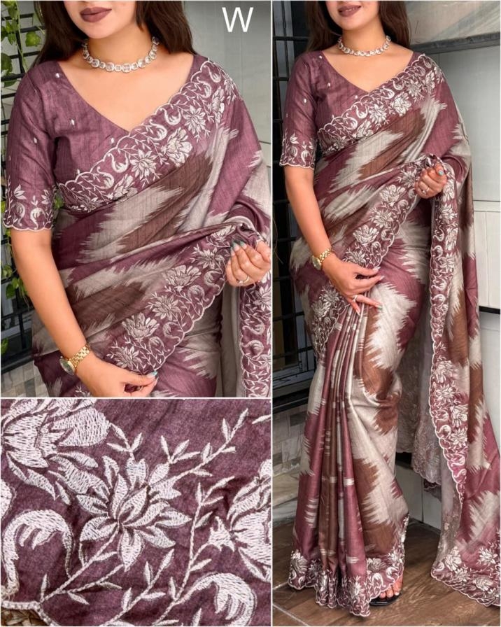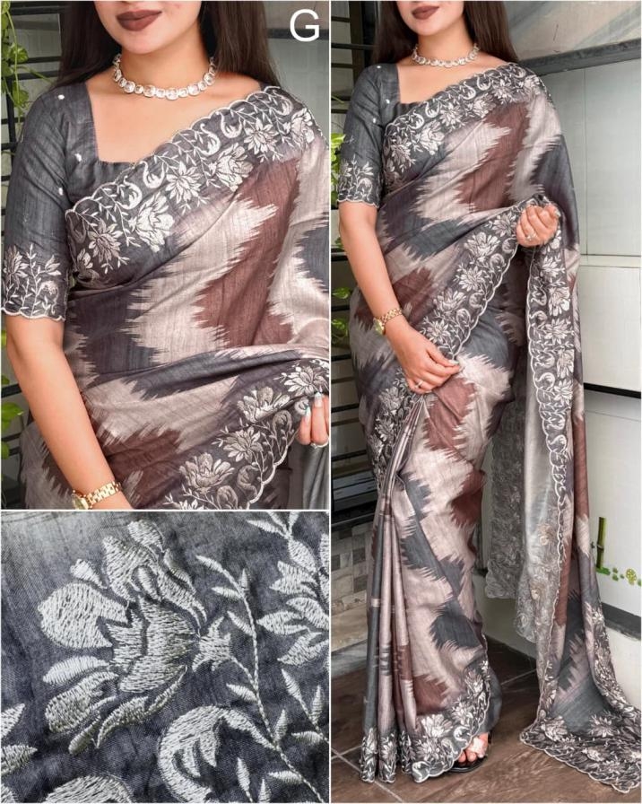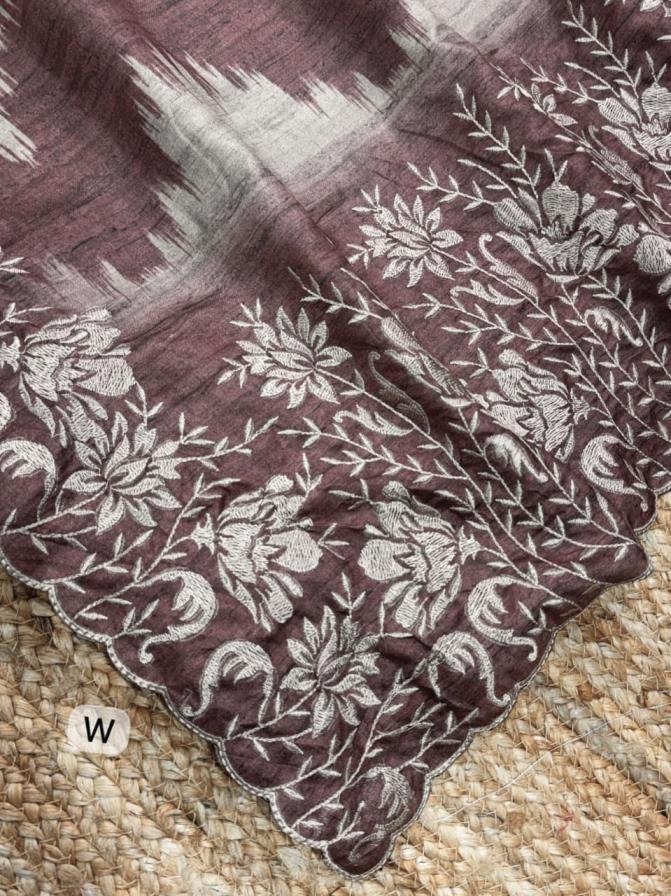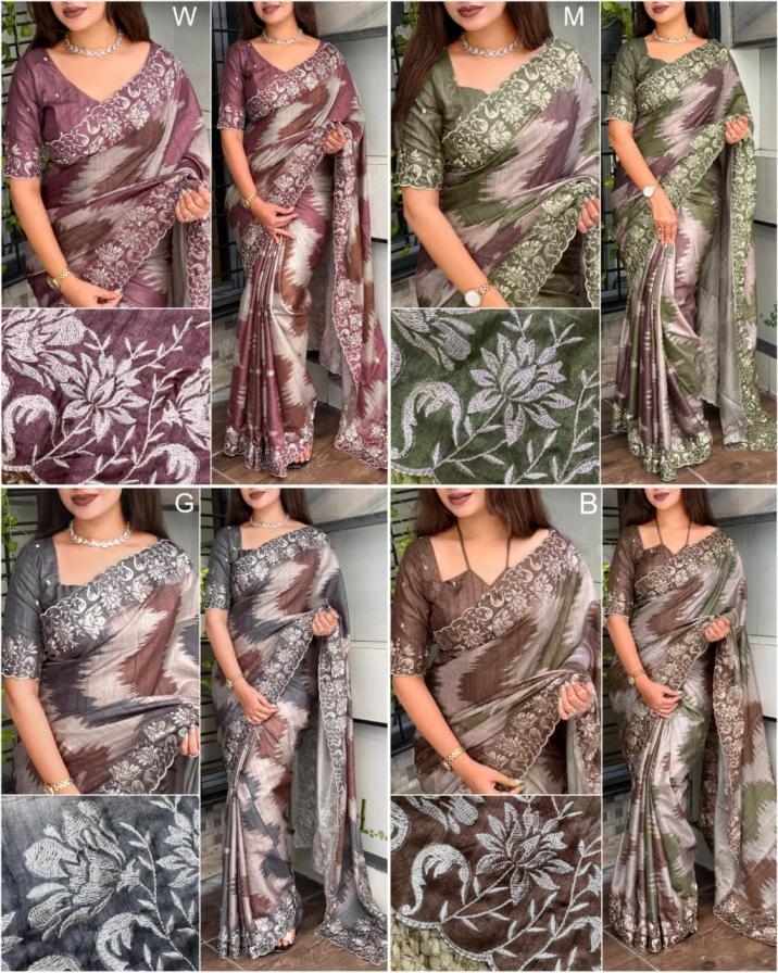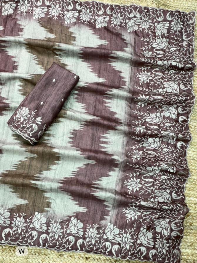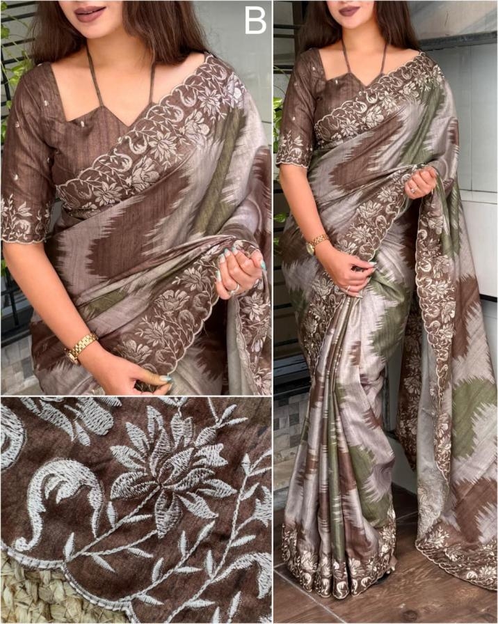 | Other Details: | Design-Nayra Wrapped in the poetry of heritage, this tusser silk digital print saree is where tradition meets pure grandeur. The rich tusser saree glows with fine thread kashmiri style Embroidery Fabric- Pattern- Rate : 1300/- +gst |