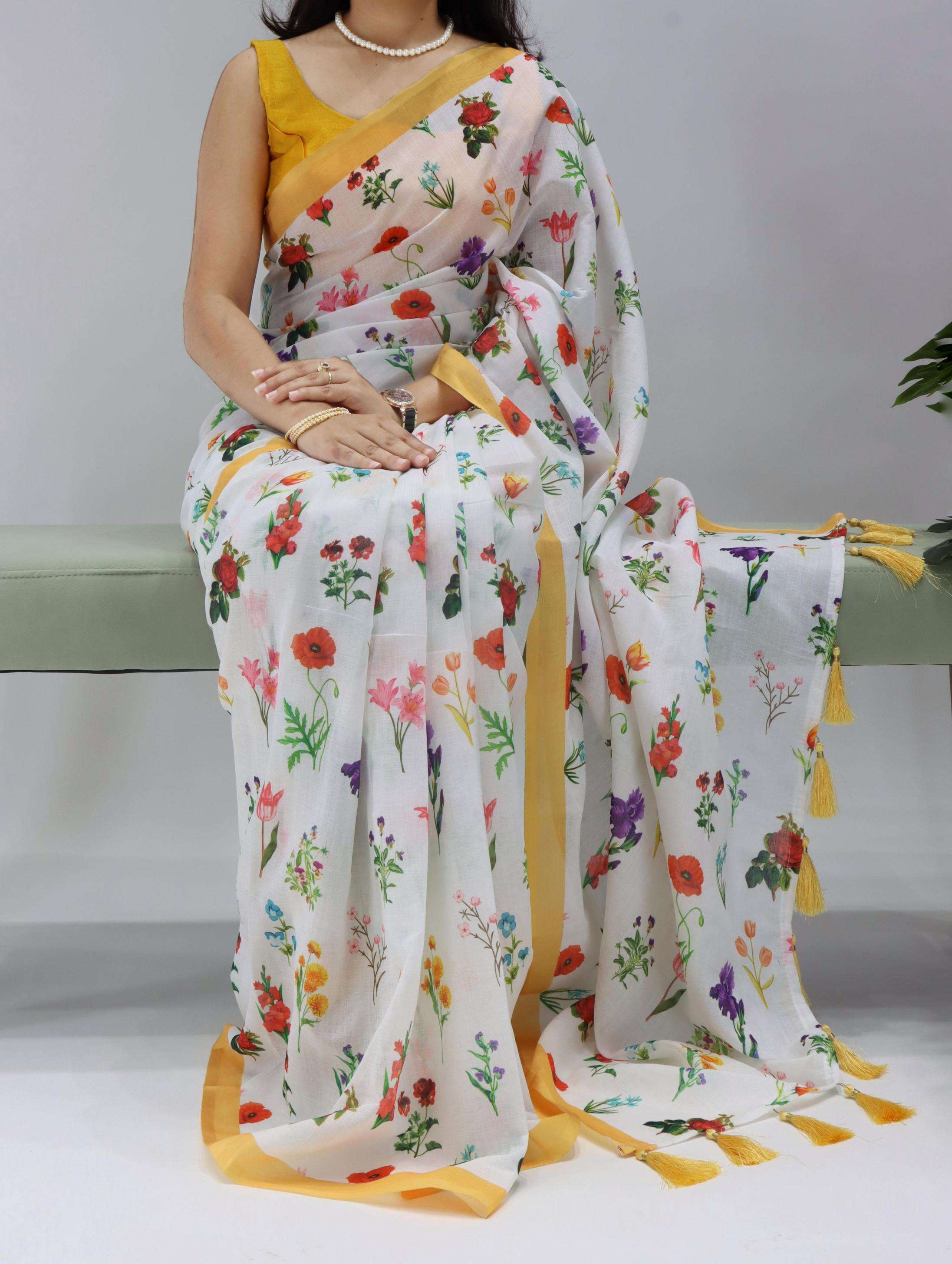 | Other Details: | 👜Floral Linen Printed Saree With Printed Blouse 👜💯 Linen is known to be a healing fabric, as the colors, motifs and the narration of magical forms create an aura that heals an individual physically and spiritually. Shop the Most Beautiful Floral Sarees. YS1201PRPL Saree Details Fabric : Linen Blouse Color: Matching As per Border Price: 549/-