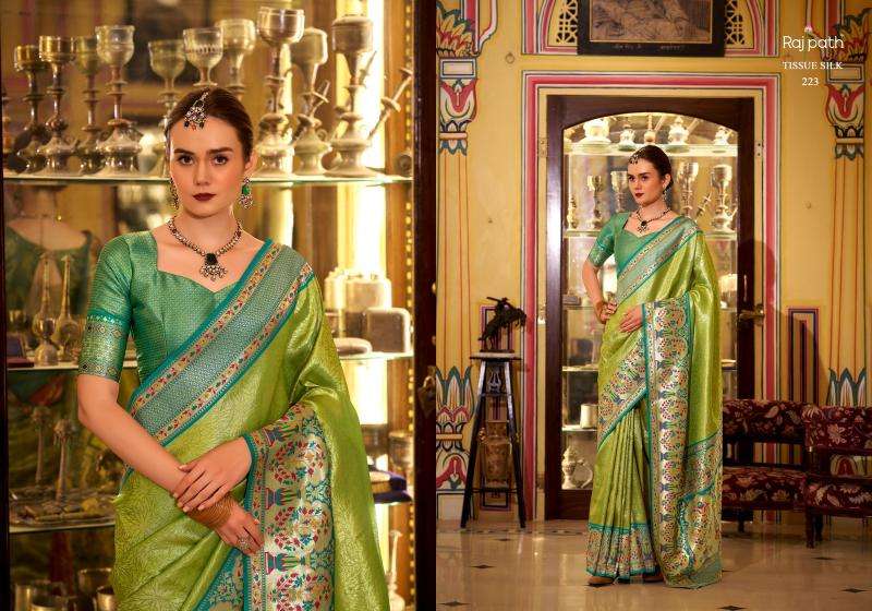 | Other Details: | Elegance personified Soft Tissue meets vibrant Colour creating a stunning combinations sophisticated charm on silk, perfect for making a statement Saree Brand - Rajpath Catalog Name -Virashat Silk Series :-223 to 228 Rate : 1895/- +5%GST Fabric: Soft Tissue Silk With Weaving Work Saree Blouse: Soft Tissue Silk Occasion: Party Wear, Festival Wear |