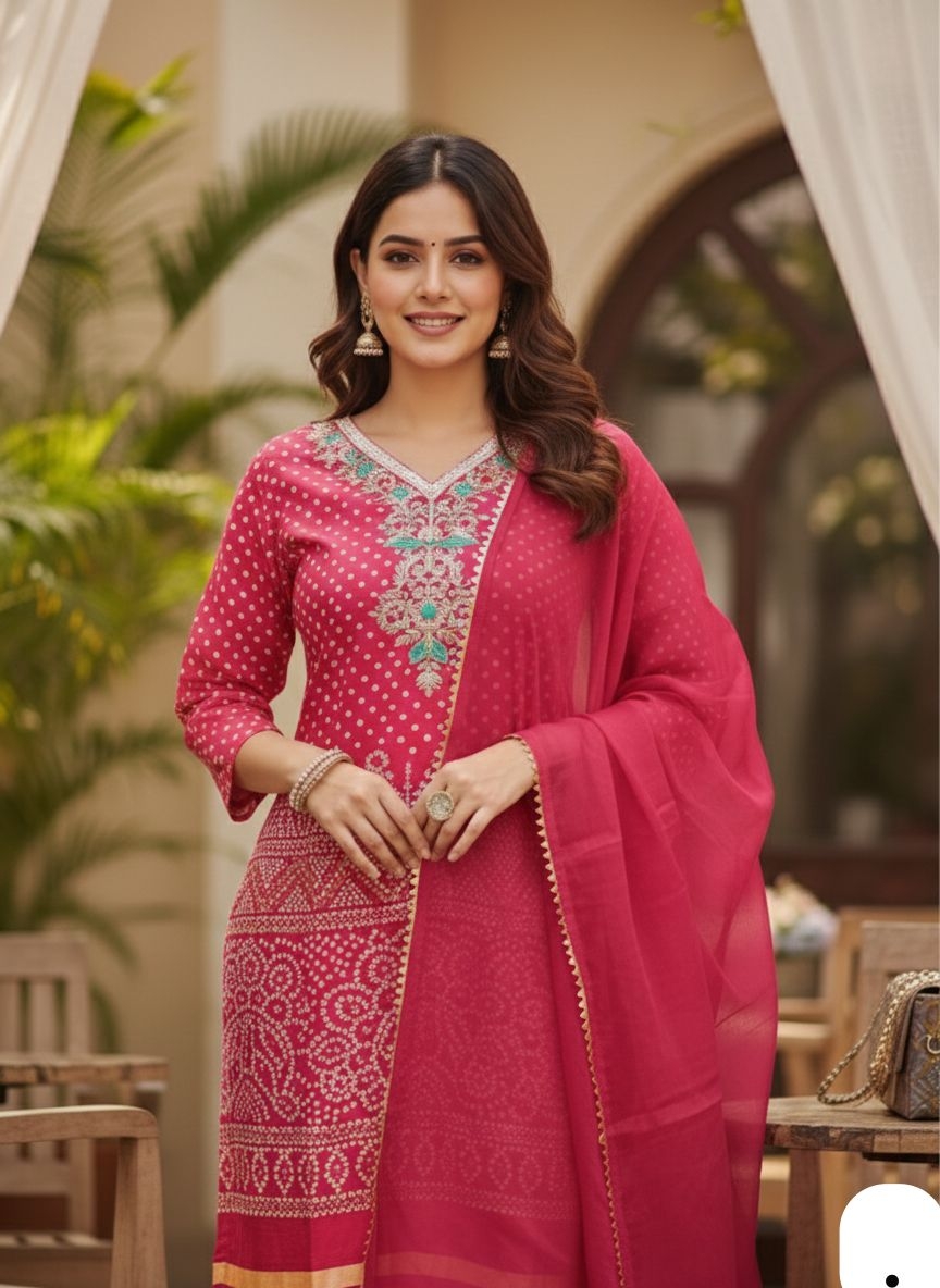 | Other Details: | launching a beautiful rani pink And maroon Bandhani-print Salwar Kameez set. It has a very elegant, traditional vibe that works perfectly for festive occasions or semi-formal gatherings. Colours:-2 Fabric :- chinon Work:- thread embroidery Length:- 45 Bottom length:- 40 Size :- M(38) Price :- 499 Ready to ship 🚢 |