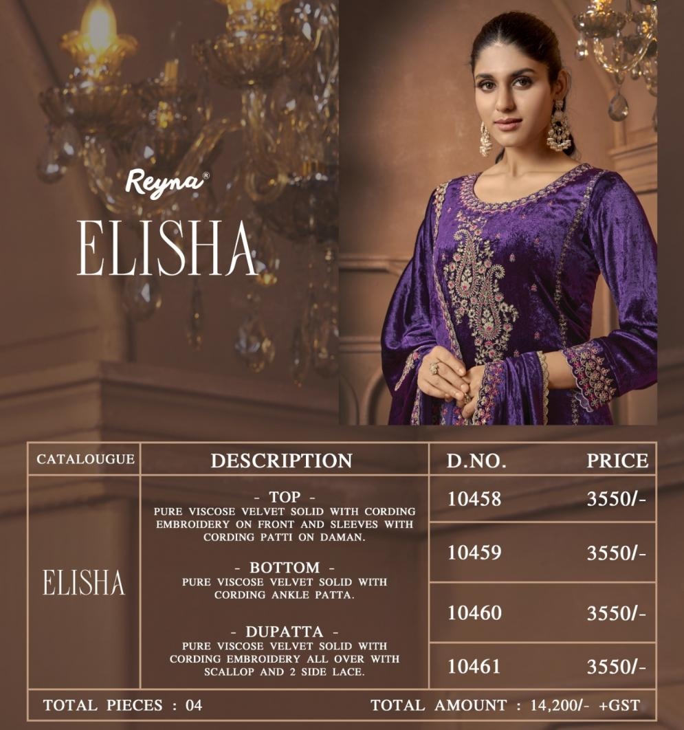 | Name: | Reyna Elisha Series 10458 To 10461 Viscose Velvet Solid Design Salwar Kameez In Wholesale Surat |