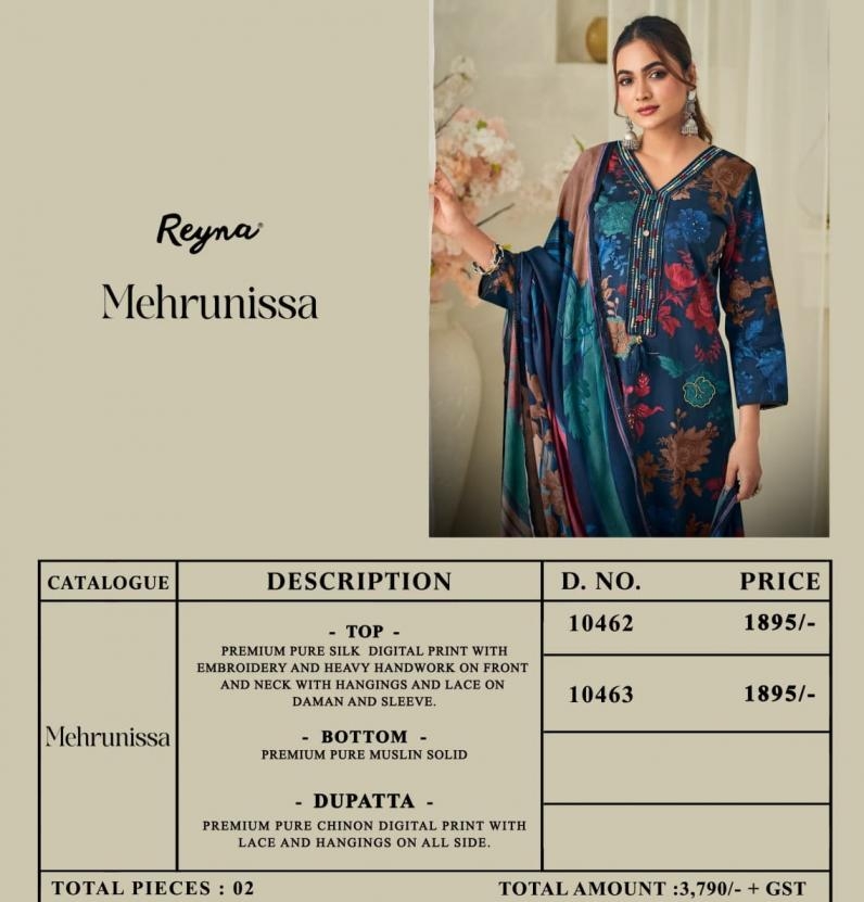| Name: | Reyna Mehrunissa Series 10462-10463 Silk Digital Print Wholesale Suit |