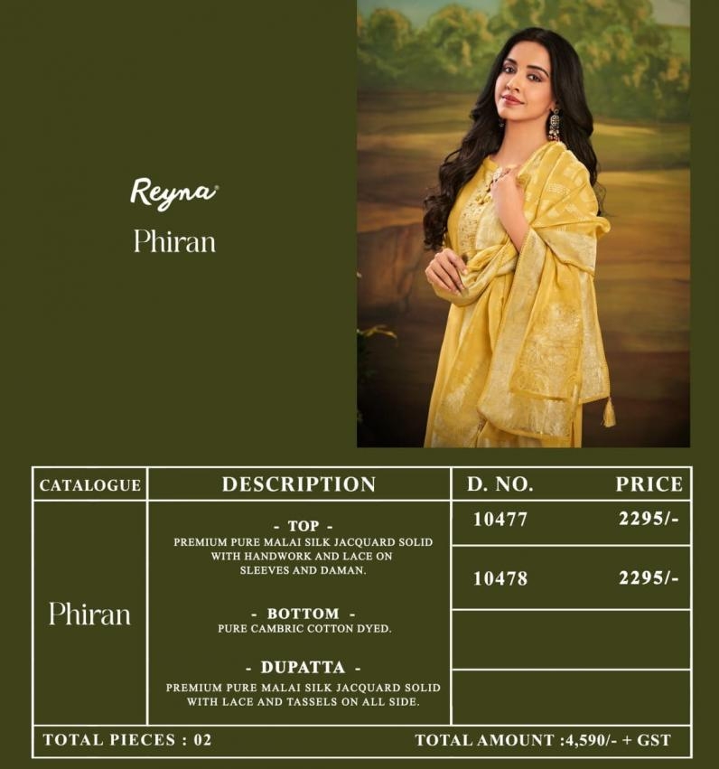 | Name: | Reyna Phiran Series 10477-10478 Malai Silk Jacquard Wholesale Suit | |