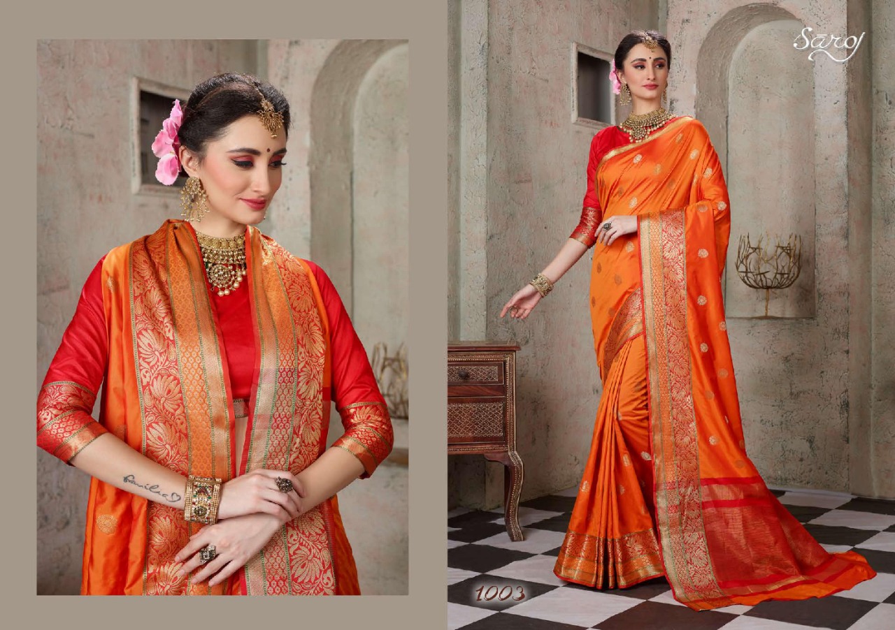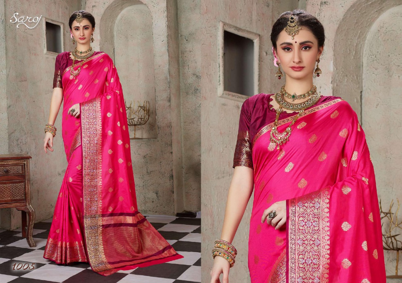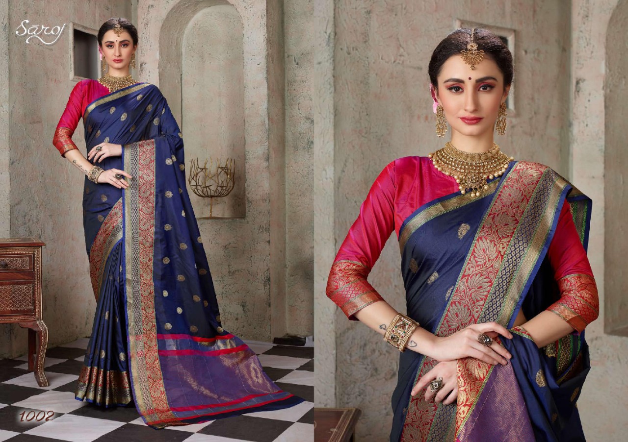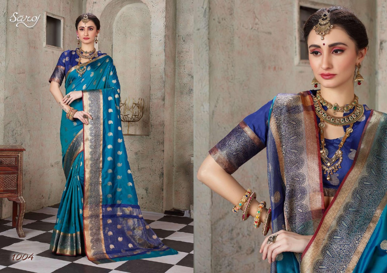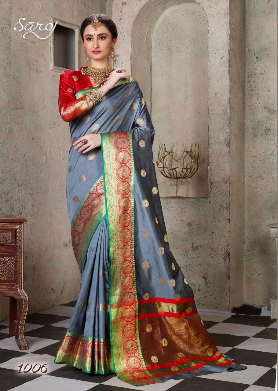 | Other Details: | SAROJ Rumani (Rs.765) Fabric: weaving silk with viscoss border. Blouse: Silk cotton. 6 Designs |