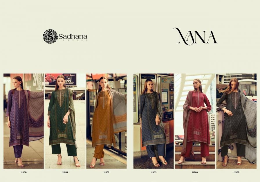 | Name: | Sadhana Fashion Nana Series 11500-11505 Viscose Pashmina Wholesale Suit | |