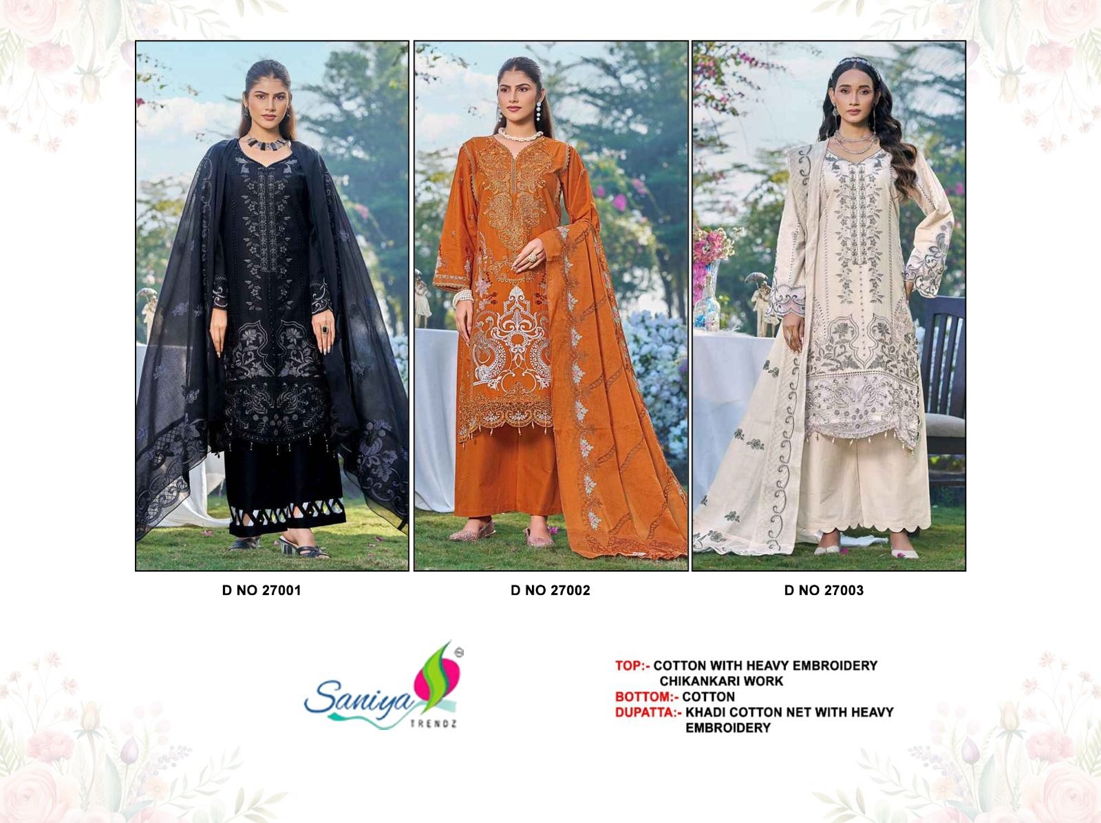 | Other Details: | BRAND NAME:-SANIYA TRENDZ D NO:- Top:- COTTON WITH CHIKANKARI EMBROIDERED RATE:-1151/- |