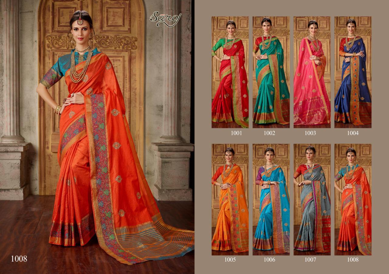 Other Details: | *Shubhmuhrat by Saroj * Rate -715 per pcs . Set to set . GST 5 Percent Extra. Delivery 3-4 days Fabric: Cotton Silk with embroidery work butti. Blouse: Banglori Silk. 8 Designs In set. Set to set . |