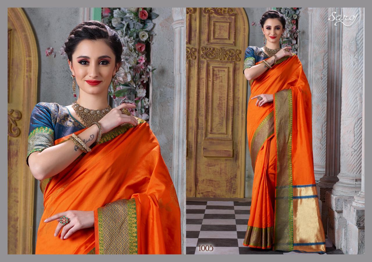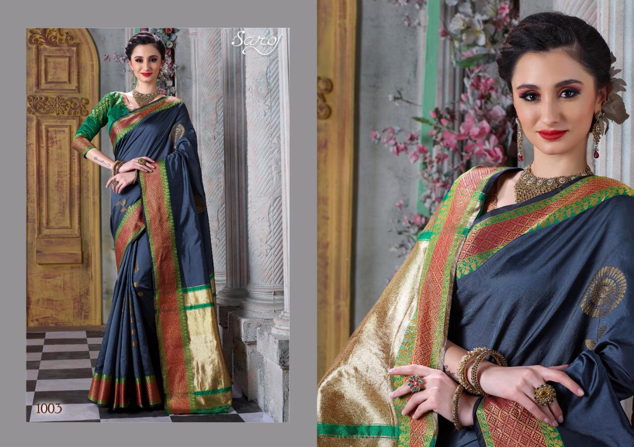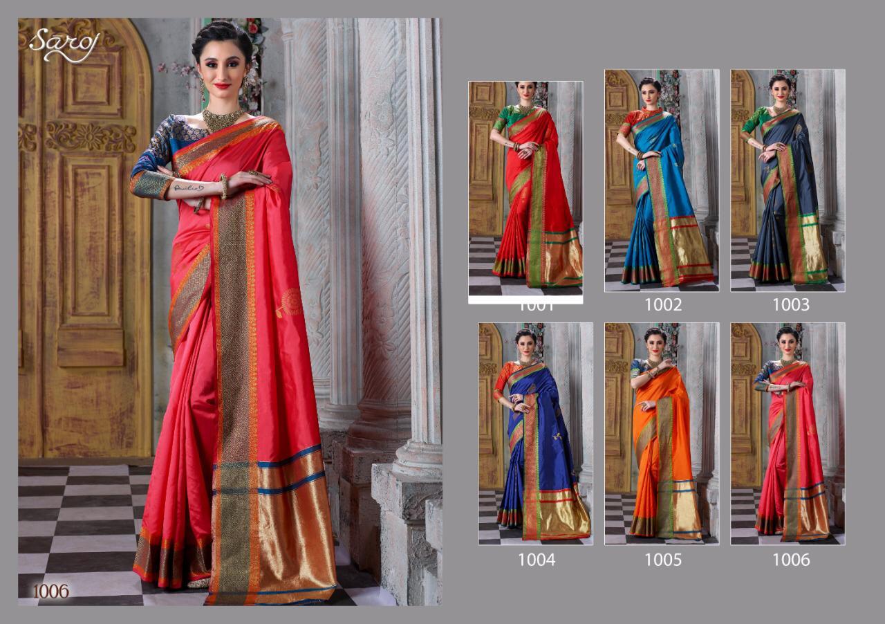 Other Details: | *Mitali by Saroj * Rate – 915 per Pcs . Fabric: Cotton Silk with chit pallu. Blouse: Silk. 6 Designs in set . Set to set . GST 5 Percent Extra. Delivery 2 days |