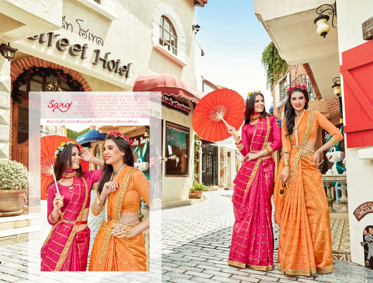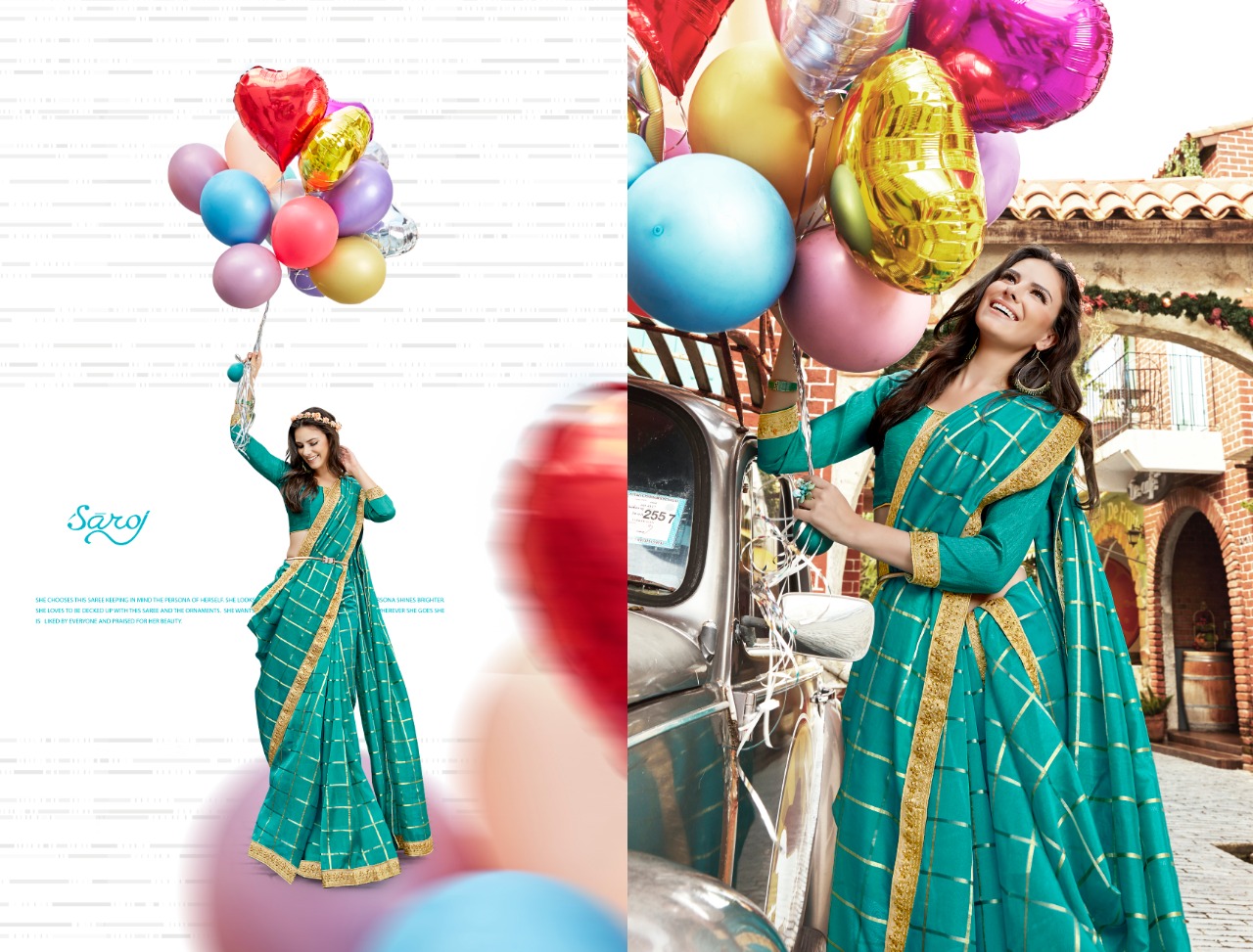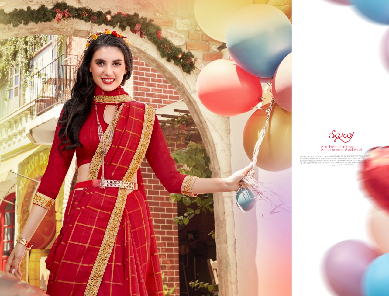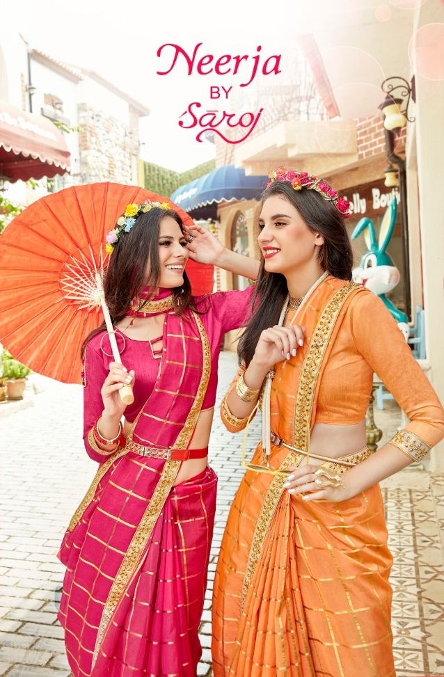 Other Details: | SAROJ Neerja (Rs.1595) Fabric: Organza with sattin checks. Blouse: Dupion Silk. 8 Designs |