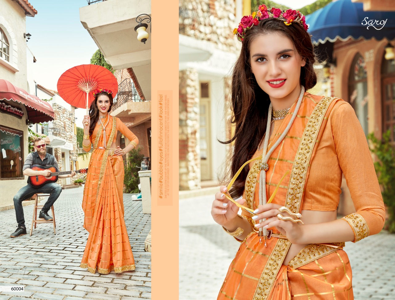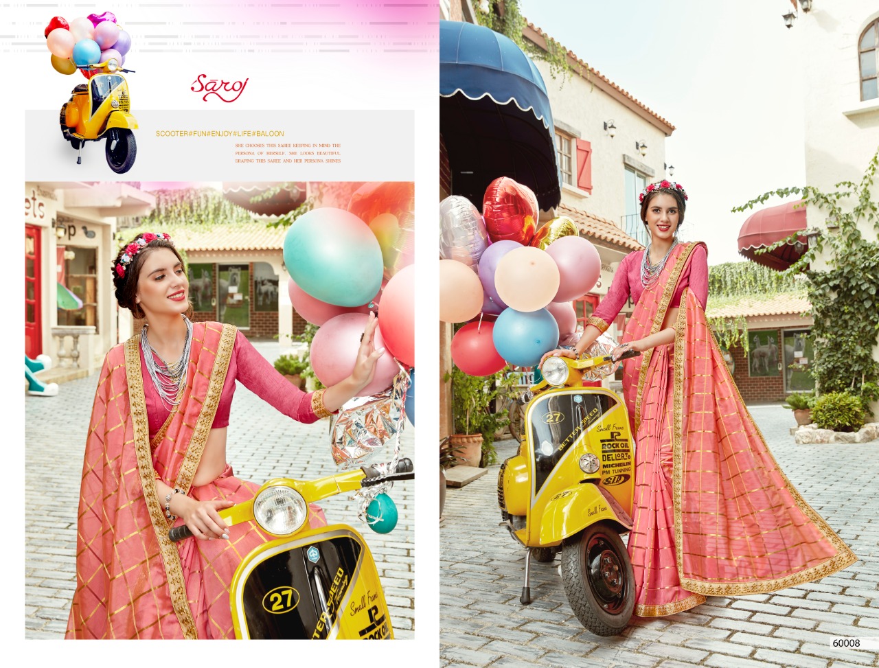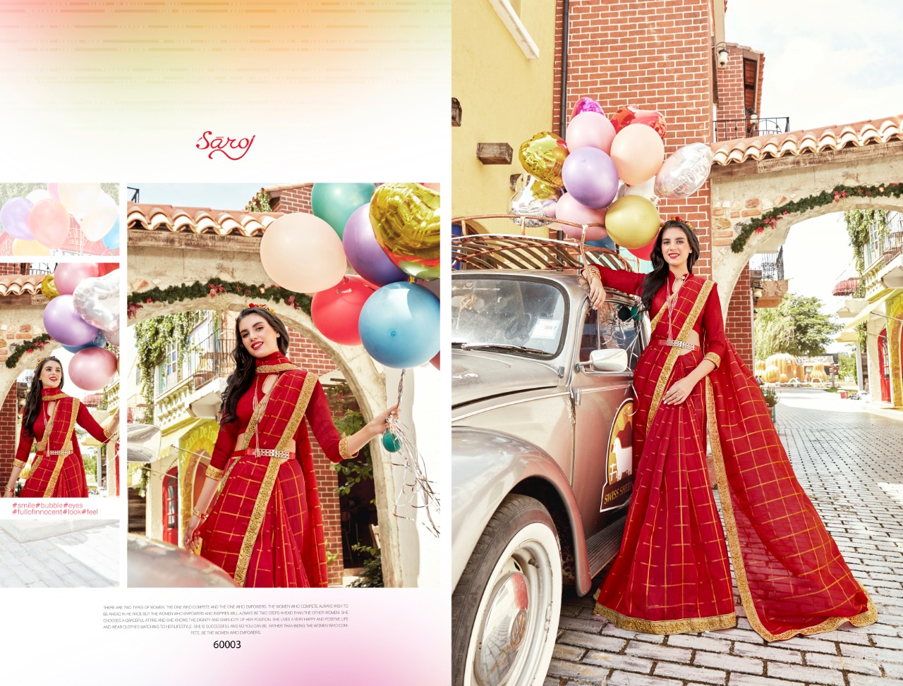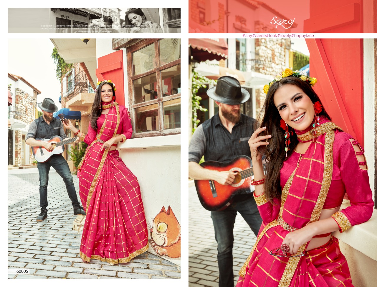 Other Details: | SAROJ Neerja (Rs.1595) Fabric: Organza with sattin checks. Blouse: Dupion Silk. 8 Designs |