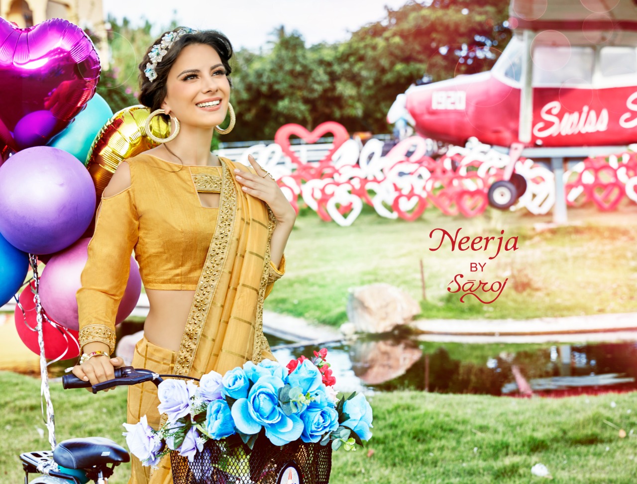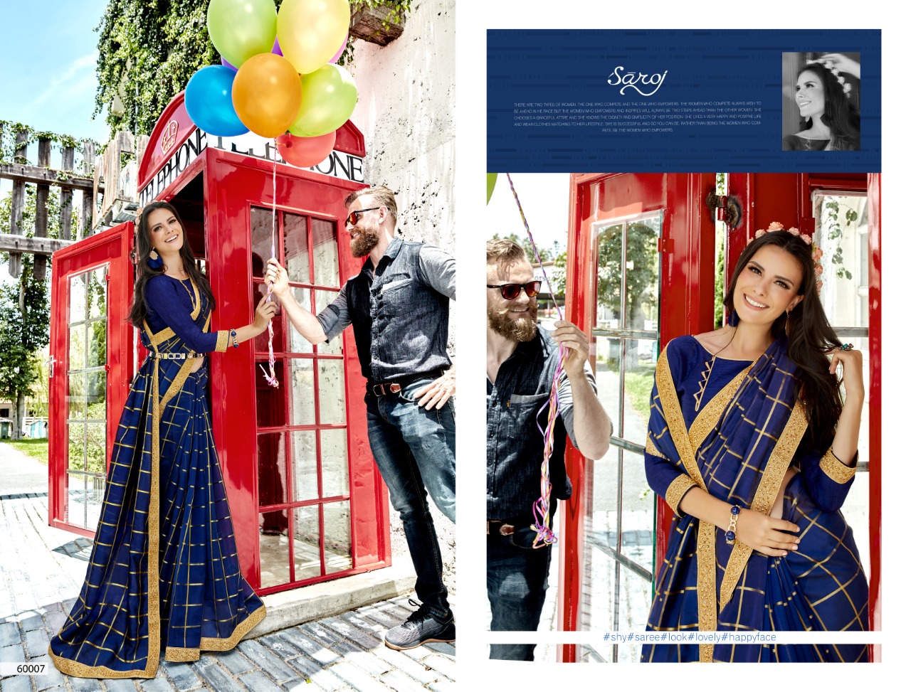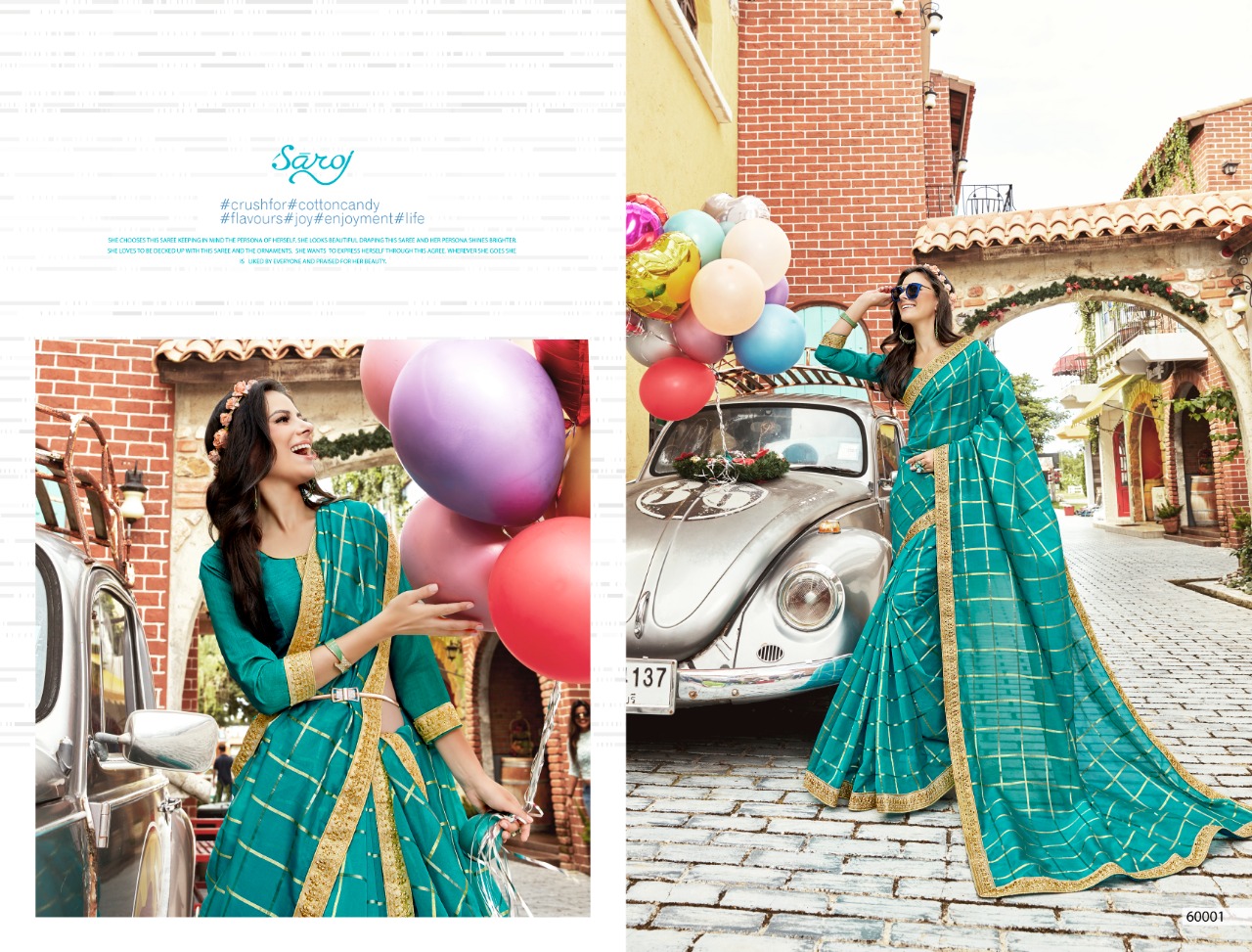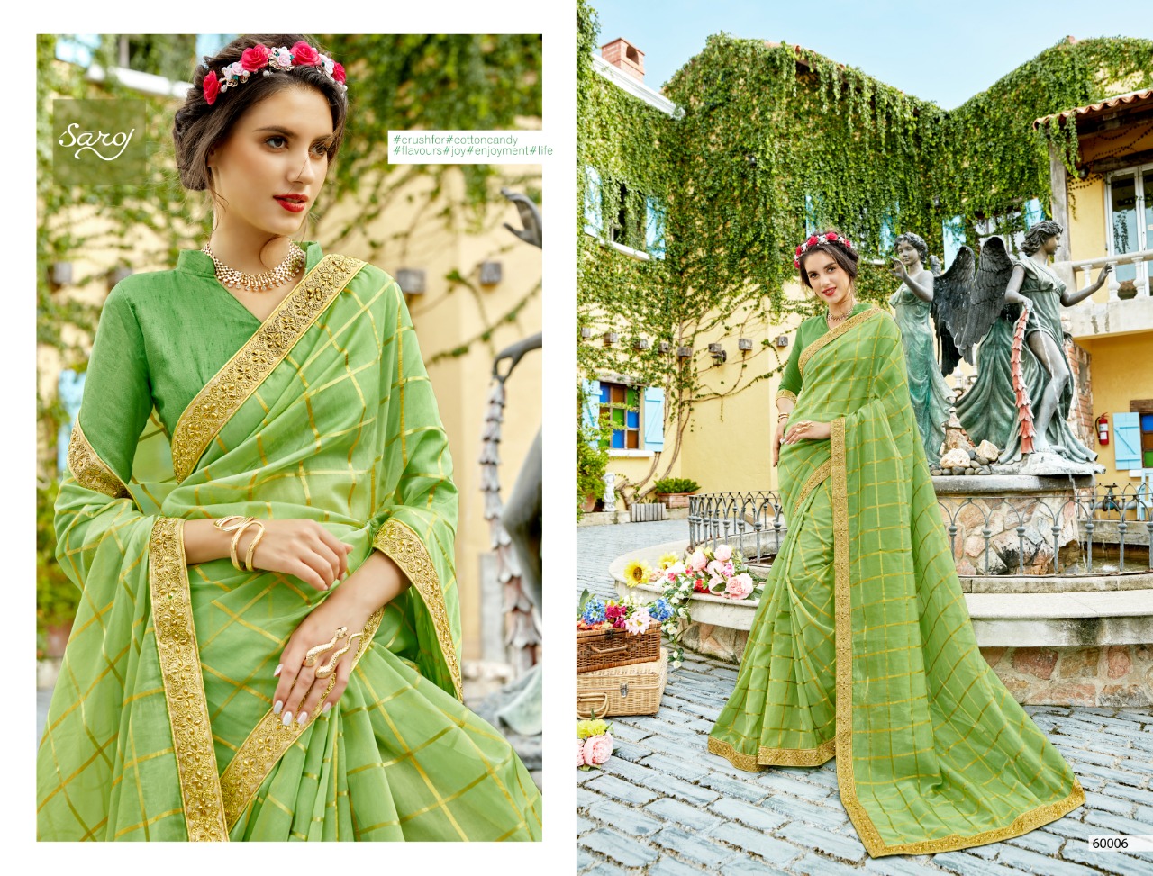 Other Details: | SAROJ Neerja (Rs.1595) Fabric: Organza with sattin checks. Blouse: Dupion Silk. 8 Designs |