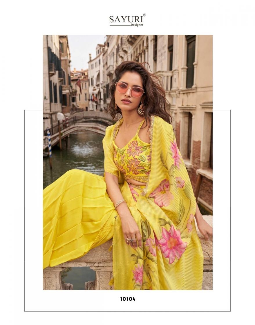 Name: | Sayuri Designer Melodi Series 10100 To 10104 Chinon Silk Fully Stitch Kurti Plazzo & Shrug In Wholesale Surat |