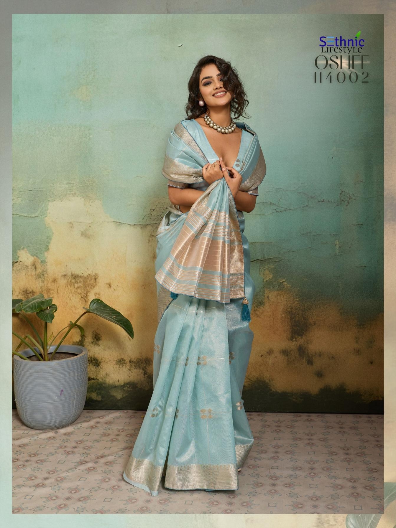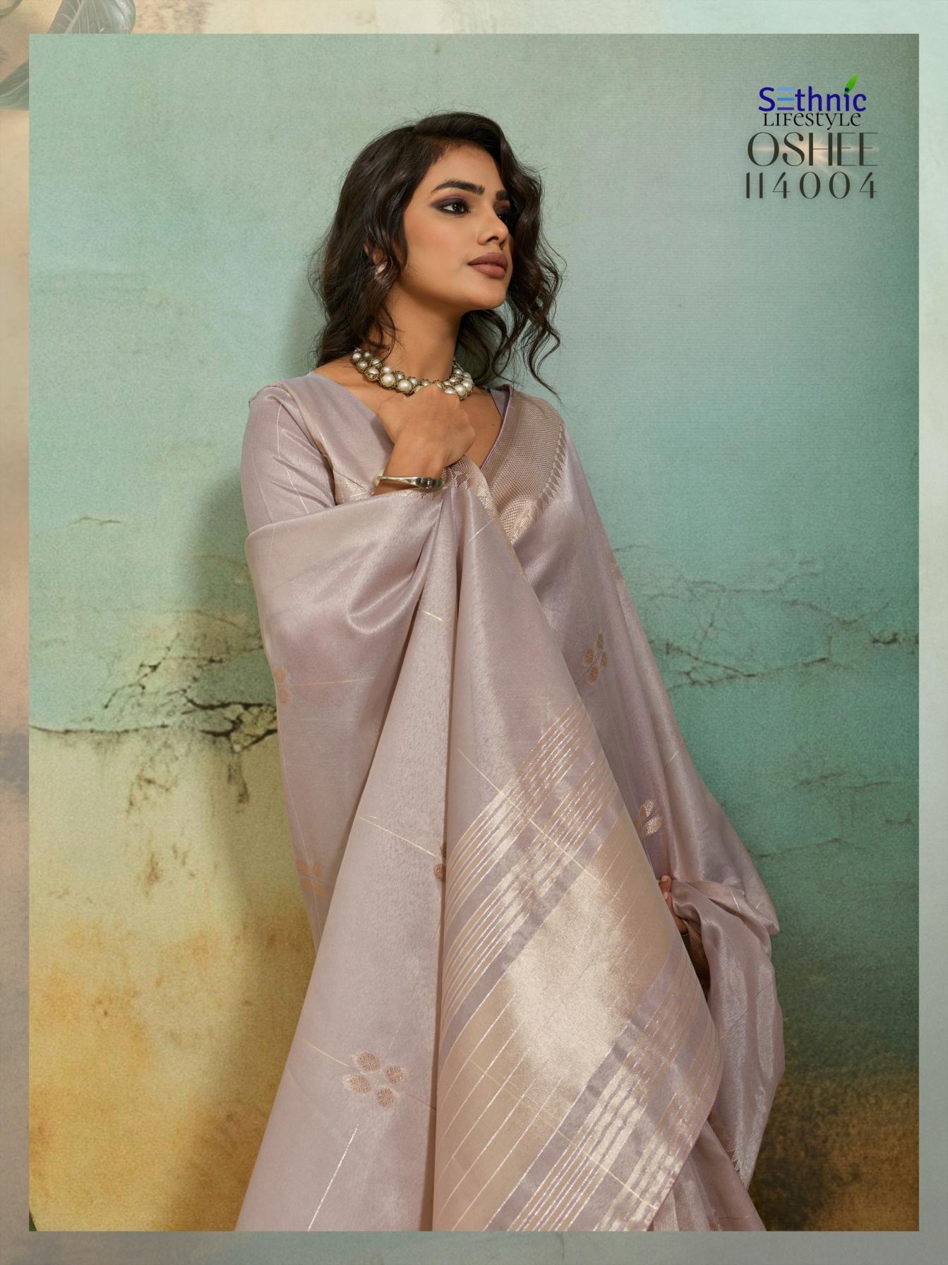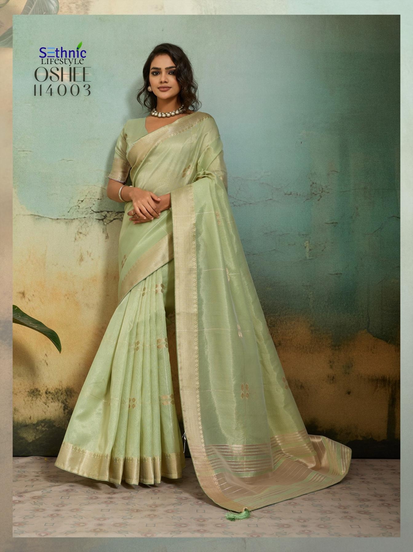 | Other Details: | There is a quiet power in a drape that breathes. Oshee Vibe is our tribute to the shimmering heat of summer, captured through the honest texture of Linen and the ethereal glow of Tissue. Brand : Sethnic Lifestyle Catalog: Oshee Saree Fabric : Tissue Infused Linen Work : Zari Woven | Patta | Chit Pallu | Small Buttis all over Blouse : Running Embellishment : Accent Piping with attractive Tassels Rate : ₹ 849/- + 5% GST |