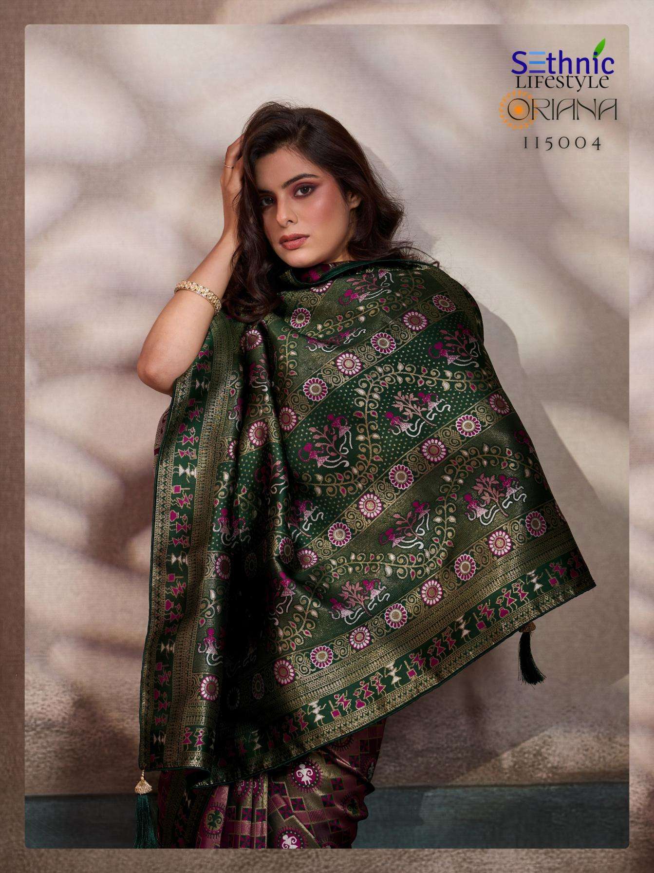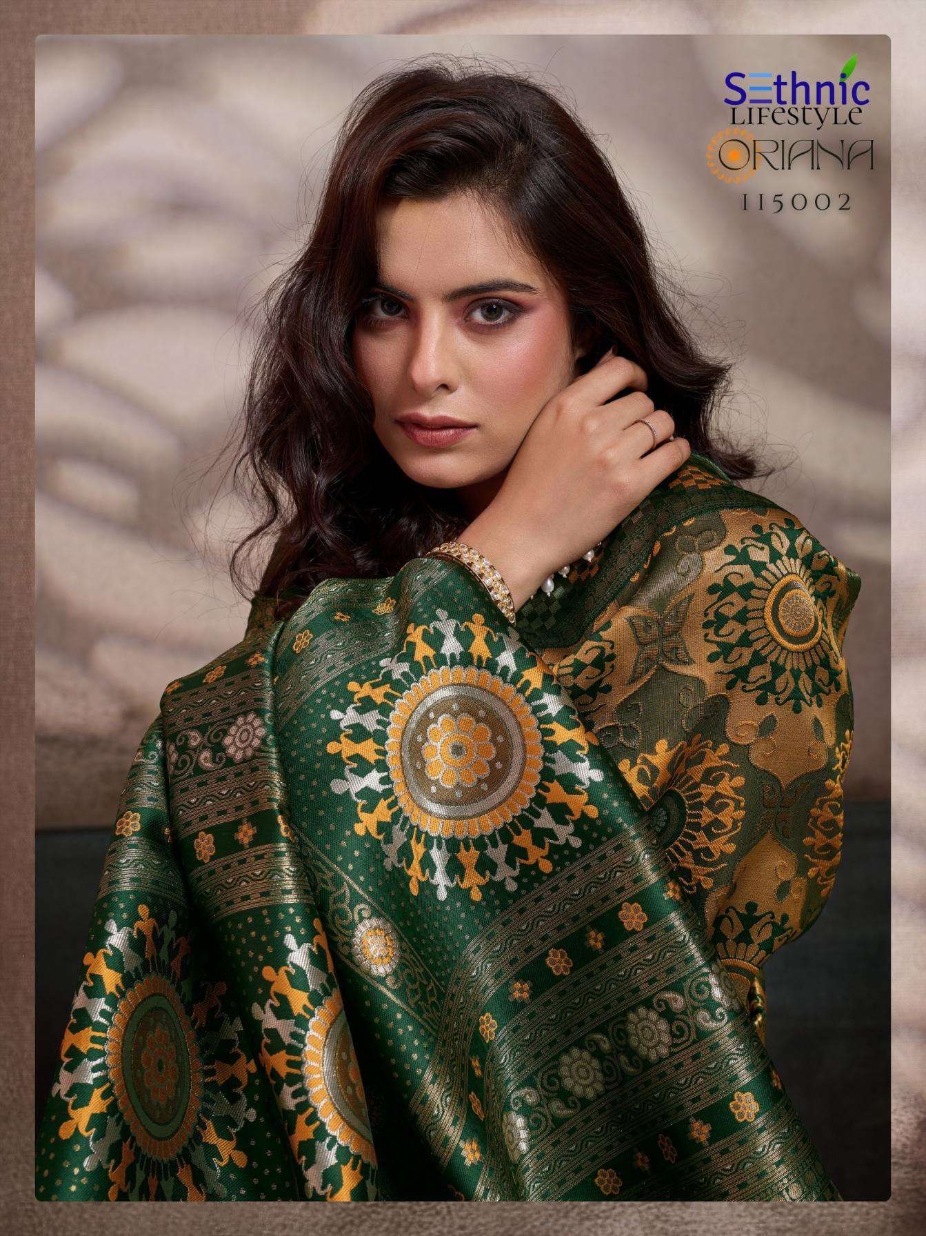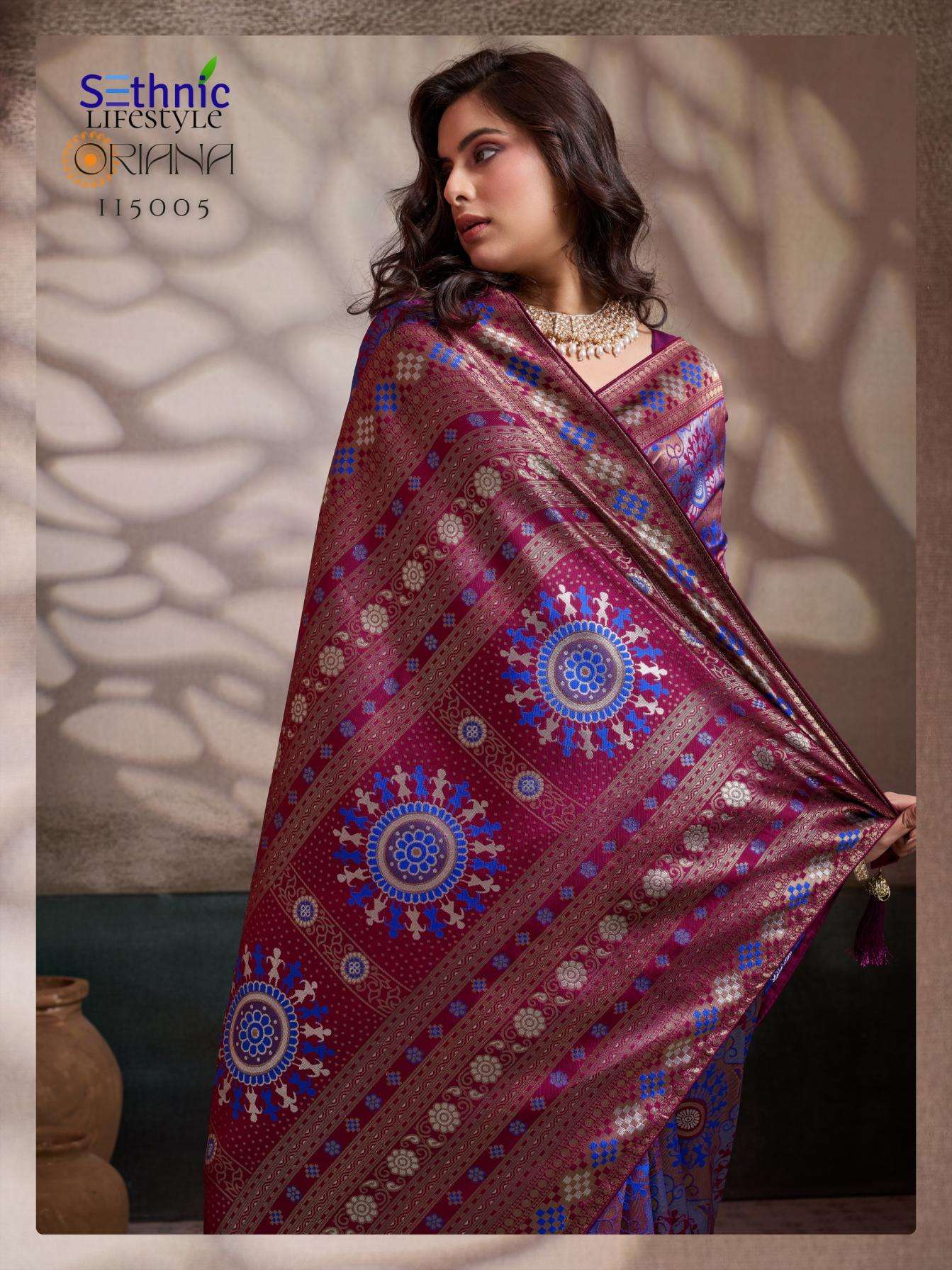 | Other Details: | Every weave in this collection is features intricate Meenakari artistry, a shimmering Rich Pallu, and the signature KONARK-inspired mandalas that define the heritage aesthetic. Finished with a couture blouse, delicate piping, and handcrafted tassels, Oriana is designed for the woman who finds luxury in the stories woven into her attire. Brand : Sethnic Lifetstyle Catalog Name : Oriana Series : 115001 TO 115006 Saree Fabric : Soft Silk Work : Zari, Meenakari Woven Blouse : Running with Sleeve Pattas Embellishment : Piping & Complimentary Tassels Rate : 899/- + 5% GST |