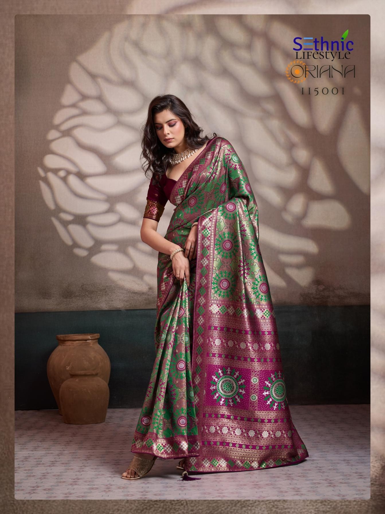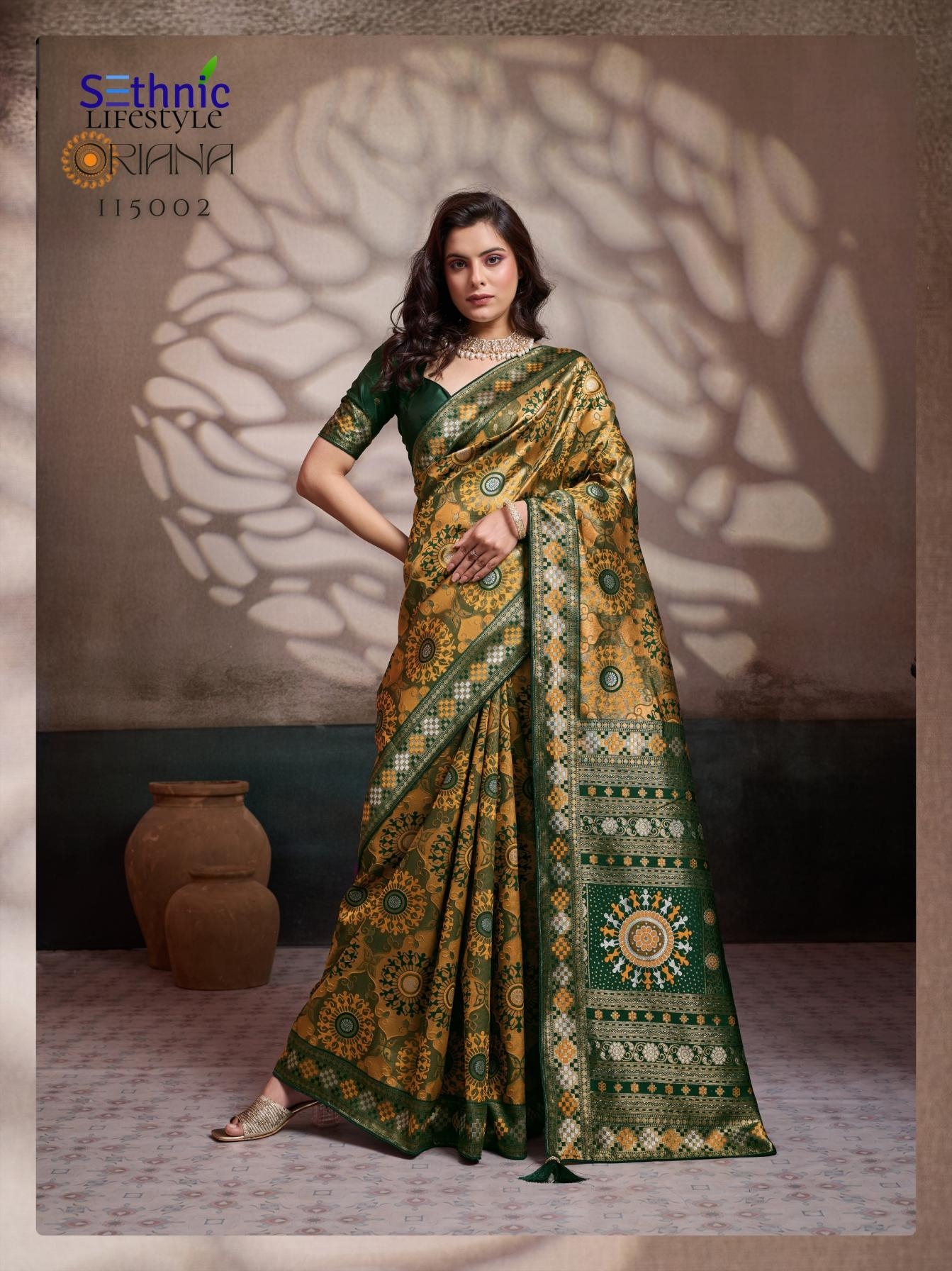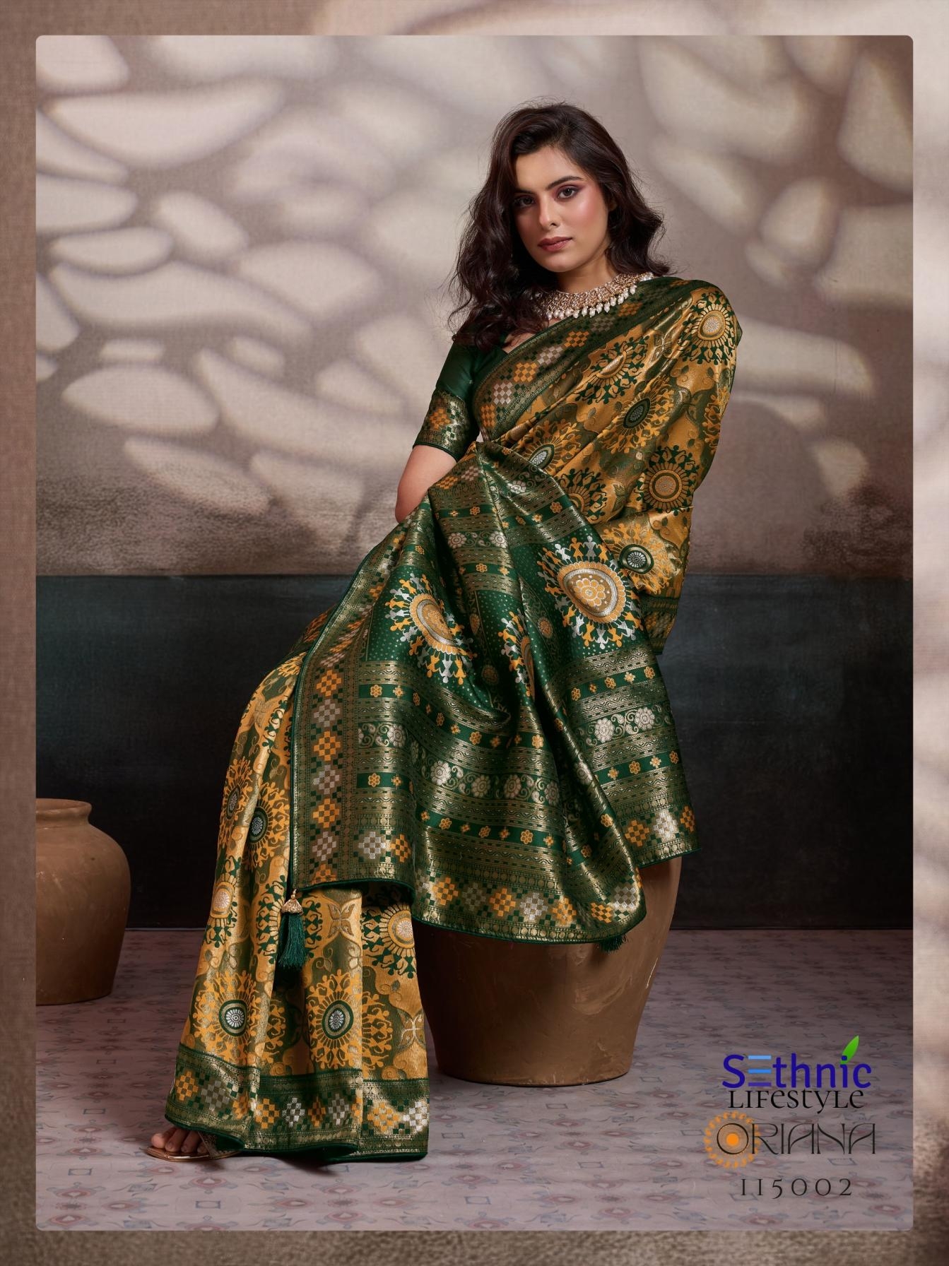 | Other Details: | Every weave in this collection is features intricate Meenakari artistry, a shimmering Rich Pallu, and the signature KONARK-inspired mandalas that define the heritage aesthetic. Finished with a couture blouse, delicate piping, and handcrafted tassels, Oriana is designed for the woman who finds luxury in the stories woven into her attire. Brand : Sethnic Lifetstyle Catalog Name : Oriana Series : 115001 TO 115006 Saree Fabric : Soft Silk Work : Zari, Meenakari Woven Blouse : Running with Sleeve Pattas Embellishment : Piping & Complimentary Tassels Rate : 899/- + 5% GST |