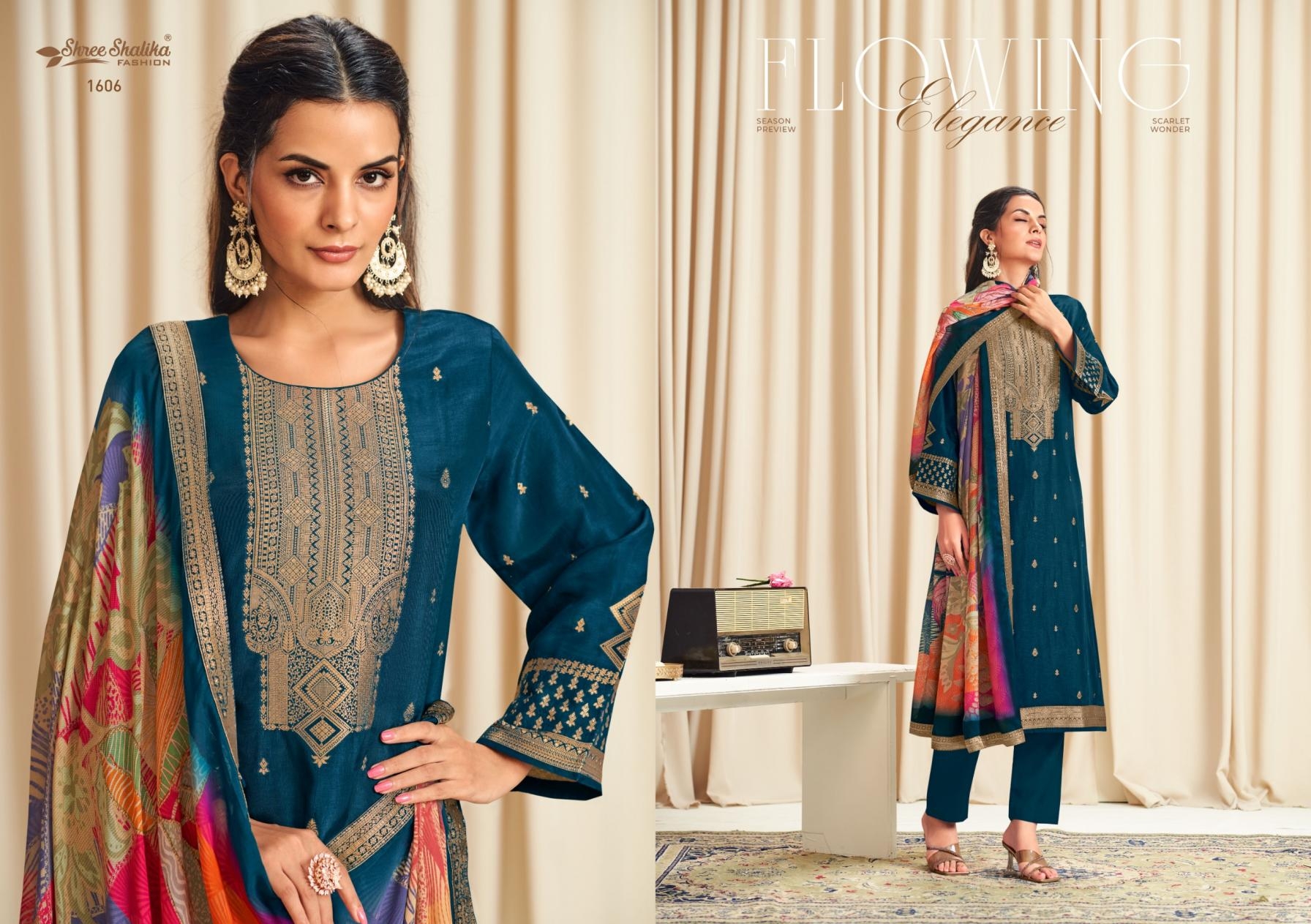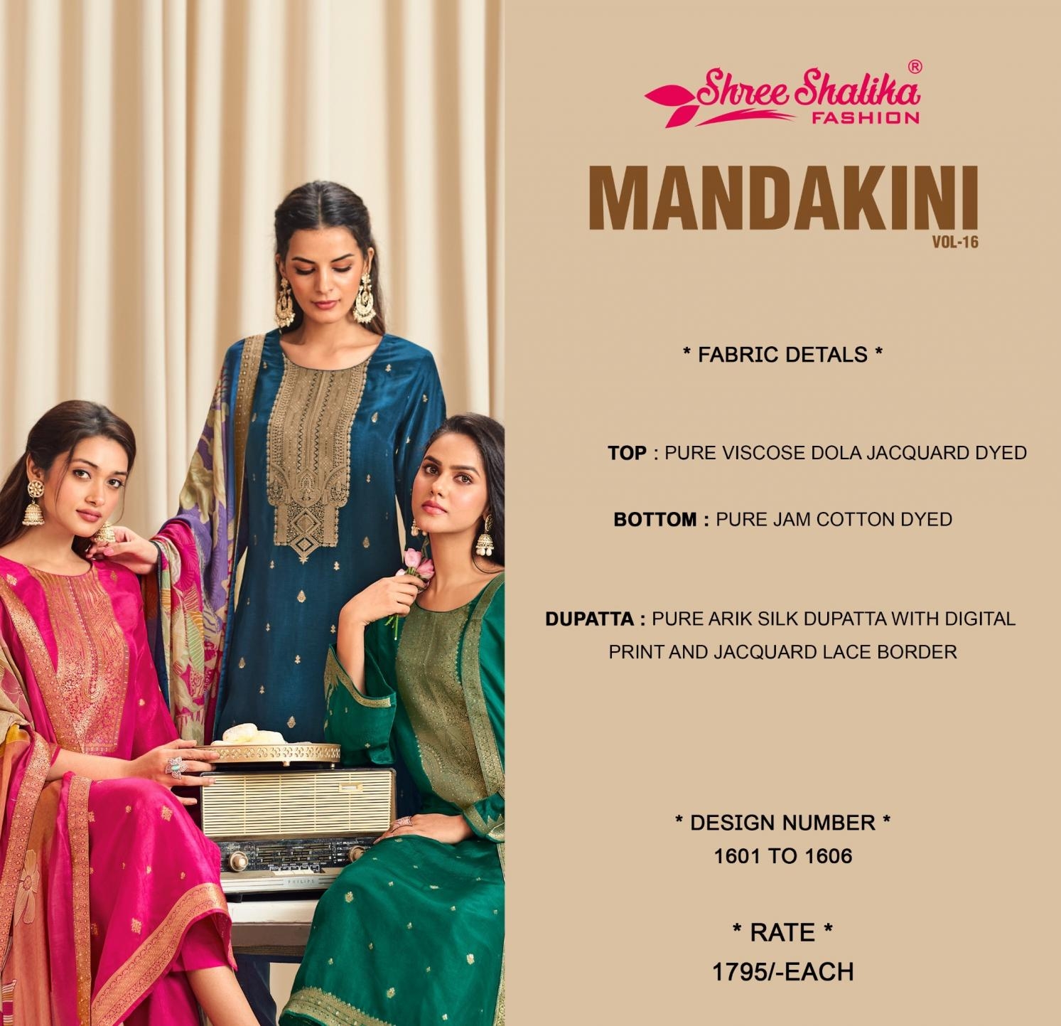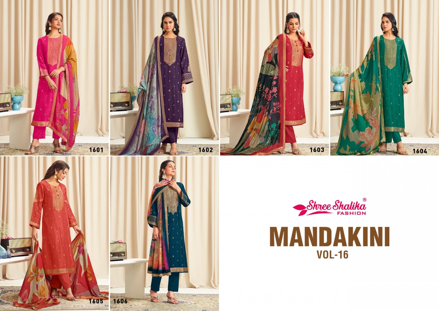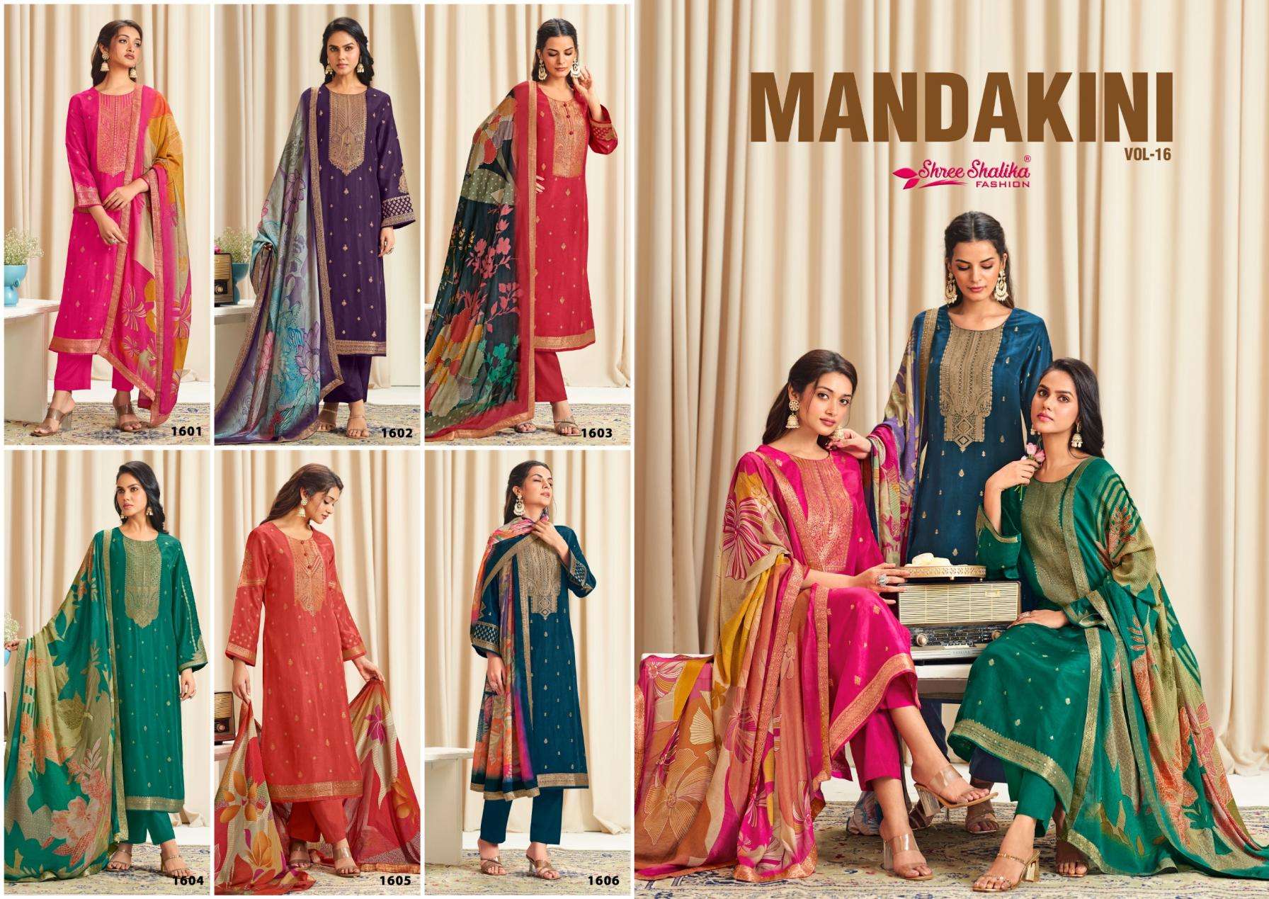 | Name: | Shree Shalika Mandakini Vol 16 Series 1601 To 1606 Viscose Dola Jacquard Classic Salwar Kameez In Wholesale Surat |