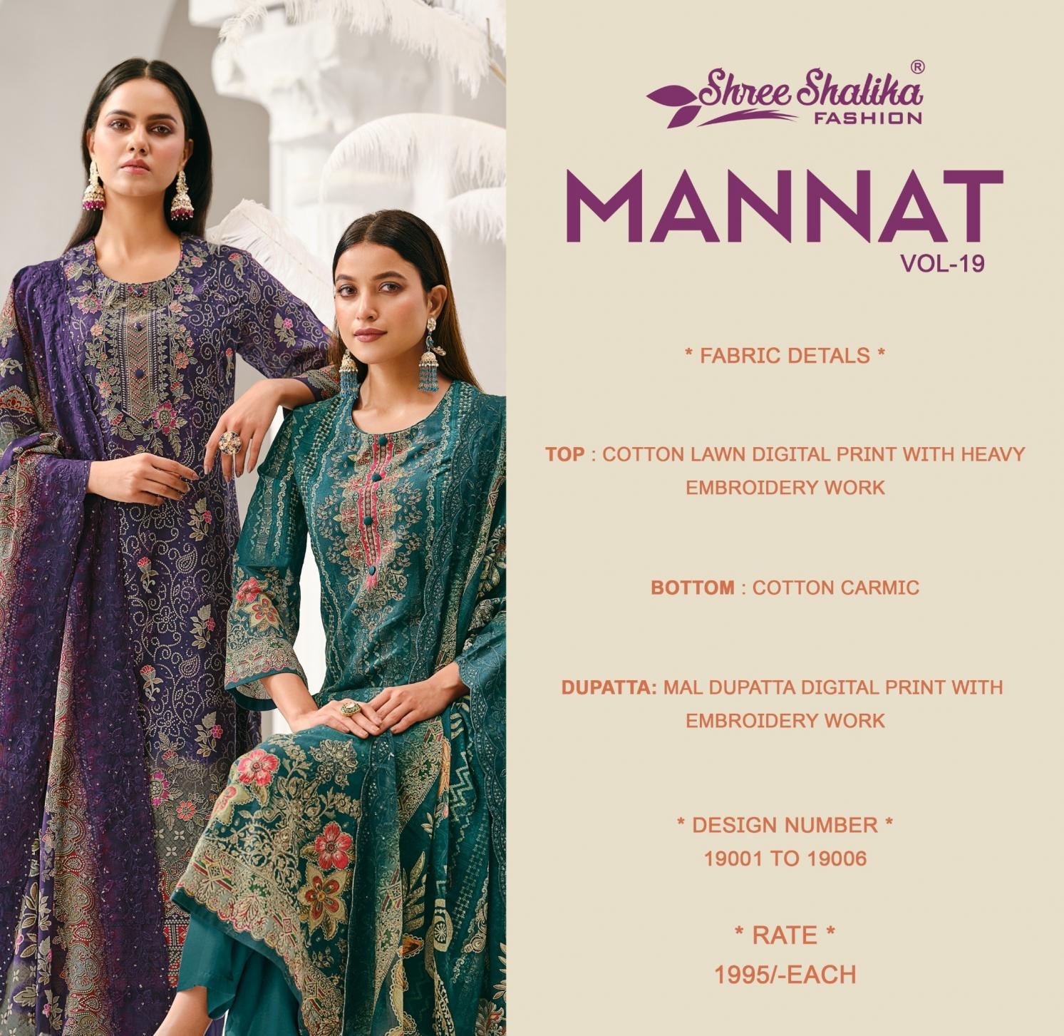 | Name: | Shree Shalika Mannat Vol 19 Series19001 To 19006 Lawn Cotton Trendy Salwar Kameez In Wholesale Surat |