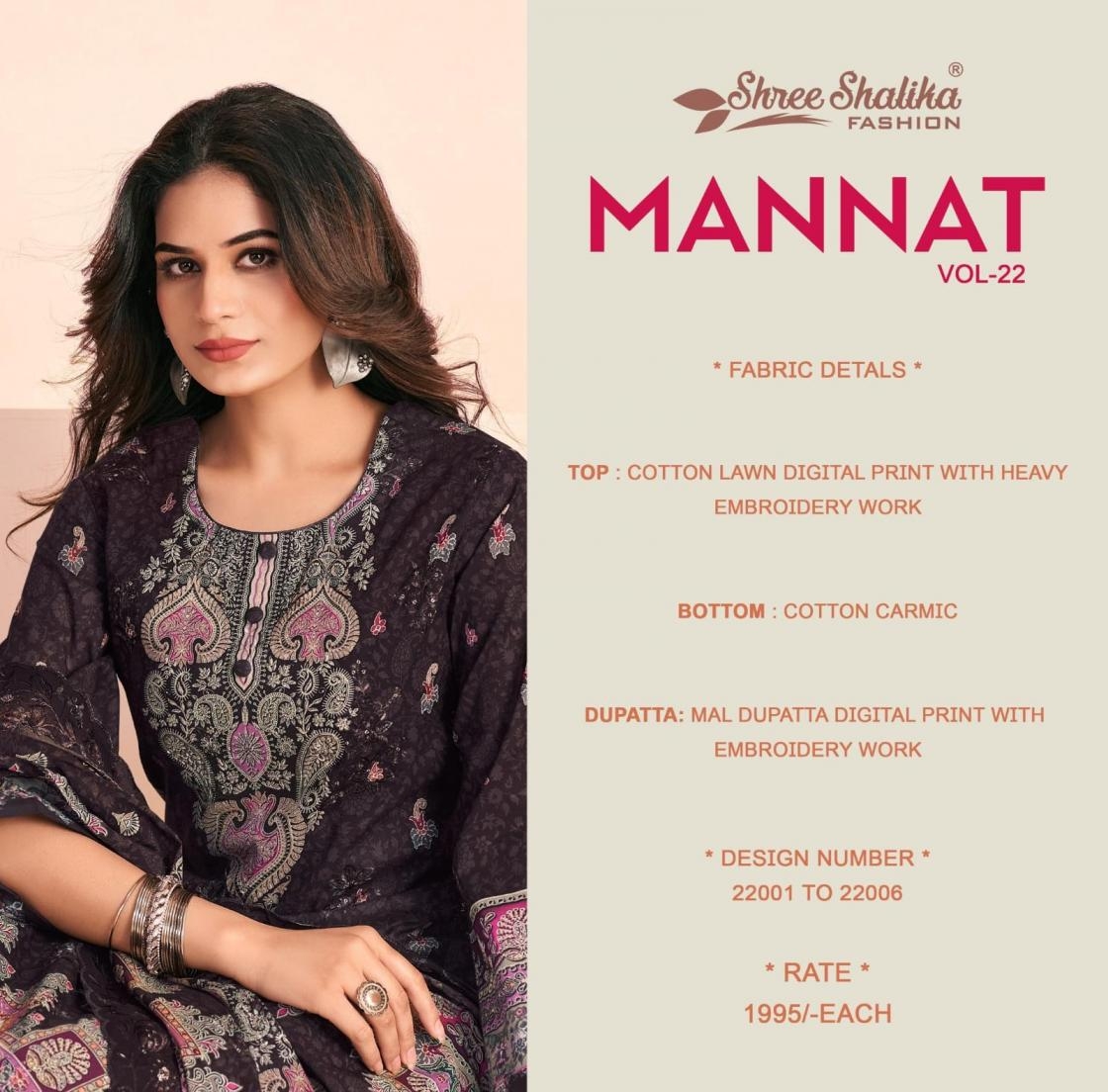 | Name: | Shree Shalika Mannat Vol 22 Series 22001-22006 Cotton Lawn Wholesale Suit |
