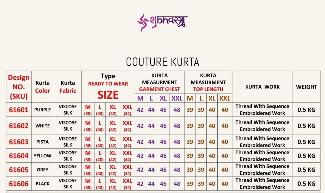 | Other Details: | 🕺 SHUBHVASTRA - NEW KURTA COLLOCTION 2026 🕺 🧿 COUTURE KURTA 🧿 💰 61601 to 61606 • RATE = 1300/- 💰 SIZE : M, L, XL, XXL 📏 PANT (BOTTOM) |
