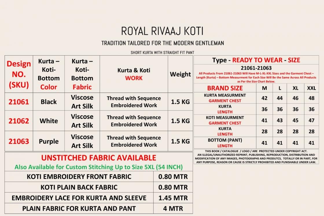 | Other Details: | 🕺 SHUBHVASTRA - NEW KURTA COLLOCTION 2025 🕺 🧿 ROYAL RIVAAJ KOTI 🧿 💰 21061 to 21063 - RATE = 2250/- 💰 SIZE : M, L, XL, XXL 📏 ---------------------------- UNSTITCHED FABRIC RATE - 1750/- |