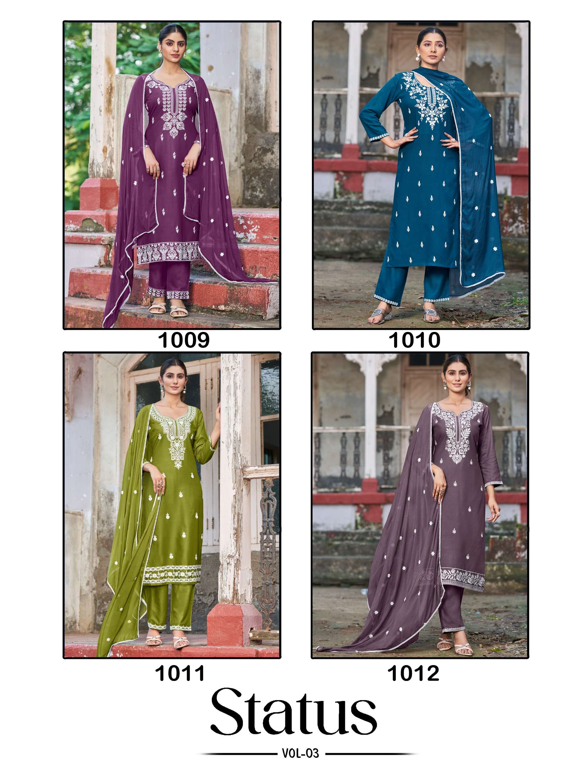 | Other Details: | NEW LAUNCH 🔥🔥 💃🏼 Status VoL-3 💃🏼 ✡️CATALOG NAME 🌹😍 Status VoL-3 😍🌹 ⚛️ Bottom Pant-Heavy Rayon with work ⚛️ Duppta-Nazmin with work ✡️ Size : M(38) L(40) XL(42) XXL(44) 3XL(46) ✡️ Designs:- 4 designs 💐 *SINGLE ➡️ 999/-➕ SINGLE & SET 💐💐 WISE BOTH AVAILABLE IN WHOLESALE RATE Dispatch - Ready |